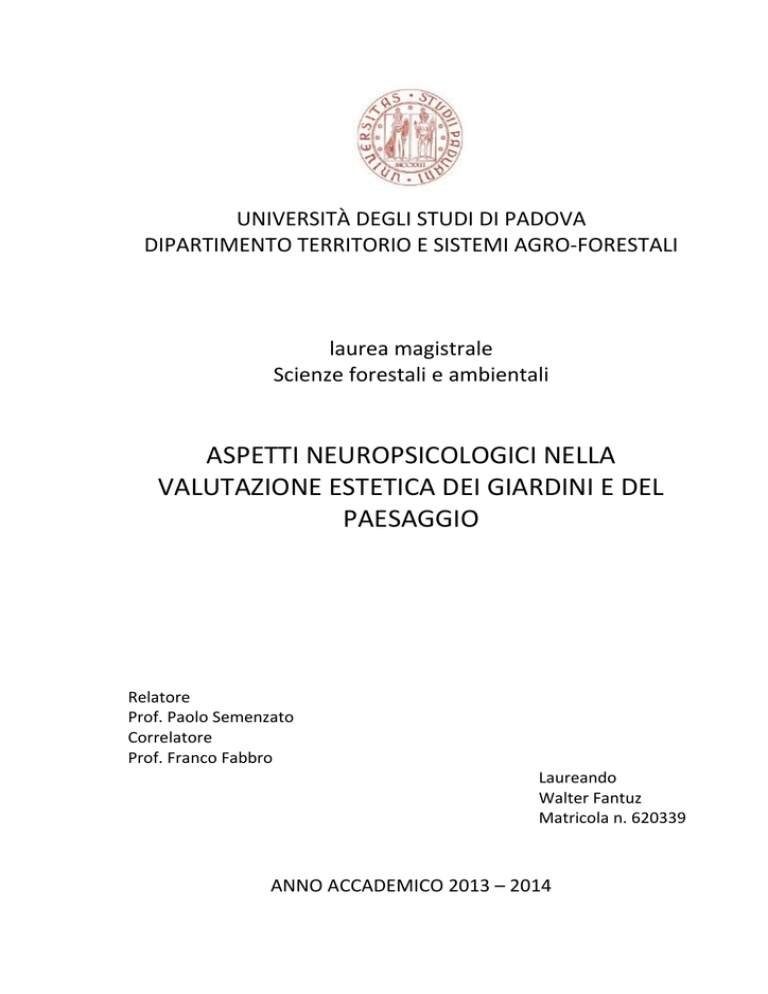 UNIVERSITÀ DEGLI STUDI DI PADOVA DIPARTIMENTO TERRITORIO E SISTEMI AGRO‐FORESTALI laurea magistrale Scienze forestali e ambientali ASPETTI NEUROPSICOLOGICI NELLA VALUTAZIONE ESTETICA DEI GIARDINI E DEL PAESAGGIO Relatore Prof. Paolo Semenzato Correlatore Prof. Franco Fabbro Laureando Walter Fantuz Matricola n. 620339 ANNO ACCADEMICO 2013 – 2014 Aspetti neuropsicologici nella valutazione estetica