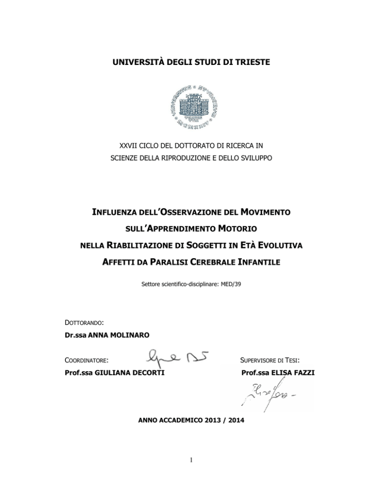 INTRODUZIONE UNIVERSITÀ DEGLI STUDI DI TRIESTE XXVII CICLO DEL DOTTORATO DI RICERCA IN SCIENZE DELLA RIPRODUZIONE E DELLO SVILUPPO INFLUENZA DELL’OSSERVAZIONE DEL MOVIMENTO SULL’APPRENDIMENTO MOTORIO NELLA RIABILITAZIONE DI SOGGETTI IN ETÀ EVOLUTIVA AFFETTI DA PARALISI CEREBRALE INFANTILE Settore scientifico-disciplinare: MED/39 DOTTORANDO: Dr.ssa ANNA MOLINARO COORDINATORE: SUPERVISORE DI TESI: Prof.ssa GIULIANA DECORTI Prof.ssa ELISA FAZZI ANNO ACCADEMICO 2013 / 2014 1 INTRODUZIONE INDICE INTRODUZIONE 1. NUOVI ORIENTAMENTI NELLA DEFINIZIONE, DIAGNOSI E CLASSIFICAZIONE DELLE PARALISI CEREBRALI INFANTILI 1.1 Definizione 1.2 Classificazione 1.3 Diagnosi 2. ATTUALITA’ E PROSPETTIVE NELLA RIABILITAZIONE DELLE PARALISI CEREBRALI INFANTILI 2.1 Raccomandazioni per la riabilitazione di bambini affetti da Paralisi Cerebrale Infantile 2.2 Stato dell’arte nella riabilitazione dell’arto superiore in bambini affetti da Paralisi Cerebrale Infantile 2.2.1 Constraint Induced Movement Therapy 2.2.2 Hand-Arm Bimanual Intensive Therapy 3. NEUROSCIENZE E RIABILITAZIONE: DAI NEURONI SPECCHIO ALLA PRATICA CLINICA 3.1 La scoperta dei neuroni mirror 3.2 I neuroni mirror nell’uomo 3.2.1 Studi neurofisiologici 3.2.2 Studi comportamentali 3.2.3 Studi neuroradiologici: anatomia del sistema dei neuroni specchio 3.2.4 La reciproca comprensione delle azioni e delle intenzioni 3.2.5 Lo sviluppo del sistema dei neuroni mirror nell’uomo 3.3 Il ruolo dei neuroni mirror nel processo di imitazione e di apprendimento 3.3.1 Imitazione di azioni già presenti nel repertorio motorio dell’osservatore 3.3.2 Osservazione delle azioni e apprendimento motorio 3.3.3 Coinvolgimento del circuito prefrontale nell’apprendimento 3.4 Applicazioni cliniche dei neuroni mirror: l’ Action Observation Treatment 3.4.1 Riabilitazione motoria dopo stroke 3.4.2 Morbo di Parkinson 3.4.3 Riabilitazione motoria dopo chirurgia ortopedica 3.5 Action Observation Treatment nelle Paralisi Cerebrali Infantili 2 INTRODUZIONE STUDIO PERSONALE 1. SCOPO DELLO STUDIO 2. MATERIALI E METODI 2.1 Disegno dello studio 2.2 Partecipanti 2.3 Tipo di intervento 2.3.1 Stimoli 2.3.2 Trattamento 2.4 Misure di outcome 2.4.1 Assisting Hand Assessment 2.4.2 Melbourne Assesment of Unilateral Upper Limb Function 2.4.3 AbilHand- Kids- Questionnaire 2.5 Risonanza Magnetica Funzionale 2.5.1 Studio fMRI su volontari sani 2.5.2 Analisi dei dati fMRI 2.6 Analisi Statistica 3. RISULTATI 3.1 Dati clinici e anamnestici dei soggetti con PCI 3.2 Valutazione delle abilità manuali 3.2.1 Assisting Hand Assessment 3.2.2 Melbourne Assesment of Unilateral Upper Limb Function 3.2.3 AbilHand- Kids- Questionnaire 3.3 Risonanza Magnetica Funzionale 3.4 Presentazione dei risultati preliminari 4. DISCUSSIONE 5. CONCLUSIONI BIBLIOGRAFIA 3 INTRODUZIONE INTRODUZIONE 4 INTRODUZIONE Questo progetto di ricerca è stato stimolato dall’enorme progresso verificatosi nel campo delle neuroscienze nel corso degli ultimi vent’anni e che ha comportato notevoli cambiamenti nella prassi riabilitativa in età evolutiva. Le nuove conoscenze in ambito neurofisiologico, neurobiologico, ma anche neuropsicologico e delle neuroscienze cognitive sui meccanismi del controllo e dell’apprendimento motorio hanno gettato le basi per interpretare in modo più efficace il percorso di recupero funzionale del paziente, in particolare in ambito neurologico. A queste nuove conoscenze si sono aggiunte le acquisizioni in ambito tecnologico e biomeccanico, come l’analisi del movimento, che hanno permesso la quantificazione obiettiva del comportamento motorio. Come per altri settori della riabilitazione neurologica, quindi, anche in età evolutiva vi è un urgente bisogno di programmi di riabilitazione con una forte base neurofisiologica, finalizzati alla formazione di compiti significativi. Una recente revisione della letteratura ha messo in evidenza dei dati allarmanti: dal 30 al 40% degli interventi riabilitativi nel bambino non ha un’efficacia dimostrata e circa un 20% è risultato inefficace, non necessario o addirittura dannoso (Novak, 2014). L’obiettivo attuale deve essere quindi quello di incrementare le conoscenze e la produzione di evidenze scientifiche spendibili nella pratica clinica, trasferendo le conoscenze dalle scienze di base alla costruzione di solidi razionali di intervento riabilitativi mirati e quindi più efficaci nel recupero funzionale. Gli studi sperimentali condotti nell’ultimo ventennio hanno radicalmente modificato la nostra visione del sistema motorio. In particolare l’identificazione dei neuroni mirror e l’esistenza del meccanismo di risonanza che essi codificano hanno dimostrato che tale sistema non svolge solo funzioni esecutive, ponendo le basi per una nuova interpretazione del concetto di riabilitazione del sistema motorio: questa infatti non implica più necessariamente l’esercizio di un movimento, condotto in maniera passiva o attiva, ma può avvalersi anche di nuove modalità. E’ noto da tempo che l’immaginazione motoria di una certa azione può migliorare l’esecuzione di quell’azione. Recentemente, diversi studi hanno dimostrato che l’osservazione sistematica di azioni quotidiane (Action Observation Treatment, AOT), può essere utile per migliorare le prestazioni motorie in soggetti adulti con esiti di stroke 5 INTRODUZIONE ischemico, affetti da morbo di Parkinson o sottoposti a chirurgia ortopedica (Buccino, 2014). Le basi neurofisiologiche che supportano l’AOT vanno ricercate nel reclutamento delle aree del sistema dei neuroni specchio durante l’osservazione di azioni eseguite da altri, come pure nel corso dell’immaginazione motoria e dell’apprendimento per imitazione (Buccino et al., 2012). Sulla base di queste premesse, abbiamo ipotizzato un ruolo dell’ Action Observation Treatment (AOT) anche nella riabilitazione di pazienti in età evolutiva, in particolare nel migliorare le funzioni motorie dell’arto superiore in bambini con Para