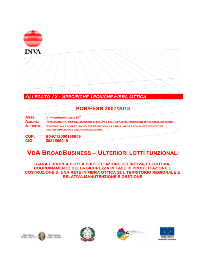 ALLEGATO T2 - SPECIFICHE TECNICHE FIBRA OTTICA POR/FESR 2007/2013 ASSE: AZIONE: ATTIVITÀ: III - PROMOZIONE DELLE ICT POTENZIAMENTO, RAZIONALIZZAZIONE E SVILUPPO DELL'INFRASTRUTTURAZIONE DI TELECOMUNICAZIONE SOSTEGNO ALLA COPERTURA DEL TERRITORIO CON LA BANDA LARGA E CON NUOVE TECNOLOGIE DELL’INFORMAZIONE E DELLA COMUNICAZIONE. CUP: CIG: B54C12000100009 5081565019 VDA BROADBUSINESS – ULTERIORI LOTTI FUNZIONALI GARA EUROPEA PER LA PROGETTAZIONE DEFINITIVA, ESECUTIVA, COORDINAMENTO DELLA SICUREZZA IN FASE DI PROGETTAZIONE E COSTRUZIONE DI UNA RETE IN FIBRA OTTICA SUL TERRITORIO REGIONALE E RELATIVA MANUTENZIONE E GESTIONE 1. INDICE 1. INDICE ........................................................................................................................................................... 2 2. PREMESSA ................................................................................................................................................... 3 3. INTRODUZIONE ........................................................................................................................................... 3 4. CARATTERISTICHE DEI CAVI..................................................................................................................... 3 4.1. Cavo a 12 fibre ottiche ..................................................................................................................... 3 4.1.1. Sigla ......................................................................................................................................... 3 4.1.2. Potenzialità .............................................................................................................................. 3 4.1.3. Costituzione ............................................................................................................................. 3 4.1.4. Dati dimensionali e di peso ...................................................................................................... 4 4.1.5. Caratteristiche meccaniche e Termiche .................................................................................. 4 4.1.6. Schema colorato ...................................................................................................................... 5 4.1.7. Schema costruttivo .................................................................................................................. 5 4.2. Cavo a 24 fibre ottiche ..................................................................................................................... 6 4.2.1. Sigla ......................................................................................................................................... 6 4.2.2. Potenzialità .............................................................................................................................. 6 4.2.3. Costituzione ............................................................................................................................. 6 4.2.4. Dati dimensionali e di peso ...................................................................................................... 7 4.2.5. Caratteristiche meccaniche e Termiche .................................................................................. 7 4.2.6. Schema colorato ...................................................................................................................... 7 4.2.7. Schema costruttivo .................................................................................................................. 7 4.3. Cavo a 48 fibre ottiche ..................................................................................................................... 8 4.3.1. Sigla ......................................................................................................................................... 8 4.3.2. Potenzialità .............................................................................................................................. 8 4.3.3. Costituzione ............................................................................................................................. 8 4.3.4. Dati dimensionali e di peso ...................................................................................................... 8 4.3.5. Caratteristiche meccaniche e Termiche .................................................................................. 9 4.3.6. Schema colorato ...................................................................................................................... 9 4.3.7. Schema costruttivo .................................................................................................................. 9 4.4. CAVO AUTOPORTANTE PER POSA SU PALIFICATA CON 24 O 48 FIBRE ottiche ................... 9 4.4.1. Sigla ......................................................................................................................................... 9 4.4.2. Potenzialità ............................................................................................................................ 10 4.4.3. Costituzione ........................................................................................................................... 10 4.4.4. Dati dimensionali e di peso .................................................................................................... 10 4.4.5. Caratteristiche meccaniche e Termiche ................................................................................ 10 4.4.6. Schema colorato .................................................................................................................... 11 4.4.7. Schema costruttivo ................................................................................................................ 11 4.4.8. Esempio di schema costruttivo .............................................................................................. 11 4.5. Fibre ottiche ..
