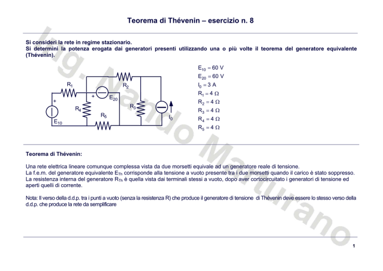 Teorema di Thévenin – esercizio n. 8 Si consideri la rete in regime stazionario. Si determini la potenza erogata dai generatori presenti utilizzando una o più volte il teorema del generatore equivalente (Thévenin). E10 = 60 V E20 = 60 V R1 I0 = 3 A R2 + + R2 = 4 Ω R3 R4 R5 E10 R1 = 4 Ω E20 R3 = 4 Ω I0 R4 = 4 Ω R5 = 4 Ω Teorema di Thévenin: Una rete elettrica lineare comunque complessa vista da due morsetti equivale ad un generatore reale di tensione. La f.e.m. del generatore equivalente ETh corrisponde alla tensione a vuoto presente tra i due morsetti quando il carico è stato soppresso. La resistenza interna del generatore RTh è quella vista dai terminali stessi a vuoto, dopo aver cortocircuitato i generatori di tensione ed aperti quelli di corrente. Nota: Il verso della d.d.p. tra i punti a vuoto (senza la resistenza R) che produce il generatore di tensione di Thévenin deve essere lo stesso verso della d.d.p. che produce la rete da semplificare 1 Teorema di Thévenin – esercizio n. 8 Verrà utilizzata la convezione dell’utilizzatore Si stabiliscano i nodi del circuito. I nodi presenti nel circuito risultano essere 4. C R1 Teorema del generatore equivalente applicato ad R3. Per conoscere la potenza erogata dal generatore di corrente I0 occorre determinare la d.d.p. VCD ai suoi capi e quindi è necessario determinare la corrente I3 che attraversa la resistenza R3. + + I3 E20 R3 R4 R5 E10 VCD = R3 ⋅ I3 R2 B A D D I0 Circuito per il calcolo di RTh: La resistenza RTh vista da i terminali C e D è costituita dalla resistenza R2. C R1 R2 B RTh = RCD = R2 = 4 Ω R4 R5 A D D 2 Teorema di Thévenin – esercizio n. 8 Circuito per il calcolo di ETh = VDC: C R1 R2 B + + Per calcolare VCD si utilizza la strada costituita dalla resistenza R2 in cui circola la corrente I0 ed il generatore E20: E20 ETh = VCD = R2 ⋅ I0 + E20 = 4 ⋅ 3 + 60 = 72 V I0 R4 R5 E10 D A D Circuito elementare di Thévenin: Calcolo della corrente I3: C I3 = RTh R3 + ETh=VCD Calcolo della generatore I0: I3 VCD ETh 72 = = = 9,00 A RTh + R3 RCD + R3 4 + 4 potenza erogata dal PI0 = VCD ⋅ I0 = R3 ⋅ I3 ⋅ I0 = 4 ⋅ 9 ⋅ 3 = 108 W D 3 Teorema di Thévenin – esercizio n. 8 C Teorema del generatore equivalente applicato al ramo R1 E10. R1 Per conoscere la potenza erogata dal generatore di corrente E10 occorre determinare la corrente che l’attraversa e quindi è necessario determinare la corrente I1 che interessa la resistenza R1. + + I1 I3 E20 R3 R4 R5 E10 A D D I0 Per una migliore comprensione su come La resistenza RTh vista da i terminali B e A è costituita dalla resistenza R4 in parallelo calcolare la RTh si ridisegna il circuito: con la resistenza R5. C R ⋅R 4⋅4 RTh = RBA = 4 5 = =2Ω R 4 + R5 4 + 4 R2 R Circuito per il calcolo di RTh: C R2 B R2 B 3 R3 R4 R5 A B B B B R5 R4 A 4 Teorema di Thévenin – esercizio n. 8 Circuito per il calcolo di ETh = VBA: Per calcolare VBA occorre la corrente I4 che attraversa la resistenza R4. Tale corrente può essere facilmente determinata poiché è nota la d.d.p. VBD = E20: C R2 B I4 + E20 A I4 = R3 R4 R5 D E20 60 = = 7,5 A R 4 + R5 4 + 4 I0 D ETh = VBA = R 4 ⋅ I4 = 4 ⋅ 7,5 = 30 V Circuito elementare di Thévenin: Calcolo della corrente I1: B RTh R1 + I1 I1 = E10 − ETh 60 − 30 = =5 A RTh + R1 2+4 Calcolo della potenza generatore E10: erogata dal PE10 = E10 ⋅ I1 = 60 ⋅ 5 = 300 W + E10 ETh=VCD A 5 Teorema di Thévenin – esercizio n. 8 I2 Calcolo della corrente I20 che interessa il generatore E20. Per conoscere la potenza erogata dal generatore di tensione E20 occorre determinare la corrente che l’attraversa I20. In questo caso non occorre riapplicare il teorema del generatore equivalente, ma può essere seguita la seguente strada: R1 + R2 B + I1 E10 C I3 E20 I20 R4 A I4 R3 R5 D D I0 I5 Calcolo della corrente I4: E − R1 ⋅ I1 60 − 4 ⋅ 5 V = = 10 A I4 = BA = 10 R4 R4 4 Calcolo della corrente I2 attraverso l’equilibrio al nodo C: I2 = I3 − I0 = 9 − 3 = 6 A Calcolo della corrente I20 attraverso l’equilibrio al nodo B: I20 = I4 + I2 − I1 = 10 + 6 − 5 = 11 A Calcolo della potenza erogata dal generatore E20: PE20 = E20 ⋅ I20 = 60 ⋅ 11 = 660 W In conclusione le correnti nella rete sono: I0 = 3 A I1 = 5 A Calcolo della corrente I5 attraverso l’equilibrio al nodo A: I5 = I4 − I1 = 10 − 5 = 5 A I2 = 6 A I3 = 9 A I4 = 10 A I5 = 5 A I20 = 11 A 6 Teorema di Thévenin – esercizio n. 8 Riepilogo delle potenze erogate dai generatori: Calcolo delle potenze assorbite dalle resistenze; PI01 = VCD ⋅ I0 = 36 ⋅ 3,00 = 108 W PR1 = R1 ⋅ I12 = 4 ⋅ 52 = 100 W PE10 = E10 ⋅ I1 = 60 ⋅ 5 = 300 W PR2 = R2 ⋅ I22 = 4 ⋅ 6,002 = 144 W PE20 = E20 ⋅ I20 = 60 ⋅ 11 = 660 W PR3 = R3 ⋅ I3 2 = 4 ⋅ 9,002 = 324 W PR4 = R 4 ⋅ I42 = 4 ⋅ 102 = 400 W PR5 = R5 ⋅ I5 2 = 4 ⋅ 52 = 100 W Verifica potenze erogate ed assorbite: PI01 + PE10 + PE20 = 108 + 300 + 660 = 1068 W PRT = PR1 + PR2 + PR3 + PR4 + PR5 = 100 + 144 + 324 + 400 + 100 = 1068 W 7