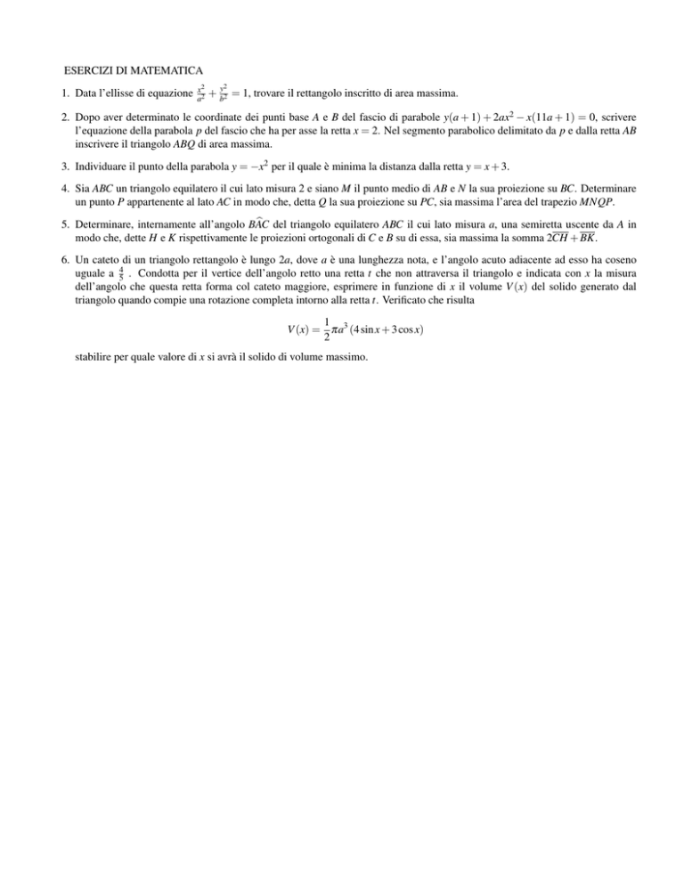 ESERCIZI DI MATEMATICA 1. Data l’ellisse di equazione x2 a2 2 + by2 = 1, trovare il rettangolo inscritto di area massima. 2. Dopo aver determinato le coordinate dei punti base A e B del fascio di parabole y(a + 1) + 2ax2 − x(11a + 1) = 0, scrivere l’equazione della parabola p del fascio che ha per asse la retta x = 2. Nel segmento parabolico delimitato da p e dalla retta AB inscrivere il triangolo ABQ di area massima. 3. Individuare il punto della parabola y = −x2 per il quale è minima la distanza dalla retta y = x + 3. 4. Sia ABC un triangolo equilatero il cui lato misura 2 e siano M il punto medio di AB e N la sua proiezione su BC. Determinare un punto P appartenente al lato AC in modo che, detta Q la sua proiezione su PC, sia massima l’area del trapezio MNQP. b del triangolo equilatero ABC il cui lato misura a, una semiretta uscente da A in 5. Determinare, internamente all’angolo BAC modo che, dette H e K rispettivamente le proiezioni ortogonali di C e B su di essa, sia massima la somma 2CH + BK. 6. Un cateto di un triangolo rettangolo è lungo 2a, dove a è una lunghezza nota, e l’angolo acuto adiacente ad esso ha coseno uguale a 54 . Condotta per il vertice dell’angolo retto una retta t che non attraversa il triangolo e indicata con x la misura dell’angolo che questa retta forma col cateto maggiore, esprimere in funzione di x il volume V (x) del solido generato dal triangolo quando compie una rotazione completa intorno alla retta t. Verificato che risulta 1 V (x) = πa3 (4 sin x + 3 cos x) 2 stabilire per quale valore di x si avrà il solido di volume massimo.