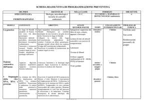 PROGRAMMA DEL CORSO DI BIOLOGIA,MICROBIOLOGIA E TECNOLOGIE DI CONTROLLO SANITARIO CLASSE 4 D ANNO SCOLASTICO 2014-2015 Proff. ELENA ZACCHIA , RAFFAELE FIORINI CONTENUTI MODULI UNITÀ DIDATTICHE MODULO 1 Conoscere i principali BATTERI DI INTERESSE batteri di interesse SANITARIO sanitari . O R E CONOSCENZE / COMPETENZE Conoscere le principali patologie causate da batteri e i 20 meccanismi dell’azione patogena. STRUMENTI E METODI Libro di testo Supporti multimediali Lezioni frontali Laboratorio MODULO 2 LA GENETICA Il genoma in azione . La regolazione genica. 10 Conoscere e saper spiegare il ruolo del DNA e degli RNA. Conoscere le modalità di trasmissione dei caratteri ereditari. Libro di testo Supporti multimediali Lezioni frontali MODULO 3 LE BIOTECNOLOGIE Tecnologia del DNA ricombinante. Organismi modificati geneticamente. Conoscere e saper descrivere le tappe della tecnica del DNA 10 ricombinante. Conoscere le principali applicazioni di tale tecnica Libro di testo Supporti multimediali Lezioni frontali Laboratorio MODULO 4 BIOTECNOLOGIE IN INGLESE Nucleic acids: structure and function . Bioinformatics. DNA and DNA manipulation . Cloning, transformation and amplification in E. 10 coli . Software. Laboratory : PCR-REElectrophoresis. Approfondimento delle Supporti conoscenze sulle biotecnologie. multimediali Rafforzamento della Laboratorio conoscenza della lingua inglese. LABORATORIO Analisi microbiologiche di campioni di acqua, aria, suolo, alimenti. Analisi del sangue e delle urine. COLLEGAMENTI Chimica VERIFICHE Prove scritte Colloquio orale. Fisica Chimica La PCR Amplificazione del DNA Enzimi di restrizione Elettroforesi del DNA Chimica Fisica PCR RE Electrophoresis Prove scritte Colloquio orale. Prove scritte Colloquio orale. Prove pratiche di laboratorio Test in lingua inglese. MODULO 5 I VIRUS Struttura dei virus e duplicazione dell’acido nucleico virale. La classificazione dei virus. Patologie causate da virus. Conoscere i criteri per la classificazione dei virus. 15 Conoscere e saper descrivere le modalità di replicazione dei virus. Libro di testo Supporti multimediali Lezioni frontali MODULO 6 SICUREZZA AMBIENTI DI LAVORO E PREVENZIONE MICROBIOLOGICA. Integrazione del programma svolto negli anni precedenti Operazioni di base in laboratorio. Norme di sicurezza e prevenzione. Procedure di smaltimento dei rifiuti. Saper riconoscere, analizzare i fattori di rischio presenti in un 15 laboratorio microbiologico e saper assumere comportamenti atti ad annullare tali rischi. Libro di testo Supporti multimediali Lezioni frontali Laboratorio Classificazione del rischio biologico. Lettura ed interpretazione delle schede di sicurezza Smaltimento dei rifiuti di laboratorio. MODULO 7 LABORATORIO DI MICROBIOLOGIA. Integrazione del programma di microbiologia svolto negli anni precedenti. Saper allestire colture batteriche. Saper effettuare analisi microbiologiche di campioni di 30 acqua, aria, suolo, alimenti. Libro di testo Supporti multimediali Lezioni frontali Visite guidate Uscite didattiche Laboratorio Allestimento di colture batteriche. Preparazione di terreni di coltura. Tecniche di semina . Riconoscimento delle principali specie batteriche. Tecniche di analisi microbiologiche. Analisi microbiologiche di campioni di acqua, aria, suolo, alimenti. Chimica Prove scritte Colloquio orale. . Prove scritte Colloquio orale. Prove pratiche di laboratorio Chimica Fisica Prove scritte Colloquio orale. Prove pratiche di laboratorio Libri di testo: Fabio Fanti Biologia, microbiologia e biotecnologie (Microrganismi, ambiente e salute) Fabio Fanti Biologia, microbiologia e biotecnologie (Laboratorio di microbiologia) D. Sadava- H.Craig Heller- Gordon H.Orians- William K.Purves- David M. Hillis Biologia.blu Le basi molecolari della vita e dell’evoluzione.