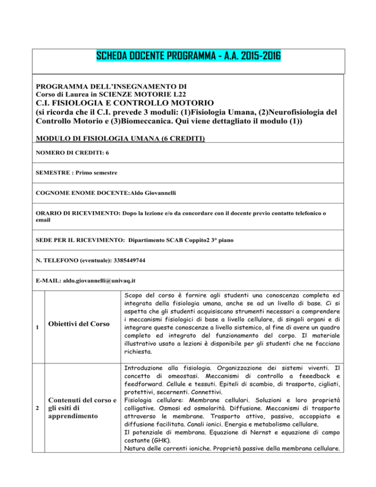SCHEDA DOCENTE PROGRAMMA - A.A. 2015-2016 PROGRAMMA DELL’INSEGNAMENTO DI Corso di Laurea in SCIENZE MOTORIE L22 C.I. FISIOLOGIA E CONTROLLO MOTORIO (si ricorda che il C.I. prevede 3 moduli: (1)Fisiologia Umana, (2)Neurofisiologia del Controllo Motorio e (3)Biomeccanica. Qui viene dettagliato il modulo (1)) MODULO DI FISIOLOGIA UMANA (6 CREDITI) NOMERO DI CREDITI: 6 SEMESTRE : Primo semestre COGNOME ENOME DOCENTE:Aldo Giovannelli ORARIO DI RICEVIMENTO: Dopo la lezione e/o da concordare con il docente previo contatto telefonico o email SEDE PER IL RICEVIMENTO: Dipartimento SCAB Coppito2 3° piano N. TELEFONO (eventuale): 3385449744 E-MAIL: [email protected] 1 2 Obiettivi del Corso Scopo del corso è fornire agli studenti una conoscenza completa ed integrata della fisiologia umana, anche se ad un livello di base. Ci si aspetta che gli studenti acquisiscano strumenti necessari a comprendere i meccanismi fisiologici di base a livello cellulare, di singoli organi e di integrare queste conoscenze a livello sistemico, al fine di avere un quadro completo ed integrato del funzionamento del corpo. Il materiale illustrativo usato a lezioni è disponibile per gli studenti che ne facciano richiesta. Contenuti del corso e gli esiti di apprendimento Introduzione alla fisiologia. Organizzazione dei sistemi viventi. Il concetto di omeostasi. Meccanismi di controllo a feeedback e feedforward. Cellule e tessuti. Epiteli di scambio, di trasporto, cigliati, protettivi, secernenti. Connettivi. Fisiologia cellulare: Membrane cellulari. Soluzioni e loro proprietà colligative. Osmosi ed osmolarità. Diffusione. Meccanismi di trasporto attraverso le membrane. Trasporto attivo, passivo, accoppiato e diffusione facilitata. Canali ionici. Energia e metabolismo cellulare. Il potenziale di membrana. Equazione di Nernst e equazione di campo costante (GHK). Natura delle correnti ioniche. Proprietà passive della membrana cellulare. Conduzione passiva dei segnali elettrici. Il potenziale di azione. Conduzione del potenziale di azione. Modalità di trasmissione e codificazione delle informazioni. Comunicazione, integrazione, omeostasi. Comunicazione sinaptica, paracrina ed endocrina. Recettori e trasduzione di segnali. Vie riflesse nervose, endocrine, neuroendocrine. Sinapsi chimiche e sinapsi elettriche. Ultrastruttura delle sinapsi. Recettori sinaptici ed extrasinaptici. Neurotrasmettitori e loro recettori di membrana. Recettori ionotropi e metabotropi, Plasticità sinaptica. Potenziale del recettore sensoriale. Introduzione al sistema nervoso: Anatomia funzionale. Sistema nervoso centrale e periferico. Barriera ematoencefalica. Organizzazione anatomo-funzionale della corteccia cerebrale e del midollo spinale. Strutture sottocorticali: talamo, ipotalamo, sistema limbico e gangli della base. Cervelletto. Metodi di studio del SNC in vivo. Lateralizzazione delle funzioni cerebrali. Ciclo sonno veglia. Cenni sulle funzioni superiori del SNC. Neurotrasmettitori e neuromodulatori nel SNC. Sistema nervoso autonomo. Centri di controllo ipotalamici e troncoencefalici. Sistema nervoso periferico. Organizzazione anatomo funzionale del simpatico e del parasimpatico. Recettori alfa e beta adrenergici. Recettori colinergici. Sistema nervoso somatico. Sistema endocrino: Gli ormoni come molecole di segnale. Funzioni endocrine dell’ipotalamo, ipofisi, ghiandole surrenali, tiroide, paratiroidi, pancreas e gonadi. Proprietà generali dei sistemi sensoriali. Potenziale recettore. Tipologie di recettori sensoriali. Organizzazione delle vie sensoriali. Campi ricettivi. Codificazione della durata e della intensità dello stimolo. Recettori fasici e tonici. Percezione. Sensi somatici: tatto, dolore e temperatura. Vie di trasmissione e modulazione degli stimoli nocicettivi. Corteccia somatosensoriale (homunculus) Sensi chimici. Visione. Organizzazione anatomofunzionale della retina. Visione scotopica e fototopica. Bastoncelli, coni e modalità di trasduzione dello stimolo luminoso. Udito e senso dell’equilibrio. Trasduzione dello stimolo acustico. Orecchio interno. Codifica dell’intensità e della frequenza del suono. Sistema vestibolare: sacculo, utricolo e canali semicircolari. Proiezioni ai nuclei vestibolari troncoencefalici. Riflesso vestibolo-oculare. Il sistema muscolare: muscolo scheletrico, cardiaco e liscio. Struttura fine del muscolo scheletrico. Miofibrille e sistema dei tubuli trasversi. Organizzazione e proteine del saarcomero. Distrofina. La sinapsi neuromuscolare. Basi biochimiche e strutturali della contrazione muscolare nel muscolo scheletrico. Accoppiamento elettromeccanico. Miofibrille e matrice extracellulare: sistema di trasmissione della forza. Cellule satelliti e fibre muscolari. Metabolismo energetico e termodinamica del lavoro muscolare. Energetica del lavoro muscolare. Classificazione biochimica e funzionale delle fibre muscolari (da ossidative alle glicolitiche, da lente a veloci con continuità). Scossa singola, sommazione e tetano muscolare. Unità motorie. Contrazione isometrica ed isotonica. Cenni sull’organizzazione del controllo nervoso del movimento. Basi biochimiche e strutturali della contrazione muscolare nel muscolo liscio. Accoppiamento elettromeccanico nel muscolo liscio. Controllo nervoso e umorale del muscolo liscio. Fisiologia del sistema cardiovascolare: Anatomia funzionale del cuore e della circolazione. Cenni di biofisica e di dinamica dei liquidi. Flusso. Legge di Poiseuille. Equazione di continuità. Circolo sistemico e circolo polmonare. Richiami di anatomia del cuore. Struttura ed accoppiamento elettromeccanico del muscolo cardiaco. Potenziale di azione del miocardio e sue conseguenze. Miocardio di conduzione. Autoritmicità cardiaca e controllo nervoso della frequenza cardiaca. Contrazione del muscolo cardiaco. Attività elettrica del miocardio. ECG. Ciclo cardiaco. Gittata cardiaca. Sistema arterioso e venoso. Controllo della pressione artriosa. Riflesso barocettivo. Capillari e lin