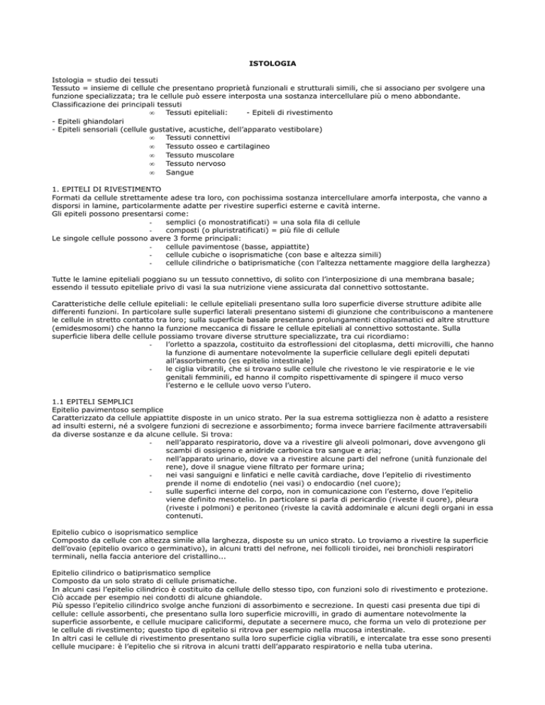 ISTOLOGIA Istologia = studio dei tessuti Tessuto = insieme di cellule che presentano proprietà funzionali e strutturali simili, che si associano per svolgere una funzione specializzata; tra le cellule può essere interposta una sostanza intercellulare più o meno abbondante. Classificazione dei principali tessuti • Tessuti epiteliali: - Epiteli di rivestimento - Epiteli ghiandolari - Epiteli sensoriali (cellule gustative, acustiche, dell’apparato vestibolare) • Tessuti connettivi • Tessuto osseo e cartilagineo • Tessuto muscolare • Tessuto nervoso • Sangue 1. EPITELI DI RIVESTIMENTO Formati da cellule strettamente adese tra loro, con pochissima sostanza intercellulare amorfa interposta, che vanno a disporsi in lamine, particolarmente adatte per rivestire superfici esterne e cavità interne. Gli epiteli possono presentarsi come: semplici (o monostratificati) = una sola fila di cellule composti (o pluristratificati) = più file di cellule Le singole cellule possono avere 3 forme principali: cellule pavimentose (basse, appiattite) cellule cubiche o isoprismatiche (con base e altezza simili) cellule cilindriche o batiprismatiche (con l’altezza nettamente maggiore della larghezza) Tutte le lamine epiteliali poggiano su un tessuto connettivo, di solito con l’interposizione di una membrana basale; essendo il tessuto epiteliale privo di vasi la sua nutrizione viene assicurata dal connettivo sottostante. Caratteristiche delle cellule epiteliali: le cellule epiteliali presentano sulla loro superficie diverse strutture adibite alle differenti funzioni. In particolare sulle superfici laterali presentano sistemi di giunzione che contribuiscono a mantenere le cellule in stretto contatto tra loro; sulla superficie basale presentano prolungamenti citoplasmatici ed altre strutture (emidesmosomi) che hanno la funzione meccanica di fissare le cellule epiteliali al connettivo sottostante. Sulla superficie libera delle cellule possiamo trovare diverse strutture specializzate, tra cui ricordiamo: l’orletto a spazzola, costituito da estroflessioni del citoplasma, detti microvilli, che hanno la funzione di aumentare notevolmente la superficie cellulare degli epiteli deputati all’assorbimento (es epitelio intestinale) le ciglia vibratili, che si trovano sulle cellule che rivestono le vie respiratorie e le vie genitali femminili, ed hanno il compito rispettivamente di spingere il muco verso l’esterno e le cellule uovo verso l’utero. 1.1 EPITELI SEMPLICI Epitelio pavimentoso semplice Caratterizzato da cellule appiattite disposte in un unico strato. Per la sua estrema sottigliezza non è adatto a resistere ad insulti esterni, né a svolgere funzioni di secrezione e assorbimento; forma invece barriere facilmente attraversabili da diverse sostanze e da alcune cellule. Si trova: nell’apparato respiratorio, dove va a rivestire gli alveoli polmonari, dove avvengono gli scambi di ossigeno e anidride carbonica tra sangue e aria; nell’apparato urinario, dove va a rivestire alcune parti del nefrone (unità funzionale del rene), dove il snague viene filtrato per formare urina; nei vasi sanguigni e linfatici e nelle cavità cardiache, dove l’epitelio di rivestimento prende il nome di endotelio (nei vasi) o endocardio (nel cuore); sulle superfici interne del corpo, non in comunicazione con l’esterno, dove l’epitelio viene definito mesotelio. In particolare si parla di pericardio (riveste il cuore), pleura (riveste i polmoni) e peritoneo (riveste la cavità addominale e alcuni degli organi in essa contenuti. Epitelio cubico o isoprismatico semplice Composto da cellule con altezza simile alla larghezza, disposte su un unico strato. Lo troviamo a rivestire la superficie dell’ovaio (epitelio ovarico o germinativo), in alcuni tratti del nefrone, nei follicoli tiroidei, nei bronchioli respiratori terminali, nella faccia anteriore del cristallino... Epitelio cilindrico o batiprismatico semplice Composto da un solo strato di cellule prismatiche. In alcuni casi l’epitelio cilindrico è costituito da cellule dello stesso tipo, con funzioni solo di rivestimento e protezione. Ciò accade per esempio nei condotti di alcune ghiandole. Più spesso l’epitelio cilindrico svolge anche funzioni di assorbimento e secrezione. In questi casi presenta due tipi di cellule: cellule assorbenti, che presentano sulla loro superficie microvilli, in grado di aumentare notevolmente la superficie assorbente, e cellule mucipare caliciformi, deputate a secernere muco, che forma un velo di protezione per le cellule di rivestimento; questo tipo di epitelio si ritrova per esempio nella mucosa intestinale. In altri casi le cellule di rivestimento presentano sulla loro superficie ciglia vibratili, e intercalate tra esse sono presenti cellule mucipare: è l’epitelio che si ritrova in alcuni tratti dell’apparato respiratorio e nella tuba uterina. 1.2 EPITELI COMPOSTI Epitelio pavimentoso stratificato Si presenta in due varietà: non cheratinizzato e cheratinizzato Epitelio pavimentoso stratificato non cheratinizzato È costituito da 5-10 ordini di cellule disposti su 3 strati: strato germinativo (o basale): una fila di cellule alte (cubiche o cilindriche), deputate alla rigenerazione dell’epitelio; strato spinoso: alcuni ordini di cellule poliedriche che si fanno sempre più appiattite; strato superficiale: due o più ordini di cellule estremamente appiattite. L’epitelio pavimentoso stratificato non cheratinizzato si trova in alcuni tratti dell’apparato digerente (mucosa buccale, faringea, esofagea), nella vagina, nell’uretra, nella superficie esterna della cornea. Epitelio pavimentoso stratificato cheratinizzato (epidermide) L’epidermide è un particolare tipo di epitelio, perchè le sue cellule subiscono il processo di cheratinizzazione, in cui cellule vive si trasformano in lamelle cornee desquamanti. La barriera di cellule cheratinizzate protegge i tessuti da insulti chimici, fisici e batterici e ostacola l