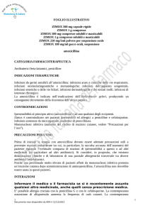 RIASSUNTO DELLE CARATTERISTICHE DEL PRODOTTO 1. DENOMINAZIONE DEL MEDICINALE AMOXICILLINA DOC Generici 1 g compresse. 2. COMPOSIZIONE QUALITATIVA E QUANTITATIVA Ogni compressa contiene: Principio attivo: amoxicillina triidrato g 1,148 pari ad amoxicillina g 1. Per l’elenco completo degli eccipienti, vedere paragrafo 6.1. 3. FORMA FARMACEUTICA Compresse. 4. INFORMAZIONI CLINICHE 4.1 Indicazioni terapeutiche Infezioni da germi sensibili all’amoxicillina: infezioni acute e croniche delle vie respiratorie, infezioni otorinolaringoiatriche e stomatologiche; infezioni dell’apparato urogenitale, infezioni enteriche e delle vie biliari; infezioni dermatologiche e dei tessuti molli; infezioni di interesse chirurgico. L’amoxicillina è indicata nell’eradicazione dell’Helicobacter pylori, producendo un conseguente decremento della ricorrenza dell’ulcera peptica. 4.2 Posologia e modo di somministrazione Salvo diversa prescrizione medica, la dose media consigliata è la seguente: Adulti: 1 compressa due volte al giorno. La dose sopra indicata può essere aumentata a giudizio del medico. La durata del trattamento deve essere stabilita in rapporto all’evoluzione della forma infettiva. Nella cistite e nella uretrite gonococcica acuta: 3 g in unica somministrazione oppure 1,5 g in unica somministrazione e, dopo 4 ore, 1,5 g in unica somministrazione. Nell’infezione da Helicobacter pylori: 1 g ogni 12 ore per 7-10 giorni in combinazione con macrolidi o nitroimidazolici e con inibitori della pompa protonica secondo il seguente schema posologico, che sarà scelto in funzione del tipo di resistenza. Schemi posologici nell’eradicazione dell’Helicobacter pylori Tripla terapia: pantoprazolo 40 mg due volte al dì + amoxicillina 1000 mg due volte al dì + claritromicina 500 mg due volte al dì pantoprazolo 40 mg due volte al dì + amoxicillina 1000 mg due volte al dì + metronidazolo 500 mg due volte al dì claritromicina 500 mg 2 volte al dì + amoxicillina 1000 mg due volte al dì + omeprazolo 20 mg al dì claritromicina 500 mg 2 volte al dì + lansoprazolo 30 mg 2 volte al dì + amoxicillina 1000 mg due volte al dì per 10 giorni. Un’ulteriore soppressione della secrezione acida può essere richiesta per la riduzione dell’ulcera. 4.3 Controindicazioni Ipersensibilità al principio attivo o ad uno qualsiasi degli eccipienti elencati al paragrafo 6.1. AMOXICILLINA DOC Generici è controindicata nei pazienti ipersensibili ed allergici a penicilline e cefalosporine. Infezioni sostenute da microrganismi produttori di penicillinasi. Mononucleosi infettiva (aumento del rischio di reazioni cutanee – vedere paragrafo 4.4). Controindicato in età pediatrica. 4.4 Avvertenze speciali e precauzioni di impiego Prima di iniziare la terapia con amoxicillina devono essere adottate precauzioni utili a prevenire reazioni indesiderate tra cui, in particolare, la raccolta accurata della storia del paziente riguardo l’eventuale comparsa di reazioni di ipersensibilità a questo o ad altri medicinali (in particolare ad altri antibiotici). Si consideri, in proposito, che esistono dimostrazioni cliniche e di laboratorio di una parziale allergenicità crociata tra diversi antibiotici beta1 lattamici. Durante un trattamento prolungato con amoxicillina devono essere eseguiti controlli periodici ematologici, renali, ed epatici, specialmente nei pazienti con funzione epatica o renale compromessa. Poiché una percentuale molto elevata di pazienti affetti da mononucleosi infettiva presenta un’eruzione cutanea dopo somministrazione di aminopenicilline, l’amoxicillina non deve essere usata in questi pazienti. La colite pseudomembranosa deve essere presa in considerazione nella diagnosi differenziale delle diarree insorte durante il trattamento antibiotico o poco dopo l’interruzione. Specialmente nei casi di trattamento prolungato o ad alte dosi i pazienti devono essere sorvegliati per individuare insorgenze di infezioni da organismi resistenti (ad es.: candidiasi orale o vaginale). 4.5 Interazioni con altri medicinali ed altre forme di interazione È possibile allergia crociata con la penicillina G e con le cefalosporine. La contemporanea assunzione di allopurinolo aumenta la frequenza di rash cutanei. La contemporanea assunzione di contraccettivi orali riduce l'assorbimento di questi ultimi. E' noto un effetto terapeutico sinergico tra le penicilline semisintetiche e gli aminoglicosidi. Il probenecid somministrato contemporaneamente prolunga i livelli ematici delle penicilline per competizione con le stesse a livello renale. L'acido acetilsalicilico, il fenilbutazone o altri farmaci antiinfiammatori a forti dosi, somministrati in concomitanza con penicilline, ne aumentano i livelli plasmatici e l'emivita. 4.6 Fertilità, gravidanza e allattamento Nelle donne in stato di gravidanza il prodotto va somministrato nei casi di effettiva necessità, sotto il diretto controllo del medico. 4.7 Effetti sulla capacità di guidare veicoli e sull’uso di macchinari L'amoxicillina non ha evidenziato interferenze sulla capacità di guidare e di usare macchinari. 4.8 Effetti indesiderati Patologie della cute e del tessuto sottocutaneo Occasionalmente eruzione cutanea (orticarioide o eritematosa, maculopapulosa, morbilliforme); raramente angioedema, dermatite esfoliativa, necrolisi epidermica tossica (sindrome di Lyell), eritema multiforme; casi isolati di sindrome di Stevens-Johnson. Patologie del sistema emolinfopoietico Frequentemente eosinofilia; raramente anemia emolitica e test di Coombs diretto positivo. Raramente si può riscontrare: anemia, leucopenia, neutropenia, agranulocitosi, trombocitopenia, porpora trombocitopenica, aggregazione piastrinica anormale, prolungamento del tempo di sanguinamento o del tempo di tromboplastina parziale attivato. Patologie sistemiche e relative alla sede di somministrazione Raramente reazioni anafilattiche con sintomi caratteristici: ipotensione grave ed improvvisa, accelerazione e