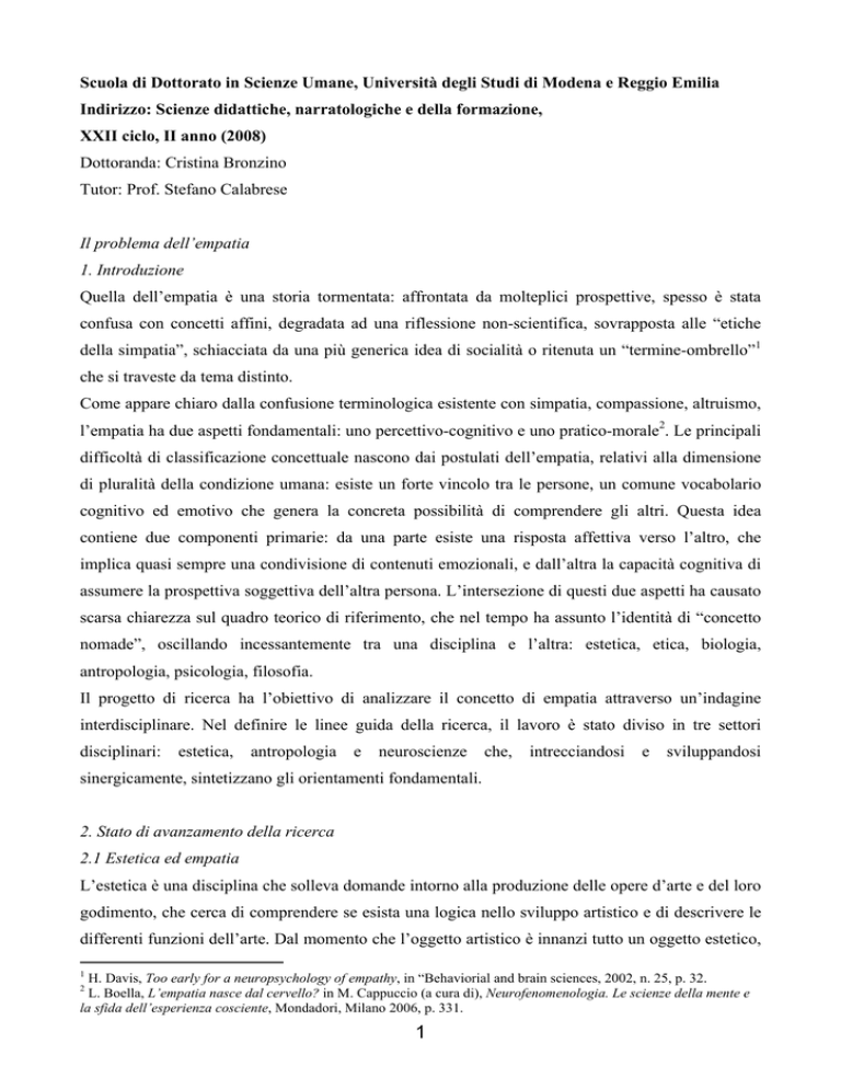 Scuola di Dottorato in Scienze Umane, Università degli Studi di Modena e Reggio Emilia Indirizzo: Scienze didattiche, narratologiche e della formazione, XXII ciclo, II anno (2008) Dottoranda: Cristina Bronzino Tutor: Prof. Stefano Calabrese Il problema dell’empatia 1. Introduzione Quella dell’empatia è una storia tormentata: affrontata da molteplici prospettive, spesso è stata confusa con concetti affini, degradata ad una riflessione non-scientifica, sovrapposta alle “etiche della simpatia”, schiacciata da una più generica idea di socialità o ritenuta un “termine-ombrello”1 che si traveste da tema distinto. Come appare chiaro dalla confusione terminologica esistente con simpatia, compassione, altruismo, l’empatia ha due aspetti fondamentali: uno percettivo-cognitivo e uno pratico-morale2. Le principali difficoltà di classificazione concettuale nascono dai postulati dell’empatia, relativi alla dimensione di pluralità della condizione umana: esiste un forte vincolo tra le persone, un comune vocabolario cognitivo ed emotivo che genera la concreta possibilità di comprendere gli altri. Questa idea contiene due componenti primarie: da una parte esiste una risposta affettiva verso l’altro, che implica quasi sempre una condivisione di contenuti emozionali, e dall’altra la capacità cognitiva di assumere la prospettiva soggettiva dell’altra persona. L’intersezione di questi due aspetti ha causato scarsa chiarezza sul quadro teorico di riferimento, che nel tempo ha assunto l’identità di “concetto nomade”, oscillando incessantemente tra una disciplina e l’altra: estetica, etica, biologia, antropologia, psicologia, filosofia. Il progetto di ricerca ha l’obiettivo di analizzare il concetto di empatia attraverso un’indagine interdisciplinare. Nel definire le linee guida della ricerca, il lavoro è stato diviso in tre settori disciplinari: estetica, antropologia e neuroscienze che, intrecciandosi e sviluppandosi sinergicamente, sintetizzano gli orientamenti fondamentali. 2. Stato di avanzamento della ricerca 2.1 Estetica ed empatia L’estetica è una disciplina che solleva domande intorno alla produzione delle opere d’arte e del loro godimento, che cerca di comprendere se esista una logica nello sviluppo artistico e di descrivere le differenti funzioni dell’arte. Dal momento che l’oggetto artistico è innanzi tutto un oggetto estetico, 1 H. Davis, Too early for a neuropsychology of empathy, in “Behaviorial and brain sciences, 2002, n. 25, p. 32. L. Boella, L’empatia nasce dal cervello? in M. Cappuccio (a cura di), Neurofenomenologia. Le scienze della mente e la sfida dell’esperienza cosciente, Mondadori, Milano 2006, p. 331. 2 1 il problema dell’estetica sarà senza dubbio quello di preoccuparsi dell’aspetto della conoscenza sensibile che viene a implicarsi in seno alla comprensione intera dell’oggetto. All’interno di questo ambito di indagine si è sviluppato un vivo interesse per il concetto di empatia, che risulta essere un fattore fondamentale per ogni esperienza estetica. A cavallo tra Otto e Novecento, intorno ad un nucleo filosofico di matrice psicologico-estetica, si sviluppa una stagione di vivo interesse verso il concetto di empatia, le cui indagini possono essere raccolte sotto il nome di Einfülungstheorie3. La parola Einfülung è stata introdotta nel 1873 nel vocabolario filosofico, psicologico ed estetico per opera di Robert Vischer che l’ha intesa come una proiezione del nostro io negli altri e nelle cose, un’oggettivazione della nostra vita affettiva, un’identificazione di soggetto e oggetto attraverso i sentimenti. Questa definizione è, secondo i teorici dell’Einfülung, l’essenza stessa del sentimento estetico. I teorici che si sono concentrati su questo nucleo di indagine – ovvero Volkelt, Lipps, R. Vischer, Worringer – si trovano in accordo sulla sua genealogia, riconducendola in maniera quasi unanime nell’ambito del pensiero estetico romantico, in casi particolari che rappresentano i prodromi di quella che sarà tutta la produzione della teoria dell’empatia. Si tratta in primo luogo di Novalis e del suo romanzo naturale I discepoli di Sais4 in cui si parla di sentire come il medio tra sé e l’altro da sé grazie alla Sympathie e al Mitgefühl5 (simpatia e sentire-con) e si asserisce che l’essere umano può comprendere la natura solo se empatizza in essa. Un’ulteriore questione da mettere in luce è senza dubbio quella su come da un punto di vista psicologico i sentimenti possano essere collegati ad un io empirico, a un corpo che mi è davanti. Due sono le risposte più rilevanti: la teoria dell’associazione, sostenuta da Stern e Prandtl, e la vera e propria teoria dell’empatia: entrambe sostengono che il trasferimento dei sentimenti avverrebbe tramite un processo di associazione che sulla base delle esperienze riproduce i sentimenti precedentemente vissuti. Per la teoria dell’associazione la rappresentazione di un sentimento viene suscitata dalla percezione di corpi estranei e non dalle sensazioni del proprio corpo, per cui non emerge dal proprio vissuto, ma dall’osservazione di un corpo estraneo6. Le difficoltà che gravano su questa teoria sono di facile intuizione: innanzi tutto, la coscienza potrebbe generare unicamente una “associazione vissuta” e non quell’essere-l’uno-nell’altro caratteristico della comprensione empatica; Volkelt designa il processo che sta psicologicamente alla base dell’associazione come Verschmelzung, fusione, con l’intento di poter aggirare questo ostacolo. Tuttavia, nonostante le precisazioni sulle modalità di associazione, resta un nodo molto più difficile da sciogliere, vale a dire quello che mette in relazione un corpo estraneo con un io estraneo. La soluzione più semplice 3 M. Geiger, Essenza e significato dell’empatia, trad. it. in A. Pinotti, Estetica ed empatia, Guerini, Torino 1997, pp. 6194. 4 Novalis, I discepoli di Sais, trad