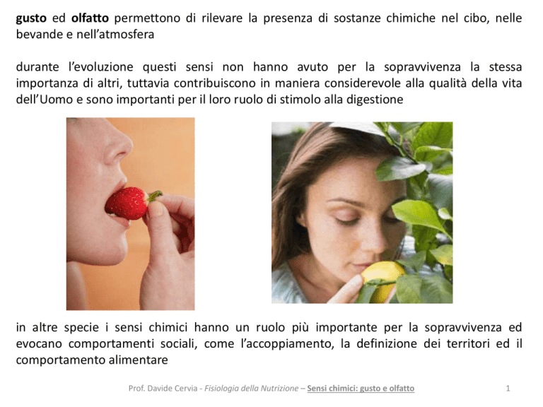 gusto ed olfatto permettono di rilevare la presenza di sostanze chimiche nel cibo, nelle bevande e nell’atmosfera durante l’evoluzione questi sensi non hanno avuto per la sopravvivenza la stessa importanza di altri, tuttavia contribuiscono in maniera considerevole alla qualità della vita dell’Uomo e sono importanti per il loro ruolo di stimolo alla digestione in altre specie i sensi chimici hanno un ruolo più importante per la sopravvivenza ed evocano comportamenti sociali, come l’accoppiamento, la definizione dei territori ed il comportamento alimentare Prof. Davide Cervia - Fisiologia della Nutrizione – Sensi chimici: gusto e olfatto 1 gusto i sapori attivano speciali cellule recettoriali contenute principalmente nelle papille gustative le cellule gustative si raccolgono a formare bottoni o calici gustativi cellule gustative isolate sono state identificate lungo tutta la mucosa della cavità orale, nella faringe e nell’esofago Prof. Davide Cervia - Fisiologia della Nutrizione – Sensi chimici: gusto e olfatto 2 nell’uomo ci sono circa 3000 bottoni gustativi le papille foliate e circumvallate ne contengono fino a 300, le fungiformi molto meno nei bottoni si riconoscono almeno 4 tipi di cellule: tipo I (cellule scure) tipo II (cellule chiare – recettori gustativi) tipo III (recettori gustativi) cellule staminali (basali) la vita media delle cellule gustative è circa 10-14 giorni al polo basale le cellule gustative fanno sinapsi chimica con terminazioni nervose afferenti Prof. Davide Cervia - Fisiologia della Nutrizione – Sensi chimici: gusto e olfatto 3 nell’uomo ci sono 5 modalità gustative primarie: salato; acido; dolce; amaro; umami non esiste una mappa topografica della percezione dei gusti sulla lingua trasduzione del gusto salato le molecole salate sono piccoli ioni tipo Na+, K+ e Ca2+ la trasduzione è causata dall’ingresso degli ioni nella cellula gustativa e successiva genesi del potenziale di recettore (depolarizzazione) sono stati identificati apicalmente canali di tipo ENaC (epithelial sodium channels), anche nella regione basolaterale la vasopressina aumenta le correnti di sodio, l’aldosterone incrementa il numero dei canali ENaC sono stati identificati canali K+ (sensazione amaro-salata) nella regione basolaterale, ma probabilmente esistono anche a livello apicale ; gli ENaC sono comunque coinvolti nella risposta al K+ i canali Ca2+ non sono stati ancora identificati Prof. Davide Cervia - Fisiologia della Nutrizione – Sensi chimici: gusto e olfatto 4 trasduzione del gusto acido informazioni sulla qualità del cibo; importante valore per la sopravvivenzale legato al pH sulla superficie linguale per la genesi del potenziale di recettore è stata dimostrata l’implicazione, forse esclusiva, del canale ionico sensibile all’acido PKD2L1, permeabile al Na+ ed al Ca2+ Prof. Davide Cervia - Fisiologia della Nutrizione – Sensi chimici: gusto e olfatto 5 trasduzione del gusto dolce, amaro e umami attraverso la stimolazione di recettori T1R (dolce ed umami) e T2R (amaro) posti sulla superficie microvillare ciascuna cellula gustativa risponde al dolce (presenza del complesso T1R2/T1R3), all’umami (presenza del complesso T1R1/T1R3) o all’amaro (presenza di T2R) in modo selettivo tutte le cellule utilizzano il canale cationico TRPM-5 per la genesi del potenziale di recettore l’apertura di TRPM-5 dipende dall’attivazione di proteine G specifiche e dalla via dell’inositolo trifosfato la percezione dell’amaro ha una grande valenza per la sopravvivenza (veleni etc.), così come la percezione degli elementi zuccherini o debolmente salati (ad es. carne - aminoacidi) spesso ricchi di carbonio e quindi importanti nutrienti Prof. Davide Cervia - Fisiologia della Nutrizione – Sensi chimici: gusto e olfatto 6 i recettori T1R sono recettori accoppiati a proteine G esperimenti in vivo su topi geneticamente modificati e in vitro su sistemi ricombinanti hanno chiarito il ruolo funzionale sulla percezione gustativa dolce del complesso T1R2/T1R3, ed umami del complesso T1R1/T1R3, espressi selettivamente dalle cellule gustative per la percezione è importante la cellula che li esprime Prof. Davide Cervia - Fisiologia della Nutrizione – Sensi chimici: gusto e olfatto 7 i primi studi sulla percezione dell’amaro hanno individuato nella gustducina una proteina G associata alla percezione del gusto amaro il locus genico Prop, localizzato nel cromosoma 5 umano, è stato associato alla percezione della sostanza amara 6-propil-2-tiouracile (PROP) in seguito si è stimato che all’interno del locus ci siano regioni codificanti per almeno una trentina di recettori T2R accoppiati a proteine G recettori omologhi sono stati individuati in alcuni loci cromosomici di topo associati al gusto amaro, come Cyr (cicloesimide), Soa (saccarosio ottacetato), Rua (raffinoso undecacetato) e Qui (chinina) ciascuna cellula gustativa contenente gustducina esprime tutto il repertorio di T2R, infatti i mammiferi percepiscono l’amaro ma non lo discriminano esperimenti in vivo su topi geneticamente modificati e in vitro su sistemi ricombinanti hanno chiarito che T2R è la famiglia di recettori responsabili della percezione dell’amaro Prof. Davide Cervia - Fisiologia della Nutrizione – Sensi chimici: gusto e olfatto 8 nonostante siano stati individuate diverse vie di signalling (ad es. IP3, cAMP etc.) gli effettori finali delle cellule che rispondono al gusto amaro, dolce ed umami sono i medesimi, cioè l’enzima fosfolipasi C-b2 (PLCb2) ed il canale di membrana TRPM-5 Prof. Davide Cervia - Fisiologia della Nutrizione – Sensi chimici: gusto e olfatto 9 vie nervose gustative attraverso il rilascio del neurotrasmettitore ATP, l’informazione è trasmessa al SNC per mezzo di nervi diversi -fibre della corda del timpano (papille fungiformi) -fibre del glossofaringeo (papille foliate e circumvallate) Prof. Davide Cervia - Fisiologia della Nutrizione – Sensi chimici: gusto e ol