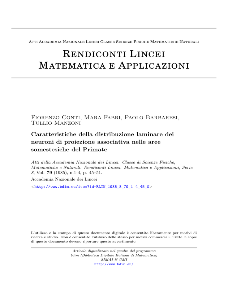 A TTI A CCADEMIA N AZIONALE L INCEI C LASSE S CIENZE F ISICHE M ATEMATICHE N ATURALI R ENDICONTI L INCEI M ATEMATICA E A PPLICAZIONI Fiorenzo Conti, Mara Fabri, Paolo Barbaresi, Tullio Manzoni Caratteristiche della distribuzione laminare dei neuroni di proiezione associativa nelle aree somestesiche del Primate Atti della Accademia Nazionale dei Lincei. Classe di Scienze Fisiche, Matematiche e Naturali. Rendiconti Lincei. Matematica e Applicazioni, Serie 8, Vol. 79 (1985), n.1-4, p. 45–51. Accademia Nazionale dei Lincei <http://www.bdim.eu/item?id=RLIN_1985_8_79_1-4_45_0> L’utilizzo e la stampa di questo documento digitale è consentito liberamente per motivi di ricerca e studio. Non è consentito l’utilizzo dello stesso per motivi commerciali. Tutte le copie di questo documento devono riportare questo avvertimento. Articolo digitalizzato nel quadro del programma bdim (Biblioteca Digitale Italiana di Matematica) SIMAI & UMI http://www.bdim.eu/ Atti della Accademia Nazionale dei Lincei. Classe di Scienze Fisiche, Matematiche e Naturali. Rendiconti Lincei. Matematica e Applicazioni, Accademia Nazionale dei Lincei, 1985. F. CONTI ED ALTRI, Caratteristiche della distribuzione laminare, ecc. 45 Fisiologia. — Caratteristiche della distribuzione laminare dei neuroni di proiezione associativa nelle aree somestesiche del Primate W. Nota di FIORENZO C O N T I , MARA FABRI, PAOLO BARBARESI e T U L L I O MANZONI, presentata <*•) dal Corrisp. O. P I N O T T I . SUMMARY. — The reciprocai associative connections between the first and the second somatosensory area (SI and SII) of the macaque monkey were investigated with the horseradish peroxidase (HRP) procedures. The aim was to determine, in both areas, the laminar distribution of the associative projecting neurones. In a first group of animals HRP was injected in area SII and in a second group in area SI. In the first group of animals it was found that the retrogradely- labelled neurones of area SI sending axons to ipsilateral area SII (SI-SII associative neurones) were distributed overwhelmingly in layer III (88.8%), mainly in the upper half of this layer. Few neurones were also present in layer II (6.1%), IV (1.8%) and V-VI (3.3%). In the second group of animals it was found that the retrogradely-labelled neurones of area SII sending axons to ipsilateral area SI (SII-SI associative neurones) were distributed mainly in layer V-VI (52.4%) and III (41.1%), especially in its upper half. Scattered associative neurones were also found in layer II (2.2%) and IV (4.3%). The different laminar origin of S I - S I I and S I I - S I associative projections might be related to a different functional role of the two projections in th^ trasmission of neural information between the two somatosensory areas. L'impiego delle nuove tecniche anatomiche basate sul trasporto assonico di certe sostante neurotraccianti come la perossidasi di rafano, alcuni aminoacidi marcati ed un gruppo di composti fluorescenti, ha consentito in questi ultimi anni di tracciare le connessioni cortico-corticali, sia associative che callosali, di diverse aree della corteccia cerebrale del Mammifero e di identificare sia i neuroni di origine che le terminazioni assoniche di queste proiezioni [2, 9, 17]. Uno degli aspetti di maggior interesse emerso da tali ricerche riguarda la distribuzione di questi elementi nervosi nelle diverse lamine che costituiscono la corteccia cerebrale. La loro distribuzione infatti non è casuale in quanto i neuroni di origine e le terminazioni assoniche delle proiezioni cortico-corticali sono disposti nelle varie lamine secondo modelli caratteristici e specifici che possono dipendere sia dall'area di origine che da quella di destinazione di queste (*) Lavoro eseguito col sussidio del Ministero della P.I. e della Regione Marche nell'Istituto di Fisiologia umana dell'Università di Ancona. (**) Nella seduta del 28 giugno 1985. 46 Atti Acc. Lincei Rend, fis. - S. VIII, vol. LXXIX, Ferie 1985, fase. 1-4 proiezioni. Nelle aree visive del Primate, ad esempio, è stato accertato che le connessioni associative tra le aree disposte tra loro in successione caudo-rostrale originano prevalentemente dagli strati sopragranulari e terminano soprattutto nel IV strato, mentre le connessioni reciproche tra le stesse aree, dirette in senso inverso, originano dagli strati infragranulari e terminano prevalentemente nei livelli più esterni della corteccia [7, 14]. Si ritiene che il tipo di organizzazione anatomica di una proiezione associativa sottenda la sua organizzazione e significato funzionale. Di fatto, neuroni corticali con caratteristiche morfologiche, biochimiche e fisiologiche diverse hanno una distribuzione preferenziale in una o più lamine corticali ed è stato inoltre osservato che la soppressione di proiezioni associative con diversa organizzazione anatomica può determinare modificazioni diverse nelle proprietà fisiologiche dei neuroni nell'area deprivata [9, 10, 15, 16; cfr. dati e lett. in 12]. Lo studio dell'organizzazione laminare delle connessioni associative in atto tra le aree sensoriali di proiezione primaria ed alcune aree corticali con cui le prime sono reciprocamente collegate potrebbe quindi suggerire quale significato abbiano le interrelazioni funzionali tra queste aree nella elaborazione intracorticale dei messaggi sensoriali. L'area somestesica prima (SI) e seconda (SII) del Primate sono anch'esse reciprocamente collegate tra loro mediante proiezioni associative [cfr. dati e lett. in 12]. Tali proiezioni erano note da tempo ma solo di recente ricerche basate sul trasporto assonico di sostanze neurotraccianti hanno potuto dimostrare che il modo di terminare delle fibre associative originate nell'area SI è diverso da quello delle omologhe fibre originate in SII. Infatti, le fibre associative della proiezione SI-SII terminano prevalentemente nel IV e III strato dell'area SII e, in misura minore, negli strati I—II e VI eccetto il V [4, 5]. Vice