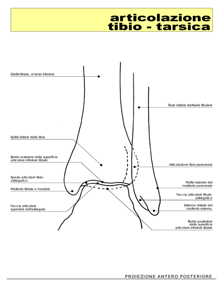 Diafisi tibiale, al terzo inferiore Terzo distale diafisario fibulare Epifisi distale della tibia Bordo anteriore della superficie articolare inferiore tibiale Articolazione tibio-peroneale Spazio articolare tibioastragalico Malleolo tibiale o mediale Profilo laterale del malleolo peroneale Faccia articolare fibuloastragalica Faccia articolare superiore dell'astragalo Estremo distale del malleolo esterno, Bordo posteriore della superficie articolare inferiore tibiale PROIEZIONE ANTERO POSTERIORE Diafisi tibiale al terzo distale Diafisi peroneale al terzo distale Profilo anteriore diafisario tibiale Residuo della cartilagine d'accrescimento Spazio articolare, o ‘mortaio’ tibio-astragalico Malleolo tibiale Collo dell'astragalo Malleolo peroneale Testa astragalica Apofisi posteriore dell'astragalo Scafoide tarsale Apofisi calcaneare anteriore Corpo del calcagno Grande tuberosità calcaneare PROIEZIONE LATERO-LATERALE Bordo anteriore della superficie articolare della tibia Bordo posteriore della superficie articolare della tibia Malleolo mediale Superficie articolare della tibia Superficie articolare Gola della troclea Malleolo esterno Superficie articolare dell'astragalo con il perone Apofisi laterale dell'astragalo PROIEZIONE ANTERO-POSTERIORE Terzo malleolo Malleolo esterno Malleolo mediale Apofisi laterale dell'astragalo Testa dell'astragalo PROIEZIONE LATERO-LATERALE