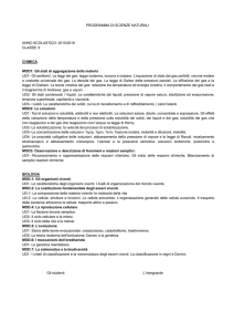 Liceo Scientifico Statale “Antonio Labriola” Anno scolastico 2012/2013 PROGRAMMA DEGLI ARGOMENTI SVOLTI CHIMICA E LABORATORIO Classe: 4° C Corso scientifico - tecnologico Docente: Cecilia Sequi LO STATO SOLIDO Caratteri distintivi. Solidi cristallini, reticolo ed habitus cristallino, allotropia, isomorfismo. Proprietà fisiche: durezza, sfaldabilità, fragilità. Solidi covalenti, solidi ionici, solidi metallici, solidi molecolari. Solidi amorfi. LO STATO LIQUIDO E LE SOLUZIONI Caratteri distintivi, natura delle forze attrattive intermolecolari. Evaporazione, tensione di vapore, ebollizione. Caratteristiche dei liquidi: tensione superficiale, viscosità, capillarità. Soluzioni: soluto solvente, soluzione. Solubilizzazione e solubilità. Soluzioni liquido-liquido, soluzioni solido in liquido. Il processo di dissoluzione, variazioni di energia nel processo di solubilizzazione. Soluzioni solido-solido. La concentrazione delle soluzioni: %p/p, %v/v, Molarità, molalità, frazione molare. Proprietà colligative delle soluzioni: abbassamento della tensione di vapore, innalzamento ebullioscopico, abbassamento crioscopico, pressione osmotica, Attività di laboratorio: determinazione della curva di solubilità del KNO3 ; preparazione di soluzioni a concentrazione nota LO STATO GASSOSO (Modulo interdisciplinare chimica - fisica.) Variabili dei gas. Gas ideali: Legge di Boyle-Mariotte. Temperatura critica. Prima legge di GayLussac. Seconda legge di Gay-Lussac. Temperatura assoluta. Legge di Avogadro. Legge universale dei gas. Legge di Graham. Teoria cinetico molecolare. Un modello per i gas e spiegazione delle leggi sperimentali. Pressioni parziali. Le soluzioni gassose e la legge di Dalton delle pressioni parziali. Diagrammi di fase. Attività sperimentale: legge di Boyle e di Gay Lussac al laboratorio RTL. Approfondimento su Amedeo Avogadro e l’interpretazione della legge di combinazione dei volumi gassosi. TERMODINAMICA CHIMICA Energia nelle reazioni chimiche. Calore di reazione. Primo principio della termodinamica. Reazioni esotermiche ed endotermiche. Entalpia. Legge di Hess. Processi spontanei. Secondo principio della termodinamica. Entropia. Variazioni di entropia nei processi fisici e nelle trasformazioni chimiche. Energia libera. Equazione di Gibbs e spontaneità delle reazioni chimiche. Attività sperimentale: verifica sperimentale della legge di Hess: calore di neutralizzazione NaOHHCl in un unico stadio ed in due stadi. CINETICA CHIMICA Velocità di reazione, velocità media ed istantanea. Fattori che influenzano la velocità delle reazioni chimiche. La legge cinetica. Reazioni di primo e secondo ordine, di ordine zero. Legge cinetica integrata delle reazioni di primo ordine. Dinamica delle reazioni: energia di attivazione e teoria delle collisioni, teoria del complesso attivato. Profilo di reazione. Influenza della temperatura sulla velocità di reazione. Reazioni multistadio e determinazione del meccanismo di reazione, stadio elementare e stadio cineticamente determinante. Catalizzatori ed enzimi. EQUILIBRIO CHIMICO Reazioni reversibili ed irreversibili. Legge dell’azione di massa. Significato ed espressione della costante di equilibrio. Equilibri eterogenei. Applicazioni della costante di equilibrio: grado di avanzamento di una reazione, verso di svolgimento di una reazione, concentrazioni all’equilibrio di una specie chimica. Principio di Le Chatelier. Temperatura e costante di equilibrio. Pressione e costante di equilibrio. Equilibri di solubilità: prodotto di solubilità. Relazione tra il prodotto di solubilità e la solubilità molare. Effetto ione in comune. Relazione tra solubilità e precipitazione. Attività sperimentale: studio dei fattori che influenzano l’equilibrio chimico. EQULIBRI ACIDO - BASE Elettroliti, ionizzazione e dissociazione ionica. Acidi e basi, teoria di Arrhenius, teoria di Bronsted e Lowry: coppie coniugate acido-base, reazioni di protolisi, Autoprotolisi dell’acqua. Prodotto ionico dell’acqua. La scala del pH. Forza di acidi e basi. Significato ed espressione delle costanti di dissociazione acide e basiche. Calcolo del pH di acidi e basi forti e deboli. Indicatori. Equivalente chimico e normalità, titolazione acido –base e curve di titolazione. Idrolisi salina. Determinazione del pH di soluzioni saline. Soluzioni tampone. Attività sperimentale: Determinazione curva di titolazione. Titolazione di base forte con acido forte. Roma 11/06/2013 prof.ssa Cecilia Sequi Per gli studenti