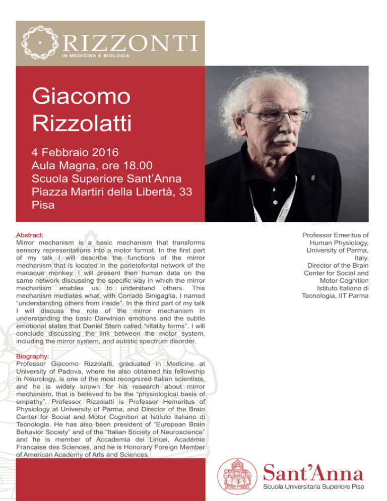 Giacomo Rizzolatti 4 Febbraio 2016 Aula Magna, ore 18.00 Scuola Superiore Sant’Anna Piazza Martiri della Libertà, 33 Pisa .Abstract: Mirror mechanism is a basic mechanism that transforms sensory representations into a motor format. In the first part of my talk I will describe the functions of the mirror mechanism that is located in the parietofontal network of the macaque monkey. I will present then human data on the same network discussing the specific way in which the mirror mechanism enables us to understand others. This mechanism mediates what, with Corrado Sinigaglia, I named “understanding others from inside”. In the third part of my talk I will discuss the role of the mirror mechanism in understanding the basic Darwinian emotions and the subtle emotional states that Daniel Stern called “vitality forms”. I will conclude discussing the link between the motor system, including the mirror system, and autistic spectrum disorder. Biography: Professor Giacomo Rizzolatti, graduated in Medicine at University of Padova, where he also obtained his fellowship in Neurology, is one of the most recognized Italian scientists, and he is widely known for his research about mirror mechanism, that is believed to be the “physiological basis of empathy”. Professor Rizzolatti is Professor Hemeritus of Physiology at University of Parma, and Director of the Brain Center for Social and Motor Cognition at Istituto Italiano di Tecnologia. He has also been president of “European Brain Behavior Society” and of the “Italian Society of Neuroscience” and he is member of Accademia dei Lincei, Académie Francaise des Sciences, and he is Honorary Foreign Member of American Academy of Arts and Sciences. Professor Emeritus of Human Physiology, University of Parma, Italy. Director of the Brain Center for Social and Motor Cognition Istituto Italiano di Tecnologia, IIT Parma Giacomo Rizzolatti 4 Febbraio 2016 Aula Magna, ore 18.00 Scuola Superiore Sant’Anna Piazza Martiri della Libertà, 33 Pisa .Abstract: Nella prima parte della conferenza descriverò la funzione dei neuroni a specchio localizzati tra i network parietofrontali del macaco e presenterò dati raccolti nell'uomo dello stesso network, analizzando i meccanismi specifici con i quali i neuroni a specchio ci permettono di capire gli altri. Questo meccanismo media quanto, con Corrado Sinigaglia, ho chiamato “capire gli altri dall'interno”. Discuterò poi l'importanza dei neuroni a specchio per comprendere le emozioni darwiniane fondamentali e quei particolari stati emotivi che Daniel Stern ha chiamato “forme di vitalità”. Concluderò evidenziando le connessioni tra il sistema motorio, i neuroni a specchio e i disordini dello spettro autistico. Biografia: Il Professor Giacomo Rizzolatti, laureatosi in Medicina presso l'Università di Padova, dove ha anche conseguito la specializzazione in Neurologia, è uno dei più eminenti scienziati italiani, il cui nome è indissolubilmente legato alla scoperta dei neuroni a specchio, ritenuti essere la “base fisiologica dell'empatia”. Il Professor Rizzolatti attualmente è Professore Emerito di Fisiologia presso l'Università di Parma, e Direttore del Brain Center for Social and Motor Cognition presso l'Istituto Italiano di Tecnologia. E' inoltre stato presidente della “European Brain Behavior Society” e della “Società Italiana di Neuroscienze”. È membro dell’Accademia dei Lincei, dell’Académie Francaise des Sciences, ed è Honorary Foreign Member dell’American Academy of Arts and Sciences. Professor Emeritus of Human Physiology, University of Parma, Italy. Director of the Brain Center for Social and Motor Cognition Istituto Italiano di Tecnologia, IIT Parma