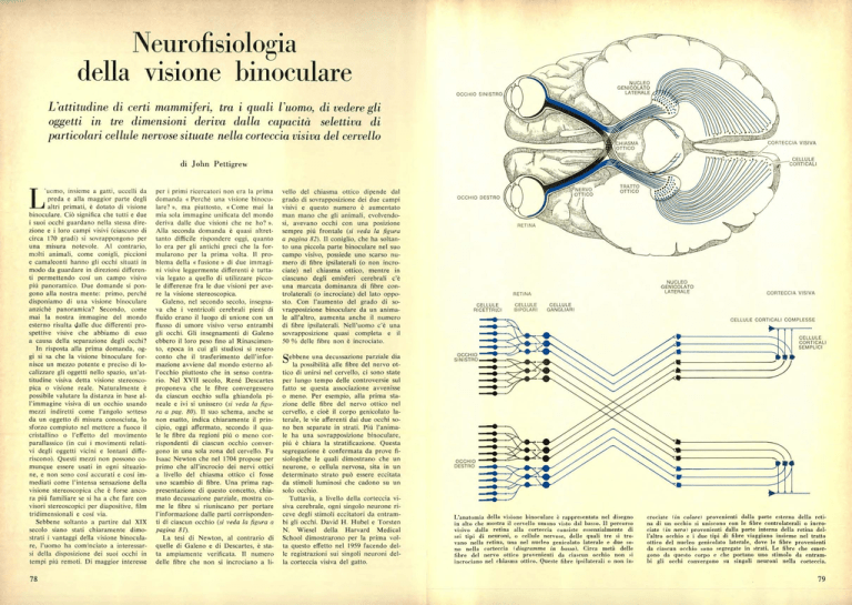 Neurofisiologia della visione binoculare OCCHIO SINISTRO L'attitudine di certi mammiferi, tra i quali l'uomo, di vedere gli oggetti in tre dimensioni deriva dalla capacità selettiva di particolari cellule nervose situate nella corteccia visiva del cervello CORTECCIA VISIVA CELLULE CORTICALI di John Pettigrew I' j uomo, insieme a gatti, uccelli da preda e alla maggior parte degli altri primati, è dotato di visione binoculare. Ciò significa che tutti e due i suoi occhi guardano nella stessa direzione e i loro campi visivi (ciascuno di circa 170 gradi) si sovrappongono per una misura notevole. Al contrario, molti animali, come conigli, piccioni e camaleonti hanno gli occhi situati in modo da guardare in direzioni differenti permettendo cosí un campo visivo piú panoramico. Due domande si pongono alla nostra mente: primo, perché disponiamo di una visione binoculare anziché panoramica? Secondo, come mai la nostra immagine del mondo esterno risulta dalle due differenti prospettive visive che abbiamo di esso a causa della separazione degli occhi? In risposta alla prima domanda, oggi si sa che la visione binoculare fornisce un mezzo potente e preciso di localizzare gli oggetti nello spazio, un'attitudine visiva detta visione stereoscopica o visione reale. Naturalmente è possibile valutare la distanza in base all'immagine visiva di un occhio usando mezzi indiretti come l'angolo setteso da un oggetto di misura conosciuta, lo sforzo compiuto nel mettere a fuoco il cristallino o l'effetto del movimento parallassico (in cui i movimenti relativi degli oggetti vicini e lontani differiscono). Questi mezzi non possono comunque essere usati in ogni situazione, e non sono cosí accurati e cosí immediati come l'intensa sensazione della visione stereoscopica che è forse ancora più familiare se si ha a che fare con visori stereoscopici per diapositive, film tridimensionali e cosí via. Sebbene soltanto a partire dal XIX secolo siano stati chiaramente dimostrati i vantaggi della visione binoculare, l'uomo ha cominciato a interessarsi della disposizione dei suoi occhi in tempi più remoti. Di maggior interesse 78 per i primi ricercatori non era la prima domanda « Perché una visione binoculare? », ma piuttosto, « Come mai la mia sola immagine unificata del mondo deriva dalle due visioni che ne ho? ». Alla seconda domanda è quasi altrettanto difficile rispondere oggi, quanto lo era per gli antichi greci che la formularono per la prima volta. Il problema della « fusione » di due immagini visive leggermente differenti è tuttavia legato a quello di utilizzare piccole differenze fra le due visioni per avere la visione stereoscopica. Galeno, nel secondo secolo, insegnava che i ventricoli cerebrali pieni di fluido erano il luogo di unione con un flusso di umore visivo verso entrambi gli occhi. Gli insegnamenti di Galeno ebbero il loro peso fino al Rinascimento, epoca in cui gli studiosi si resero conto che il trasferimento dell'informazione avviene dal mondo esterno all'occhio piuttosto che in senso contrario. Nel XVII secolo, René Descartes proponeva che le fibre convergessero da ciascun occhio sulla ghiandola pineale e ivi si unissero (si veda la figura a pag. 80). 11 suo schema, anche se non esatto, indica chiaramente il principio, oggi affermato, secondo il quale le fibre da regioni più o meno corrispondenti di ciascun occhio convergono in una sola zona del cervello. Fu Isaac Newton che nel 1704 propose per primo che all'incrocio dei nervi ottici a livello del chiasma ottico ci fosse uno scambio di fibre. Una prima rappresentazione di questo concetto, chiamato decussazione parziale, mostra come le fibre si riuniscano per portare l'informazione dalle parti corrispondenti di ciascun occhio (si veda la figura a pagina 81). La tesi di Newton, al contrario di quelle di Galeno e di Descartes, è stata ampiamente verificata. Il numero delle fibre che non si incrociano a li- vello del chiasma ottico dipende dal grado di sovrapposizione dei due campi visivi e questo numero è aumentato man mano che gli animali, evolvendosi, avevano occhi con una posizione sempre più frontale (si veda la figura a pagina 82). 11 coniglio, che ha soltanto una piccola parte binoculare nel suo campo visivo, possiede uno scarso numero di fibre ipsilaterali (o non incrociate) nel chiasma ottico, mentre in ciascuno degli emisferi cerebrali c'è una marcata dominanza di fibre controlaterali (o incrociate) del lato opposto. Con l'aumento del grado di sovrapposizione binoculare da un animale all'altro, aumenta anche il numero di fibre ipsilaterali. Nell'uomo c'è una sovrapposizione quasi completa e il 50 % delle fibre non è incrociato. ebbene una decussazione parziale dia la possibilità alle fibre del nervo ottico di unirsi nel cervello, ci sono state per lungo tempo delle controversie sul fatto se questa associazione avvenisse o meno. Per esempio, alla prima stazione delle fibre del nervo ottico nel cervello, e cioè il corpo genicolato laterale, le vie afferenti dai due occhi sono ben separate in strati. Più l'animale ha una sovrapposizione binoculare, più è chiara la stratificazione. Questa segregazione è confermata da prove fisiologiche le quali dimostrano che un neurone, o cellula nervosa, sita in un determinato strato può essere eccitata da stimoli luminosi che cadono su un solo occhio. Tuttavia, a livello della corteccia visiva cerebrale, ogni singolo neurone riceve degli stimoli eccitatori da entrambi gli occhi. David H. Hubel e Torsten N. Wiesel della Harvard Medical School dimostrarono per la prima volta questo effetto nel 1959 facendo delle registrazioni sui singoli neuroni della corteccia visiva del gatto. !NERVO OTTICO OCCHIO DESTRO TRATTO OTTICO RETINA NUCLEO GEKICOLATO LATERALE RETINA CELLULE RICETTRICI CELLULE BIPOLARI CORTECCIA VISIVA CELLULE GANGLIARI CELLULE CORTICALI COMPLESSE 3111 CELLULE CORTICALI SEMPLICI S OCCHIO DESTRO •0• ~~1,— L'anatomia della visione binoculare è rappresentata nel disegn