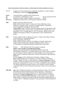 Liceo Statale “G. Mazzini” La Spezia Anno scolastico 2015-2016 Docente: Maria Laura Spinogatti Classe: 4H STORIA ARGOMENTI SVOLTI - Il trionfo dell’assolutismo, l’Europa fra Seicento e Settecento: le guerre di successione polacca e austriaca e la Guerra dei Sette Anni come “prima guerra mondiale” - L’illuminismo: l’ampliamento di prospettive in ambito antropologico-culturale, le teorie politiche; il dispotismo illuminato (Prussia, Austria, Russia); l’Illuminismo in Italia - La Rivoluzione industriale: il “circolo virtuoso” delle cause in Inghilterra e la questione sociale fra nuove classi e nuove teorie politico-economiche - La Rivoluzione americana: le colonie atlantiche del Nord America, la ribellione delle colonie, la guerra d’indipendenza, la nascita degli Stati Uniti d’America, la conquista del West - La Rivoluzione francese: cause, dinamiche dagli Stati generali all’assemblea nazionale costituente; la costituzione di una nuova realtà politica: la prima Costituzione; la Convenzione, la sconfitta della Gironda e la costituzione del Terrore nel 1793; la scristianizzazione rivoluzionaria; interpretazioni del giacobinismo; il Termidoro, il Direttorio - L’Età napoleonica: la campagna d’Italia, la spedizione in Egitto e la seconda coalizione, il colpo di stato del 18 brumaio e l’avvento del Consolato, la politica del Consolato, la costituzione dell’Impero, la campagna di Russia, la sconfitta di Napoleone - La Restaurazione: il Congresso di Vienna, il sistema delle alleanze, gli effetti della Restaurazione in Italia - Il Romanticismo culturale, storico e politico - I moti del 1820-1821; l’indipendenza greca e la “questione orientale”; l’indipendenza in America Latina - Gli anni Trenta: il luglio francese; conseguenze in Europa - Il secondo processo di sviluppo industriale: dall’Inghilterra all’industrializzazione nell’Europa continentale; trasformazione e metamorfosi delle grandi capitali europee: la nascita delle metropoli - La questione sociale: il pensiero liberale, il socialismo e la “nuova” riflessione sociologica, Marx ed Engels, la dottrina comunista del Manifesto - Il Risorgimento: Mazzini, mazziniani e moderati; 1848: Prima guerra d’indipendenza; Cavour: politica interna e diplomazia vincente in politica estera; fallimento dell’azionismo mazziniano; l’alleanza con la Francia e la Seconda guerra d’indipendenza; la spedizione dei Mille e la nascita del Regno d’Italia; la “questione meridionale”; l’annessione del Veneto e la “breccia di Porta Pia” - La situazione internazionale: l’epoca vittoriana inglese; il Secondo Impero francese: l’Impero asburgico; la Guerra di Crimea; L’unificazione in Germania: la politica bismarkiana, la guerra tra Francia e Prussica; l’unificazione tedesca; gli operai al potere nella Comune di Parigi - La sinistra al governo dell’Italia: la legislatura guidata da Depretis, il primo governo Crispi, il breve governo Giolitti, il ritorno di Crispi, la crisi di fine secolo. La Spezia, 03.06.16 Prof.ssa Maria Laura Spinogatti
