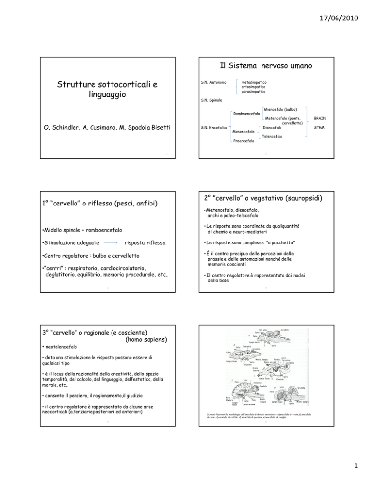 17/06/2010 Il Sistema nervoso umano Strutture sottocorticali e linguaggio S.N. Autonomo metasimpatico ortosimpatico parasimpatico S.N. Spinale Miencefalo (bulbo) Romboencefalo O. Schindler, A. Cusimano, M. Spadola Bisetti Metencefalo (ponte, cervelletto) S.N. Encefalico Diencefalo BRAIN STEM Mesencefalo Telencefalo Proencefalo 1 1° “cervello” o riflesso (pesci, anfibi) 1 2° ”cervello” o vegetativo (sauropsidi) • Metencefalo, diencefalo, archi e paleo-telecefalo • Le risposte sono coordinate da qualiquantità di chemio e neuro-mediatori •Midollo spinale + romboencefalo •Stimolazione adeguate risposta riflessa •Centro regolatore : bulbo e cervelletto •“centri” : respiratorio, cardiocircolatorio, deglutitorio, equilibrio, memoria procedurale, etc.. 2 • Le risposte sono complesse “a pacchetto“ • È il centro precipuo delle percezioni delle prassie e delle automazioni nonché delle memorie coscienti • Il centro regolatore è rappresentato dai nuclei della base 3 3° “cervello” o ragionale (e cosciente) (homo sapiens) • neotelencefalo • data una stimolazione le risposte possono essere di qualsiasi tipo • è il locus della razionalità della creatività, dello spazio temporalità, del calcolo, del linguaggio, dell’estetico, della morale, etc.. • consente il pensiero, il ragionamento,il giudizio • il centro regolatore è rappresentato da alcune aree neocorticali (a.terziarie posteriori ed anteriori) 4 Schemi illustranti la morfologia dell’encefalo di diversi vertebrati: a) encefalo di trota; b) encefalo di rana; c) encefalo di rettile; d) encefalo di passero, e) encefalo di coniglio 5 1 17/06/2010 ....... .. non verbale esecuzione di strutture soprasegmentali Comunicazione speech o articolazione dei fonemi nel vocal tract language o abilità ideative, semantiche, fonologiche, morfosintattiche altro ( per es. udizione, comprensione) verbale Fisiologia e patologia delle abilità linguistiche associate a strutture e funzioni sottocorticali 6 Non è mai stato documentato che una lesione La perdita permanente del linguaggio non è possibile senza lesione subcorticale anche se le aree di Broca e Wernicke sono permanente corticale possa determinare afasie tipo Broca o Wernicke ( D’Esposito, Alexander - 1995) mentre numerosi studi hanno documentato la state distrutte. presenza di sindromi afasiche in associazione con lesioni sottocorticali che apparentemente risparmiano la corteccia cerebrale. 7.1 Comportamenti complessi come camminare, comprensione uditiva e parlare sono regolati da circuiti neurali che costituiscono circuiti a rete che dipendono da strutture corticali e sottocorticali che rappresentano la base neurologica dei comportamenti complessi per cui piuttosto che processi locali sono associati a circuiti neurali complessi ( per es.cortico – striato -talamo- 7.2 Per es. il corpo striato ( caudato, putamen, pallido) oltre a regolare le attività motorie, riceve imput da quasi tutte le aree della corteccia cerebrale e rispettivamente le efferenze dello striato non vanno solo alla corteccia motoria ma anche a specifiche aree premotorie e prefrontali influenzanti oltre al controllo motorio funzioni cognitive, linguistiche, limbiche. corticale oppure cerebrocortico- pontocerebellocortico-dentato-talamo- corticale) 7.3 7.4 2 17/06/2010 Così le uscite dal nucleo dentato Il NUCLEO SUBTALAMICO sembra giocare un ruolo regolatorio interemisferico per i processamenti linguistici di livello superiore cerebellare influenzano non solo le aree motorie corticali ma anche le aree prefrontali del linguaggio e delle cognitività ( Fabbro, 2000; Marian et al. 2001) 7.4 bis 7.5 Lo studio delle strutture sottocorticali è effettuato principalmente da strutturali ( TC, RM) 1. neuroimaging funzionali ( PET, fRM) elettriche 2. Stimolazione cerebrali profonde magnetiche 3. Stereolesioni Diagramma schematico modificato dei maggiori collegamenti cerebro-cerebellari nel cervello umano (adattato da Leiner et al.1989) 7.5 bis 7.6 Strutture sottocorticali Le teorie corticali mielencefalo (bulbo) Romboencefalo metencefalo Brain stem (ponte e cervelletto) ( tronco ) Mesencefalo substantia nigra, Gall ( 1809 ) Broca ( 1861 ) N.rosso, SNC Wernicke ( 1874 ) Lichtheim ( 1885 ) Diencefalo formazione reticolare talamo ipotalamo P.Marie ( 1906 ) Proencefalo 7.7 neocorteccia Telencefalo ...... nuclei della base 8 3 17/06/2010 Nuclei della base Caudato Striato Putamen Lenticolare Globus Pallidus Claustro N. Amigdaloideo Talamo 9 9.1 9.2 9.3 9.4 9.5 4 17/06/2010 CORTECCIA MA NON SOLO GANGLI DELLA BASE 9.6 9.7 9.8 9.9 9.10 9.11 5 17/06/2010 Sistemi effettori nel nevrasse. A) sistema interno di “viscerazione” (sistema reticolare); B) sistema intermedio di espressione all’esterno di situazioni interne (sistema nucleare in serie); C) sistema esterno di transazione effettiva con il mondo esterno (sistema strati-laminato in parallelo) 9.12 Mostra alcune delle interconnessioni fra la corteccia cerebrale e i gangli della base 9.13 Connessioni tra gangli della base e corteccia 9.14 9.15 Schema delle connessioni del sistema extrapiramidale. 1. connessioni intrinseche tra i diversi nuclei del corpo striato; 2. connessioni cortico-striate. Le fibre provengono dall’area frontale (aree 5-6-8 e corteccia orbitale); parietale (aree 2-5-7); insulare; temporale;cingolata; 3. connessioni talamo-striate (a sinistra), striato-talamiche (a destra) e talamo corticali (VA e VL proiettano all’area 4 e 6) (CM= nucleo centro-mediano; DM= nucleo dorso-mediale; VL= nucleo ventrale-laterale; VA= nucleo ventrale-anteriore). 4. connessioni nigro-striate e cortico-nigriche (a sinistra); connessioni striato nigriche e nigrotegmentali (a destra) Connessioni striato-subtalamiche e subtalamo-tegmentali (a sinistra); subtalamo-striate (a destra). 5 Connessioni striato-rubriche. 7. vie efferenti del corpo striato: 1: fascicolo pallido-ipotalamico; 2: fascicolo subtalamico e vie subtalamiche tegmentali; 3: ans