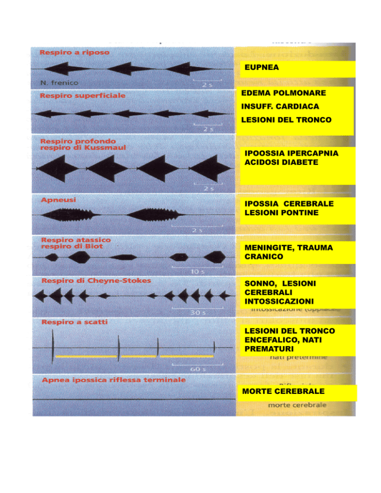EUPNEA EDEMA POLMONARE INSUFF. CARDIACA LESIONI DEL TRONCO IPOOSSIA IPERCAPNIA ACIDOSI DIABETE IPOSSIA CEREBRALE LESIONI PONTINE MENINGITE, TRAUMA CRANICO SONNO, LESIONI CEREBRALI INTOSSICAZIONI LESIONI DEL TRONCO ENCEFALICO, NATI PREMATURI MORTE CEREBRALE Controllo nervoso del respiro Che la respirazione dipenda dal SNC si ricava da: 1) lesioni cerebrali effettuate a diversi livelli inducono l’alterazione del respiro fino alla sua scomparsa. 2) quando nei soggetti comatosi scompare l’attività respiratoria si parla di morte cerebrale. La respirazione è un’attività automatica generata nel tronco encefalico da una attività neuronale per l’appunto automatica e ritmica che è capace di determinare il fisiologico alternarsi delle fasi respiratorie mediante i movimenti respiratori prodotti da muscoli scheletrici. L’attività automatica deve adattarsi a numerose condizioni: fonazione, canto, masticazione, deglutizione, sforzi fisici, emozioni, postura, deambulazione. L’attività automatica può essere modificata o interrotta dal controllo volontario. La respirazione è continuamente controllata e modificata in funzione di diverse richieste fisiologiche, fra queste la PCO2, PO2 e il pH. La respirazione è continuamente modulata da recettori presenti nelle vie aeree, responsabili di numerosi riflessi innescati sia da variazione di volume polmonare sia da sostanze chimiche. Fra questi riflessi, la tosse che è un atto respiratorio modificato, è un meccanismo di difesa delle vie aeree di vitale importanza. La rete neuronale in grado di generare il ritmo respiratorio è localizzata a livello bulbare e pontino. Attualmente si identificano queste strutture nervose con il termine di generatore centrale di pattern respiratorio. Questo termine viene utilizzato per definire una rete di neuroni che genera un pattern ripetuto e regolare di attività neuronale da cui dipende un’attività motoria ritmica come ad esempio la locomozione, la masticazione o come in questo caso la respirazione. Centri respiratori CI e CE Sappiamo che la respirazione non può avvenire senza l’intervento dei muscoli e quindi il primo contributo nervoso sarà rappresentato da: Motoneuroni della pompa respiratoria del midollo spinale : i muscoli respiratori che espandono e contraggono il torace sono innervati da motoneuroni del tratto mediocervicale e toracolombare; A) motoneuroni del frenico (innervano il diaframma, scaricano nell’inspirazione, liberano monoamine). B) motoneuroni respiratori toracici (innervano i muscoli intercostali, sono attivi durante l’attività dei frenici e dunque sono inspiratori). C) motoneuroni addominali (sono nel midollo spinale lombare e toracico, facilitano l’espirazione; durante la defecazione o l’emesi contraggono con il diaframma per aumentare la pressione addominale. Ci sono anche altri motoneuroni: Motoneuroni di resistenza craniali: sono nel nucleo ambiguo e proiettano al vago, innervano la muscolatura striata della laringe, faringe e quindi controllano la dilatazione o la costrizione delle vie aeree; le fibre pregangliari sono nel n. ambiguo, le postgangliari simpatiche sono sulle vie aeree; sono coinvolti recettori ßadrenergici, controllano la secrezione di muco; l’ipoglosso controlla la lingua, importante per la pervietà delle vie aeree; le ghiandole secernenti muco e la muscolatura liscia delle vie aeree sono innervate da neuroni parasimpatici postgangliari che aumentano la secrezione di muco e chiudono le vie aeree. Sono importanti nel controllo dei riflessi di difesa (tosse); modificano ampiezza, forma e durata del respiro. Ricordiamo che a livello periferico sono presenti anche delle Proiezioni sensoriali: Afferenze polmonari che hanno il soma nel ganglio nodoso e giugulare. Viaggiano nel nervo Vago e sinaptano con il Nucleo del Tratto Solitario nei nuclei dorsomediale e commissurale Meccanocettori: rilevano il volume polmonare e la velocità di inflazione. Chemocettori : rilevano lo stato del tessuto polmonare (PCO2, PO2, pH). Tuttavia queste componenti nervose non bastano a garantire l’attività respiratoria, che invece è garantita da una popolazione neuronale posta a livello bulbare (la scarica di questi neuroni è correlata alle fasi respiratorie) Le strutture nervose centrali coinvolte nella respirazione G G GABAa Fasi silenti NTS inspiratori espiratori NEURONI RESPIRATORI BULBARI 1) Il Gruppo respiratorio ventrale (GRV) è a ridosso del n. ambiguo (che contiene i motoneuroni che innervano la muscolatura striata della laringe e faringe….). E’ suddiviso in almeno quattro parti funzionalmente distinte. I neuroni che vi appartengono sono attivati sia durante l’inspirazione che l’espirazione. Nella parte più rostrale vi è il Complesso di Bötzinger costituito da neuroni GABAergici a funzione inibitoria (segnalano la fine espirazione e la fine inspirazione). In posizione più caudale è invece il Complesso del Pre-Bötzinger: la loro frequenza di scarica è correlata al ritmo respiratorio, hanno un’attività ritmica spontanea in fase con l’inizio e la fine del respiro; sono neuroni che generano il ritmo respiratorio; l’attività automatica li rende cellule pacemaker caratteristica questa che è presente solo nel neonato. 2)Il Gruppo Respiratorio Dorsale (GRD) E’ a ridosso del Nucleo del tratto solitario (NTS) che è costituito da interneuroni che ricevono le afferenze dalle vie respiratorie, dai polmoni (meccanocettori e chemocettori) e dal sistema cardiocircolatorio e quindi sono responsabili dell’adattamento del riflesso respirocircolo. E’ quindi coinvolto nei meccanismi di integrazione di afferenze vagali e non solo. Contiene neuroni inspiratori a rampa di 2 tipi: Rα neuroni bulbospinali che inviano le proiezioni ai motoneuroni spinali dei muscoli inspiratori e inviano anche proiezioni al GRV; Rβ hanno una scarica inspiratoria analoga agli Rα ma se l’input che proviene dai recettori da stiramento del polmone viene bloccato la 