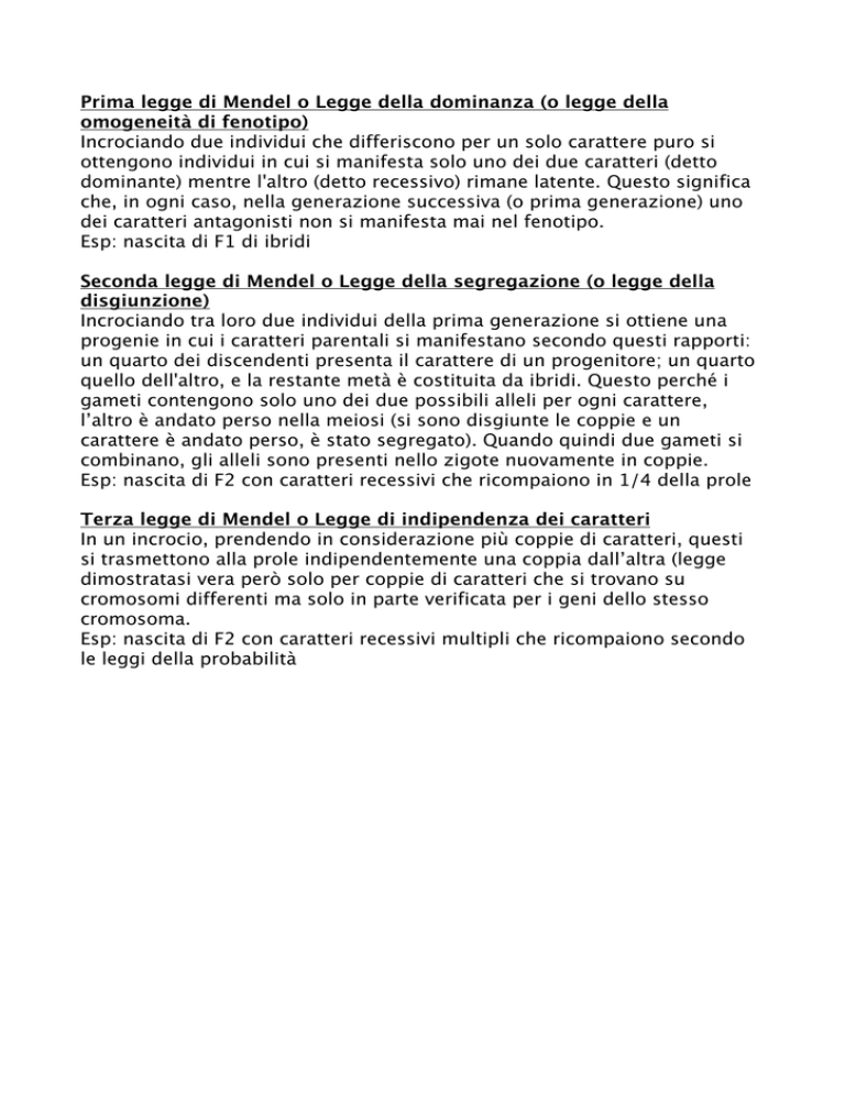 Prima legge di Mendel o Legge della dominanza (o legge della omogeneità di fenotipo) Incrociando due individui che differiscono per un solo carattere puro si ottengono individui in cui si manifesta solo uno dei due caratteri (detto dominante) mentre l'altro (detto recessivo) rimane latente. Questo significa che, in ogni caso, nella generazione successiva (o prima generazione) uno dei caratteri antagonisti non si manifesta mai nel fenotipo. Esp: nascita di F1 di ibridi Seconda legge di Mendel o Legge della segregazione (o legge della disgiunzione) Incrociando tra loro due individui della prima generazione si ottiene una progenie in cui i caratteri parentali si manifestano secondo questi rapporti: un quarto dei discendenti presenta il carattere di un progenitore; un quarto quello dell'altro, e la restante metà è costituita da ibridi. Questo perché i gameti contengono solo uno dei due possibili alleli per ogni carattere, l’altro è andato perso nella meiosi (si sono disgiunte le coppie e un carattere è andato perso, è stato segregato). Quando quindi due gameti si combinano, gli alleli sono presenti nello zigote nuovamente in coppie. Esp: nascita di F2 con caratteri recessivi che ricompaiono in 1/4 della prole Terza legge di Mendel o Legge di indipendenza dei caratteri In un incrocio, prendendo in considerazione più coppie di caratteri, questi si trasmettono alla prole indipendentemente una coppia dall’altra (legge dimostratasi vera però solo per coppie di caratteri che si trovano su cromosomi differenti ma solo in parte verificata per i geni dello stesso cromosoma. Esp: nascita di F2 con caratteri recessivi multipli che ricompaiono secondo le leggi della probabilità