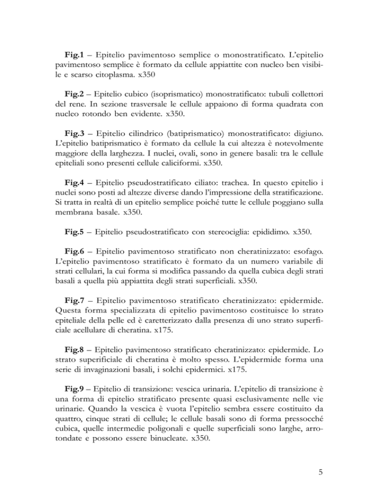 Fig.1 – Epitelio pavimentoso semplice o monostratificato. L’epitelio pavimentoso semplice è formato da cellule appiattite con nucleo ben visibile e scarso citoplasma. x350 Fig.2 – Epitelio cubico (isoprismatico) monostratificato: tubuli collettori del rene. In sezione trasversale le cellule appaiono di forma quadrata con nucleo rotondo ben evidente. x350. Fig.3 – Epitelio cilindrico (batiprismatico) monostratificato: digiuno. L’epitelio batiprismatico è formato da cellule la cui altezza è notevolmente maggiore della larghezza. I nuclei, ovali, sono in genere basali: tra le cellule epiteliali sono presenti cellule caliciformi. x350. Fig.4 – Epitelio pseudostratificato ciliato: trachea. In questo epitelio i nuclei sono posti ad altezze diverse dando l’impressione della stratificazione. Si tratta in realtà di un epitelio semplice poiché tutte le cellule poggiano sulla membrana basale. x350. Fig.5 – Epitelio pseudostratificato con stereociglia: epididimo. x350. Fig.6 – Epitelio pavimentoso stratificato non cheratinizzato: esofago. L’epitelio pavimentoso stratificato è formato da un numero variabile di strati cellulari, la cui forma si modifica passando da quella cubica degli strati basali a quella più appiattita degli strati superficiali. x350. Fig.7 – Epitelio pavimentoso stratificato cheratinizzato: epidermide. Questa forma specializzata di epitelio pavimentoso costituisce lo strato epiteliale della pelle ed è caretterizzato dalla presenza di uno strato superficiale acellulare di cheratina. x175. Fig.8 – Epitelio pavimentoso stratificato cheratinizzato: epidermide. Lo strato superificiale di cheratina è molto spesso. L’epidermide forma una serie di invaginazioni basali, i solchi epidermici. x175. Fig.9 – Epitelio di transizione: vescica urinaria. L’epitelio di transizione è una forma di epitelio stratificato presente quasi esclusivamente nelle vie urinarie. Quando la vescica è vuota l’epitelio sembra essere costituito da quattro, cinque strati di cellule; le cellule basali sono di forma pressocché cubica, quelle intermedie poligonali e quelle superficiali sono larghe, arrotondate e possono essere binucleate. x350. 5 Fig.10 – Cellule caliciformi. Le celule caliciformi sono ghiandole unicellulari a forma di calice, il cui citoplasma apicale contiene numerosi granuli mucosi. x350. Fig.11 – Ghiandole tubulari semplici (intestino crasso). Le ghiandole tubulari semplici hanno un andamento rettilineo, con un lume tubulare ristretto in cui vengono riversati i prodotti di secrezione. x175. Fig.12 – Ghiandole tubulari semplici ramificate (duodeno). Ogni ghiandola è formata da parecchie unità secernenti che convergono in un singolo dotto escretore. x90. Fig.13 – Ghiandole tubulari a gomitolo: ghiandole sudoripare apocrine. Queste ghiandole sono caratterizzate da una porzione secernente contorta con un lume molto ampio. x90. Fig.14 – Ghiandole tubulari a gomitolo: ghiandole sudoripare merocrine caratterizzate da una minore ampiezza del lume ghiandolare. x100. Fig.15 – Ghiandole acinose semplici ramificate: ghiandole sebacee. Ogni ghiandola è formata da una serie di acini che riversano il loro secreto nel fusto del pelo. x90. Fig.16 – Ghiandola tubulo-acinosa composta: mandibolare. Le ghiandole composte sono caratterizzate dalla presenza di lobuli delimitati da tessuto connettivo e dotti escretori ramificati. x90. Fig.17 – Ghiandola tubulo acinosa composta a secrezione sierosa: parotide. Sono presenti acini sierosi e dotti striati. In questi ultimi è evidente la striatura basale. x175. Figg.18 e 19 – Ghiandola tubulare composta a secrezione mista: mandibolare. Gli acini mucosi, debolmente colorati, sono rivestiti da semilune sierose formate da cellule più intensamente colorate con nuclei evidenti. x350. Fig.19 inserti – Ghaindola acinosa composta a secrezione sierosa: pancreas. Le ghiandole acinose composte sono caratterizzate da acini secernenti che versano il loro secreto in un sistema ramificato di dotti escretori. x175; x90. 6 Fig.20 – Ghiandola alveolare composta: ghiandola mammaria in attività. Il parenchima ghiandolare è molto sviluppato rispetto al tessuto connettivo e risulta costituito da alveoli fortemente distesi. x90. Fig.21 – Ghiandola tubulo-alveolare composta: prostata. Fig.22 – Connettivo lasso e mastociti con i caratteristici granuli metacromatici. x175. Fig.23 – Connettivo compatto irregolare: derma. I fasci di fibre collagene sono disposti irregolarmente. x90. Fig. 24 – Connettivo compatto regolare: tendine. Nei tendini e nei legamenti le fibre collagene hanno un andamento parallelo. I fibroblasti sono disposti tra le varie fibre. x90. Fig.25 – Connettivo reticolare: linfonodo (impregnazione argentica). Il connettivo reticolare forma una delicata rete di supporto per molti organi ad elevata cellularità. x850. Fig.26 – Connettivo elastico: parete di un’arteria. L’elastina forma strati molto spessi a conformazione ondulata. x350. Fig.27 – Tessuto adiposo bianco. Il contenuto lipidico degli adipociti è stato rimosso durante l’allestimento del preparato lasciando una cavità vuota circondata da un sottile strato di citoplasma. x175. Fig.28 – Tessuto adiposo bruno. Le cellule adipose contengono una serie di piccole gocce lipidiche e un nucleo ben evidente. x350. Fig. 29 – Sangue cane: neutrofilo (freccia) ed eosinofilo. La caratteristica più saliente è data dal nucleo plurilobato; gli eosinofili sono facilmente riconoscibili grazie alla presenza di numerosi granuli citoplasmatici che si colorano in rosso vivo con l’eosina. x850. Fig.30 – Sangue cavallo: eosinofilo. Gli eosinofili del cavallo hanno caratteristici granuli grandi e rotondi. Notare i rouleaux comuni nel cavallo. x850. Fig.31 – Sangue cane: neutrofili e lnfocita (freccia). I linfociti sono carat- 7 terizzati da un nucleo grande, intensamente colorato e da una piccola quantità di citoplasma. x850. Fig.32 – Sangue capra