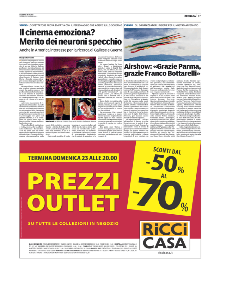 CRONACA 17 VENERDÌ 21 GIUGNO 2013 STUDIO LO SPETTATORE PROVA EMPATIA CON IL PERSONAGGIO CHE AGISCE SULLO SCHERMO EVENTO GLI ORGANIZZATORI: INSIEME PER IL NOSTRO APPENNINO Il cinema emoziona? Merito dei neuroni specchio Anche in America interesse per la ricerca di Gallese e Guerra Margherita Portelli II Quando si spengono le luci in sala, i neuroni specchio entrano in scena. L’arte emoziona, e questo si sa, ma Vittorio Gallese, professore del dipartimento di Neuroscienze dell’Università di Parma esperto di neuroestetica, e Michele Guerra, ricercatore in discipline cinematografiche nel dipartimento di Lettere, Arti, Storia e Società, cercano di capire come e di spiegare perché, e lo fanno attraverso studi sul cervello. Oggetto di una ricerca che i due studiosi stanno portando avanti da qualche anno, e che poche settimane fa è stata ripresa in un articolo di approfondimento dell’edizione americana dell’Huffington Post, è il legame tra il cinema e le neuroscienze. Attraverso meccanismi di rispecchiamento (Gallese fa parte del team del professor Rizzolatti che agli inizi degli anni Novanta fu protagonista della clamorosa scoperta dei neuroni specchio) lo spettatore prova empatia con il personaggio che agisce sul grande schermo, e si fa contagiare da quello stesso tipo di emozione che l’attore sta simulando di provare. Un confine labile tra finzione e realtà, questo, che ha affascinato moltissimo i due studiosi. «Fin dai primi anni del Novecento gli psicologi hanno tentato di interpretare l’impatto dell’immagine cinematografica sulla sensazioni trasmesse dall’opera d’arte vengano simulate nella corteccia cerebrale degli osservatori. Ad essere baciata da Humphrey Bogart a Casablanca, quindi, è stata sì Ingrid Bergman, ma, di riflesso, lo sono state anche tutte le sospiranti spettatrici. E l’emozione è comprensibile. Restituire in poche righe il valore di una ricerca lunga anni non è semplice, ma, per rendere più semplice possibile il concetto, potremmo dire che, ad essere analizzata scientificamente è la capacità di empatizzare con ciò che si percepisce. «Il cinema dispiega ad altissimi livelli queste “simulazioni” - aggiunge Guerra -, ed è forse per questo che la settima arte ci emoziona talvolta più delle altre». Karin Badt, giornalista della testata americana ed esperta di scienza e cinema, lo scorso aprile ha passato qualche giorno a Parma per approfondire la ricerca dei due studiosi. La scommessa è fare esperimenti per vedere se le neuroscienze possano meglio chiarire aspetti legati allo stile e alla ricezione del film. Queste ricerche Buio in sala In alto, un cinema. Sopra, da sinistra, Gallese e Guerra. permetteranno anche di definire meglio il confine tra reale e mente dello spettatore - accenna imaging, si possono studiare gli virtuale. Guerra -; si tratta di studi portati effetti che la visione di un film Tra pochi mesi Gallese e avanti a periodi alterni, perché ci causa nel cervello dello spetta- Guerra consegneranno un libro sono stati momenti in cui si è tore». Forte della sua esperien- contenente gli esiti della loro riescluso di poter studiare le emo- za, Gallese si è a lungo occupato cerca. I titoli di coda si preanzioni. di neuroestetica, ipotizzando nunciano particolarmente inteOggi, con le tecniche di brain che le azioni, le emozioni e le ressanti. Airshow: «Grazie Parma, grazie Franco Bottarelli» II Il cielo ha dato spettacolo e ha teso la mano alla terra, con l'Airshow di domenica 9. Organizzare l'evento di solidarietà per l'Appennino ferito dalle frane è stato un bell'impegno di gruppo, anzi di squadriglia, con tanto di acrobazie, perché il grande volo è stato contro una serie di difficoltà, oltre che contro il tempo. Ora, per l'Aeroclub e la Sogeap, uniti dal successo della manifestazione, è il momento di dire grazie. A Parma e a Franco Bottarelli, il presidente del «Bolla» che - malato e stanco, ma ancora pieno di spirito d'intraprendenza - è riuscito a vivere la domenica con il sigillo delle Frecce tricolori, per lasciare questo mondo il venerdì seguente. «L’organizzazione, affidata all’aeroclub di Parma in collaborazione con la società di gestione aeroportuale Sogeap, ha dimostrato come il lavoro di gruppo possa realizzare, in breve tempo, un grande evento» sottolinea chi si è impegnato per la riuscita dell'Airshow. «Siamo orgogliosi di aver ospitato un evento così prestigioso per la nostra provincia, una manifestazione che è anche testimonianza di vicinanza alle popolazioni dell’Appennino, colpite dalle frane, un modo per dire loro che non vengono lasciati soli». Quindi, il grazie di Aeroclub e Sogeap va a chi ha fatto parte della squadra dell'Airshow: Prefettura, Comune, Provincia, Questura, Comando provinciale dei Carabinieri, Comando provinciale della Guardia di finanza, Comando dell’VIII zona della Polizia di frontiera area Bologna, Comando provinciale forestale dello Stato, Comando provinciale dei Vigili del fuoco, Comando della sezione Polizia stradale, Comando Polizia municipale, Comando Rete Pol Nato, Protezione civile, Assistenza pubblicaCroce Rossa italiana, Direttori di manifestazione, Aeronautica militare, 313° gruppo della Pattuglia acrobatica nazionale, 311° gruppo volo del Reparto sperimentale, 15° gruppo Sar, 50° stormo di Piacenza San Damiano, Enac, Enav, Azienda unità sanitaria locale, Azienda ospedaliera università di Parma, Centrale operativa 118, Iren, Anas, Apa, Tep, Fiere di Parma, Società di gestione Aeroporto di Parma, Barilla, Assiparma, Ab Global Service, Airbp, Emiliana Trasporti, Ermes Fontana salumi, Gommista Gonizzi Carlo, Neacar, Scar, Soncini attrezzature per Salumifici di Langhirano, Sts, Tipocrom, Paolo Peroni, Parma Infrastrutture, Consorzio Agrario, Mediolanum Private Banking, la «Gazzetta di Parma» e gli organi di stampa venuti da tutt'Italia, per l’ottima copertura mediatica, Sviluppi immobiliari parmensi, gli alberghi San Marco e Parma & Cong