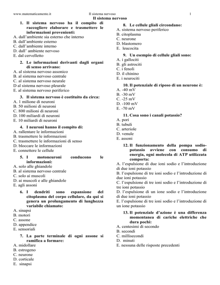 www.matematicamente.it Il sistema nervoso 1 Il sistema nervoso 1. Il sistema nervoso ha il compito di 8. Le cellule gliali circondano: raccogliere elaborare e trasmettere le A. sistema nervoso periferico informazioni provenienti: B. citoplasma A. dall’ambiente sia esterno che interno C. neurone B. dall’ambiente esterno D. blastomero C. dall’ambiente interno E. leucocita D. dall’ ambiente nervoso 9. Un esempio di cellule gliali sono: E. dal cervelletto A. i gallociti 2. Le informazioni derivanti dagli organi B. gli astrociti di senso arrivano: C. i fenoli A. al sistema nervoso assonico D. il chinino B. al sistema nervoso centrale E. i neurociti C. al sistema nervoso neurale 10. Il potenziale di riposo di un neurone è: D al sistema nervoso pleurale A. -40 mV E. al sistema nervoso periferico B. -30 mV 3. Il sistema nervoso è costituito da circa: C. -25 mV A. 1 milione di neuroni D. -100 mV B. 50 milioni di neuroni E. -70 mV C. 800 milioni di neuroni 11. Cosa sono i canali potassio? D. 100 miliardi di neuroni A. pori E. 10 miliardi di neuroni B. tubuli 4. I neuroni hanno il compito di: C. arteriole A. rallentare le informazioni D. venule B. trasmettere le informazioni E. assoni C. trasmettere le informazioni di senso 12. Il funzionamento della pompa sodioD. bloccare le informazioni potassio avviene con consumo di E. connettere le cellule energia, ogni molecola di ATP utilizzata 5. I motoneuroni conducono le comporta: informazioni: A. l’espulsione di due ioni sodio e l’introduzione A. solo alle ghiandole di due ioni potassio B. al sistema nervoso centrale B. l’espulsione di tre ioni sodio e l’introduzione di C. solo ai muscoli due ioni potassio D. ai muscoli e alle ghiandole C. l’espulsione di tre ioni sodio e l’introduzione di E. agli assoni tre ioni potassio D. l’espulsione di un ione sodio e l’introduzione 6. I dendriti sono espansione del di due ioni potassio citoplasma del corpo cellulare, da qui si E. l’espulsione di tre ioni sodio e l’introduzione di genera un prolungamento di lunghezza un ione potassio variabile chiamato: A. sinapsi 13. Il potenziale d’azione è una differenza B. motori momentanea di cariche elettriche che C. assone dura pochi: D. appendice A. centesimi di secondo E. sensoriali B. secondi 7. La parte terminale di ogni assone si ramifica a formare: A. midollare B. estrogeno C. neurone D. corticale E. sinapsi C. millisecondi D. minuti E. nessuna delle risposte precedenti www.matematicamente.it Il sistema nervoso 14. I canali del sodio, durante il potenziale d’azione, restano aperti per poco tempo, periodo chiamato: A. dendritico B. naturale C. essenziale D. nervoso E. depolarizzazione 15. L’assone è avvolto da una speciale guaina mielinica, chiamata: A. nevralgica B. di Brown C. di Schwann D. ferrica E. nessuna delle risposte proposte è esatta 16. Lungo l’assone si ripetono particolari punti detti nodi: A. lipidici B. rameici C. nevralgici D. di Ranvier E. di Shulmann 17. L’impulso nervoso viaggia da un nodo all’altro aumentando la sua velocità arrivando a: A. 120m/s B. 180m/s C. 110m/s D. 80m/s E. 60m/s 2 18. La sinapsi chimica presenta vescicole che contengono: A. malanomi chimici B. assoni chimici C. mediatori chimici D. trombociti E. nessuna delle risposte precedenti delle 19. Il sistema nervoso centrale è rivestito da tre membrane che sono: A. dura madre, aracnoide e cisto B. dura madre, arallide e pura madre C. tronco encefalico, aracnoide e dura madre D. dura madre, aracnoide e pia madre E. duro padre, aracnide e pia madre 20. Il talamo è la parte più sviluppata del: A. astroencefalo B. ippocampo C. cervelletto D. encefalo E. diencefalo www.matematicamente.it Il sistema nervoso 3 1. RISPOSTA: A 2. RISPOSTA: B Sistema nervoso centrale (SNC) o nevrasse è la parte del sistema nervoso degli animali bilateri che è situata all'interno della cavità dorsale, suddiviso in encefalo, posto nella scatola cranica, e midollo spinale, situato nel canale vertebrale. Funzionalmente, esso riceve, integra ed elabora gli stimoli afferenti provenienti dal sistema nervoso periferico e coordina gli stimoli efferenti verso di esso 3. RISPOSTA: D 4. RISPOSTA: B Il neurone è l'unità cellulare che costituisce il tessuto nervoso, il quale concorre alla formazione, insieme al tessuto della nevroglia e al tessuto vascolare, del sistema nervoso. Grazie alle sue peculiari proprietà fisiologiche e chimiche è in grado di ricevere, integrare e trasmettere impulsi nervosi, nonché di produrre sostanze denominate neurosecreti. 5. RISPOSTA: D COMMENTO: L'assone o neurite è un conduttore di impulsi in direzione centrifuga rispetto al corpo cellulare. Ogni neurone ha unicamente un assone. L'assone si comporta come un conduttore elettrico; infatti grazie alla presenza di alcuni ioni come sodio, cloro, calcio epotassio, viene creato un flusso ionico che genera una corrente elettrica. Quando arriva un impulso elettrico, questo, percorre l'assone. 6. RISPOSTA: C Mentre i dendriti ricevono segnali da altri neuroni e li portano al corpo cellulare, l’assone li trasmette ad altre cellule. 7. RISPOSTA: E 8. RISPOSTA: C Le cellule della glia, dette anche cellule gliali o nevroglia, sono cellule che, assieme ai neuroni, costituiscono il sistema nervoso. Hanno funzione nutritiva e di sostegno per i neuroni, assicurano l'isolamento dei tessuti nervosi e la protezione da corpi estranei in caso di lesioni. 9. RISPOSTA: B 10. RISPOSTA: E 11. RISPOSTA: A Il canale del potassio o specificando meglio, i vari tipi di canali del potassio sono proteine integrali di membrana che formano canali ionici, che conducono i cationi del potassio (K+) attraverso la membrana plasmatica delle cellule. I canali del potassio sono il tipo più diffuso di canale ionico e si trovano in quasi tutti gli organismi viventi. 12. RISPOSTA: B La pompa sodio-potassio, detta anche pompa Na+/K+ ATP dipendente + + (Na /K ATPasi), è un enzima che si trova nella membrana delle cellule. Questo ti