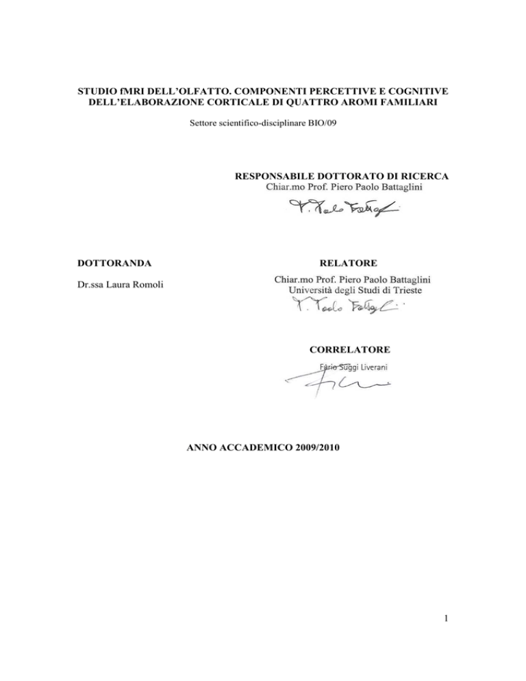 STUDIO fMRI DELL’OLFATTO. COMPONENTI PERCETTIVE E COGNITIVE DELL’ELABORAZIONE CORTICALE DI QUATTRO AROMI FAMILIARI Settore scientifico-disciplinare BIO/09 RESPONSABILE DOTTORATO DI RICERCA DOTTORANDA RELATORE Dr.ssa Laura Romoli CORRELATORE ANNO ACCADEMICO 2009/2010 1 CAPITOLO 1 Premessa Pag.5 Obiettivi Pag.6 Interesse dello studio Pag.7 Limiti dello studio Pag.8 CAPITOLO 2 Introduzione Pag.9 Il sistema olfattivo Pag.9 Percezione e olfatto Pag.10 Detenzione Pag.10 Riconoscimento Pag.11 Cognizione e olfatto Pag.11 Memoria e olfatto Pag.12 Emozioni e olfatto Pag.14 Linguaggio e olfatto Pag.15 Edonismo e olfatto Pag.16 Tecnica Pag.17 Imaging cerebrale Pag.17 2 la risonanza magnetica funzionale Pag.18 L’effetto BOLD Pag.18 CAPITOLO 3 Materiali e metodi Pag.21 Soggetti Pag.21 Esame RM Pag.21 Olfattometro Pag.22 Stimoli Pag.23 Gli aromi utilizzati Pag.23 Aromi ecologici e trattati Pag.25 Paradigma sperimentale Pag.26 Software di analisi Pag.27 Timing di analisi Pag.31 CAPITOLO 4 Risultati Pag.32 Whole Brain Pag.32 3 Aromi ecologici vs trattati Pag.39 Aromi trattati vs ecologici Pag.41 During vs after e after vs during Pag.43 CAPITOLO 5 Discussione Pag.48 Appendice A Pag.56 Ringraziamenti Pag.59 Bibliografia Pag.60 4 1. PREMESSA L’olfatto, insieme al gusto, è il senso che maggiormente lega la specie umana con le altre specie animali. Olfatto e gusto hanno un forte valore evolutivo, sono sistemi d’allarme, fondamentali per la sopravvivenza dell’individuo e della specie. Quest’importanza evolutiva dipende dal fatto che sono in grado di estrarre informazioni chimiche dall’ambiente che permettono all’individuo di valutare eventuali rischi legati all’assunzione di cibi potenzialmente tossici o dannosi. Anatomicamente questo legame con le altre specie animali è evidenziato dal substrato anatomico sottendente i sensi chimici, ossia il sistema limbico, la parte filogeneticamente più arcaica dell’encefalo, da cui dipendono gli istinti, le emozioni e gli appetiti dell’essere umano e delle altre specie animali. Tuttavia, nella specie umana, i sensi chimici coinvolgono anche la parte filogeneticamente più recente dell’encefalo, ossia la corteccia prefrontale (orbitofrontale). Questa struttura corticale è alla base della potente risposta edonistica evocata da stimoli gustativi ed olfattivi. Nonostante il coinvolgimento della parte più antica del cervello, a oggi, i sensi chimici sono i sensi meno compresi, specie a livello cognitivo. In parte, questa mancanza deriva dalla tradizione medico-scientifica, che ha privilegiato, nei secoli, lo studio di altre modalità sensoriali, in primis quella visiva. Fra i sensi speciali, l’olfatto è rimasto, ancor più del gusto, il senso più misterioso e negletto, rimanendo legato maggiormente alla curiosità e alla tradizione letteraria. Eppure, per vari motivi, lo studio dell’olfatto ha avuto un ruolo spesse volte cruciale nella ricerca neuroscientifica. Basti pensare che nei mammiferi l’olfatto propone il rapporto anatomico più stretto ed immediato fra recettore e corteccia cerebrale , e in un certo senso, quindi, tra cervello e mondo esterno. È il senso necessario per interpretare le segnalazioni dell’accoppiamento nel mondo animale (anche nella specie umana, seppur in misura minore e soprattutto inconsapevole in quanto, le molecole odorose sono rilasciate dalle femmine nella fase recettiva dell’estro e non sono segnali presenti anche in altri periodi come, invece, quelli visivi). L’olfatto, è un modello di informazione sensoriale direttamente integrata con il gusto che agisce sul comportamento prevalentemente attraverso processi non coscienti. 5 Negli ultimi decenni l’interesse per lo studio dell’olfatto si è risvegliato, ed ha, progressivamente, acquistato notorietà nello scenario scientifico, conclamato dall’assegnazione del premio Nobel nel 2004 a Richard Axel e Linda Buck per l’individuazione di una vasta famiglia di geni dei recettori dell’olfatto, definendone alcuni principi di fisiologia. 1.1 OBIETTIVI Lo scopo del lavoro sperimentale descritto in questa tesi è lo studio dei processi percettivi, cognitivi e semantici dell’elaborazione olfattiva di quattro aromi familiari: agrumi, caffè, cioccolato e fiori. I quattro aromi sono stati scelti come rappresentanti di categorie olfattive note, comuni e familiari in modo da poter equiparare a priori il grado di complessità semantica associata a ciascun aroma. Quest’aspetto è il cardine dello studio, in quanto, l’interesse alla base dell’esperimento è indagare come il cervello elabora non solo gli aspetti percettivi degli stimoli olfattivi, bensì anche le caratteristiche semantiche, cognitive ed edonistiche. Nonostante le aumentate conoscenze specifiche, la comprensione di come il cervello umano elabori gli stimoli olfattivi rimane per gran parte un mistero, specie nelle ultime fasi di elaborazione corticali, ossia quando lo stimolo olfattivo raggiunge la corteccia prefrontale nota per la complessità delle funzioni cognitive da essa dipendenti, tra cui l’attribuzione di un giudizio edonistico, e di un’etichetta semantica descrivente lo stimolo. La scelta dei quattro aromi utilizzati deriva dalla necessità di categorizzare, in qualche modo, gli stimoli non essendo possibile, come per il gusto (senso speciale “fratello” dell’olfatto, in quanto anch’esso trasduce informazioni chimiche) individuare categorie basiche e principali. L’idea di scegliere il caffè, il cioccolato, l’agrumi e i fiori, deriva da una scelta basata su quello che può essere considerato un “immaginario collettivo”, in cui a noi tutti gli stimoli scelti risultano familiari, conosciuti e riconoscibili (per lo meno nel mondo Occidentale); è difficile pensare che si possa crescere senza familiarizzare con gli aromi scelti. 6 I quattro aromi tuttavia, seppur equiparabili per familiarità, sono divisibili in due categorie e contraddistinti, ognuno, da peculiar