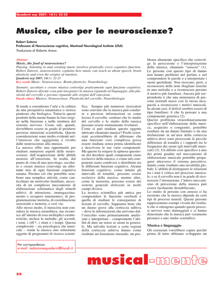 Quaderni acp 2007; 14(1): 22-25 Musica, cibo per le neuroscienze? Robert Zatorre Professore di Neuroscienze cognitive, Montreal Neurological Institute (USA) Traduzione di Roberta Arena Abstract Music, the food of neuroscience? Playing, listening to and creating music involves pratically every cognitive function. Robert Zatorre, neuroscientist, explains how music can teach us about speech, brain plasticity and even the origins of emotion. Quaderni acp 2007; 14(1): 22-25 Key words Music. Neuroscience. Brain plasticity. Neurobiology Suonare, ascoltare e creare musica coinvolge praticamente ogni funzione cognitiva. Robert Zatorre discute cosa può insegnarci la musica riguardo al linguaggio, alla plasticità del cervello e persino riguardo alle origini dell’emozione. Parole chiave Musica. Neuroscienze. Plasticità del cervello. Neurobiologia Si tende a considerare l’arte e la cultura da una prospettiva umanistica o storica piuttosto che biologica. Tuttavia questi prodotti della mente hanno la loro origine nella funzione e nella struttura del sistema nervoso. Come tali, quindi, dovrebbero essere in grado di produrre preziose intuizioni scientifiche. Queste considerazioni sono molto evidenti nell’interesse che oggigiorno è rivolto dalle neuroscienze alla musica. La musica offre una opportunità per studiare numerosi aspetti delle neuroscienze: dall’acquisizione delle abilità motorie all’emozione. In realtà, dal punto di vista di uno psicologo, ascoltare e creare musica coinvolge un allettante mix di ogni funzione cognitiva umana. Persino ciò che potrebbe sembrare una semplice attività, come canticchiare un motivetto familiare, necessita di un complesso meccanismo di elaborazione schematica degli stimoli uditivi, di attenzione, immagazzinamento e recupero mnemonico, di programmazione motoria, di coordinazione sensoriale e motoria, e così via. Allo stesso modo, il musicista non considera la musica monolitica, ma riconosce all’interno di essa molteplici caratteristiche, incluse le melodie, gli accordi, i temi, i riff *, i ritmi e i tempi. Questa complessità – sia psicologica che musicale – rende la musica uno stimolante oggetto di programmi di ricerca scientiPer corrispondenza: e-mail: [email protected] 22 fica. Sempre più numerosi ricercatori sono convinti che la musica può condurre a preziose informazioni su come lavora il cervello: credono che lo studio del cervello e lo studio della musica possano essere mutuamente rivelatori. Come si può studiare questo oggetto intricato chiamato musica? Pochi scienziati accetterebbero di affermare che una funzione così complessa possa essere studiata senza prima identificare e descrivere le sue varie componenti. Ma questo fa sorgere la spinosa questione del decidere quali componenti siano esclusive della musica, e come tali componenti siano condivise o distribuite tra le differenti funzioni cognitive. Alcune funzioni cognitive, come intuire gli intervalli di tonalità, possono essere esclusive della musica, mentre altre, come la memoria, possono essere dei sistemi generali utilizzati in molti campi diversi. La tecnica scientifica più antica per comprendere le funzioni cerebrali è quella di studiare le conseguenze di lesioni al cervello. Sappiamo bene che un danno grave alla corteccia uditiva – dove le informazioni che arrivano dall’orecchio sono primariamente analizzate e interpretate – compromette l’abilità di dare un senso ai suoni in generale. Ma talvolta lesioni a certe regioni della corteccia uditiva danno come risultato un fenomeno inusuale: un pro- blema altamente specifico che coinvolge la percezione e l’interpretazione della musica, chiamato “amusia” (1). Le persone con questo tipo di danno non hanno problemi nel parlare e nel comprendere le parole o a interpretare i suoni quotidiani. Non riescono, però, a riconoscere delle note sbagliate inserite in una melodia o a riconoscere persino il motivo più familiare. Ancora più sorprendente è che una minoranza di persone normali nasce con la stessa incapacità a riconoscere i motivi musicali. In alcuni casi, il deficit sembra essere di tipo familiare: il che fa pensare a una componente genetica (2). Questo problema straordinariamente specifico nell’elaborazione della musica, acquisito o congenito, potrebbe risultare da un danno limitato o da una disfunzione in un’area della corteccia uditiva dove sono processate le piccole differenze di tonalità e i rapporti tra le frequenze dei suoni (gli intervalli musicali) (3). Un difetto così specifico a uno dei primi gradini nel meccanismo di elaborazione musicale potrebbe propagarsi attraverso il sistema percettivo, dando come risultato una invalidità globale. L’abilità di distinguere le relazioni tra i toni è critica nel processo musicale, e se il cervello non è in grado di riconoscere l’intonazione, l’intero meccanismo di percezione della musica può essere facilmente destabilizzato. Lo studio di persone con amusia ci ha mostrato che la musica dipende da certi tipi di processi neurali. Queste persone rappresentano esempi viventi dei risultati che si ottengono quando questi processi nervosi sono danneggiati e ci hanno dimostrato che la musica può veramente prestarsi a uno studio scientifico. Musica e linguaggio Gli scienziati vorrebbero capire perché prima di tutto abbiamo sviluppato un musical-mente senso per la musica e, in particolare, se l’abilità musicale è in qualche modo un’estensione della parola: molti hanno discusso di questo argomentando ragionevolmente che la musica e il linguaggio condividono le molte similitudini strutturali. Così i ricercatori hanno provato, usando varie tecniche, a determinare fino a che punto l’elaborazione della musica e quella della parola condividono le medesime risorse nervose. I risultati ottenuti finora sono in un certo senso contrastanti, ma anche intriganti. Una delle cose che più colpisce, riguardo al processo di elaborazione neurobiologico del li