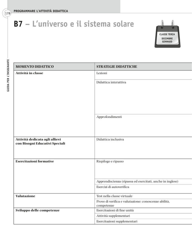 178 programmare l’attivitÀ didattica b7 – l’universo e il sistema solare claSSe terza guida per l’iNSegNaNte dicembre geNNaio MOMENTO DIDATTICO STrATEgIE DIDATTIChE Attività in classe Lezioni Didattica interattiva Approfondimenti Attività dedicata agli allievi con Bisogni Educativi Speciali Didattica inclusiva Esercitazioni formative Riepilogo e ripasso Apprendiscienza(ripassaedesercitati,ancheininglese) Esercizi di autoverifica Valutazione Test nella classe virtuale Sviluppo delle competenze Prove di verifica e valutazione: conoscenze abilità, competenze Esercitazioni di fine unità Attività supplementari Esercitazioni supplementari lesson plan classe terza 179 obiettivi di apprendimento e traguardi per lo sviluppo delle competenze ABILITà • Ricavare informazioni • Osservare e formulare ipotesi • Completareschemi • Calcolare • Individuare somiglianze e differenze • Mettere in relazione COMPETENzE • Interpretare fenomeni • Interpretare modelli • Science in English rISOrSE DOVE TrOVArLE 1.L’Universo-2. I corpi celesti - 3. Il Sistema Solare - 4. I pianeti del Sistema Solare - 5. Asteroidi, meteore e comete ➞ UnitàB7,VolumeeME•book,pp.B109-B125 Confrontaletueideeconquelledeituoicompagni ➞ UnitàB7,VolumeeME•book,p.B109 Attivazioni ➞ UnitàB7,VolumeeME•book,pp.B110,B113,B118, B121,B124 Impara con le immagini ➞ UnitàB7,VolumeeME•book,pp.B115,B119 Leparoledellascienza:glossarioitaliano-inglese ➞ UnitàB7,VolumeeME•book,pp.B110,B112,B116, B117 Esplora la figura ➞ UnitàB7,VolumeeME•book,p.B120 Scienza e vita quotidiana: - La leggenda delle stelle cadenti ➞ UnitàB7,VolumeeME•book,p.B125 Video: - L’astronomia di Galileo - Misurare il tempo con la meridiana Il Sistema Solare ➞ UnitàB7,VolumeeME•book Scheda didattica dei video ➞ Guidaperl’insegnante,pp.79,80,103 B7–L’UniversoeilSistemaSolare ➞ Volume Scienze facili eME•book(+VerificheFacilitate) Text to speech ➞ ME•bookScienze facili con text to speech Impara con le immagini ➞ UnitàB7,VolumeeME•book,pp.B115,B119 Esplora la figura ➞ UnitàB7,VolumeeME•book,p.B120 Impara con il testo ➞ UnitàB7,VolumeeME•book,pp.B112,B117,B120, B121,B125 Interroga la mappa e mappa interattiva: L’Universo - Il Sistema Solare ➞ UnitàB7,VolumeeME•book,p.B126 Esercizi di conoscenze e abilità ➞ UnitàB7,VolumeeME•book,pp.B126,B127 - Il Sistema Solare - Il Sole - I satelliti ➞ CampusdiMatematicaeScienze Batteria di test interattivi autocorrettivi per lo studente ➞ Libro+Web,CampusdiMatematicaeScienze, ME•book,pp.B126,B127 Batteria di test interattivi con registro virtuale per l’insegnante ➞ Libro+Web Verifiche Unità B7 ➞ Guidaperl’insegnante,pp.296,297 Esercizi di competenze di fine unità ➞ UnitàB7,VolumeeME•book,p.B128 Dove e quando? ➞ Guidaperl’insegnante,p.225 Prova 5 Classe terza ➞ Guidaperl’insegnante,pp.250,251 programmare l’attivitÀ didattica CONOSCENzE • L’Universoeleipotesisullasuaorigineedevoluzione • Lecaratteristichedinebulose,stelle,costellazioni,pianeti e galassie • LeleggidiKepleroelagravitazioneuniversale • Il Sole e i pianeti del Sistema Solare: nomi e caratteristiche • I corpi celesti minori: asteroidi, meteoriti e comete