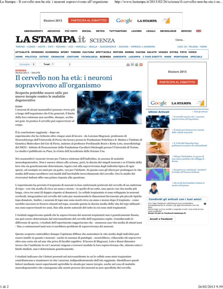 La Stampa - Il cervello non ha età: i neuroni sopravvivono all’organismo 1 di 2 ABBONAMENTI ARCHIVIO PIÙ VISTI SOCIAL METEO http://www.lastampa.it/2013/02/26/scienza/il-cervello-non-ha-eta-i-ne... TUTTOAFFARI LAVORO LEGALI NECROLOGIE SERVIZI Cerca... TORINO - CUNEO - AOSTA - ASTI - NOVARA - VCO - VERCELLI - BIELLA - ALESSANDRIA - SAVONA - IMPERIA e SANREMO VOCI DI: MILANO - ROMA ATTUALITÀ OPINIONI ECONOMIA SPORT TORINO CULTURA SPETTACOLI MOTORI DONNA CUCINA SALUTE VIAGGI EXTR@ FOTO VIDEO HOME POLITICA Consiglia ESTERI 9 Tweet CRONACHE COSTUME 1 TECNOLOGIA SCIENZA AMBIENTE LAZAMPA I TUOI DIRITTI MARE MONTAGNA SPECIALI 2 SCIENZA 26/02/2013 - SALUTE Scoperta potrebbe essere utile per nuove terapie contro le malattie degenerative ROMA I neuroni di alcuni mammiferi possono vivere più a lungo dell’organismo che li ha generati, il limite della loro esistenza non sarebbe, dunque, scritto nei geni. In pratica il cervello può sopravvivere al corpo. È la conclusione raggiunta - dopo un esperimento che ha richiesto oltre cinque anni di lavoro - da Lorenzo Magrassi, professore di Neurochirurga dell’Università di Pavia che lavora presso la Fondazione Policlinico S. Matteo e l’Istituto di Genetica Molecolare del Cnr di Pavia, insieme al professor Ferdinando Rossi e Ketty Leto, neurofisiologi del NICO - Istituto di Neuroscienze della Fondazione Cavalieri Ottolenghi presso l’Università di Torino. Lo studio è pubblicato su Pnas, la rivista dell’Accademia delle Scienze Usa. Nei mammiferi i neuroni vivono per l’intera esistenza dell’individuo, in assenza di malattie neurodegenerative. Non è ancora chiara alla scienza, però, la durata dei singoli neuroni e se il limite della loro vita sia geneticamente determinato, legato cioè alla sopravvivenza degli individui tipica di ogni specie, ad esempio 20 anni per un gatto, 120 per l’elefante. In questo caso gli sforzi per prolungare la vita media dell’uomo sarebbero resi inutili dall’inevitabile invecchiamento del cervello. Ora lo studio dei ricercatori italiani offre una prima risposta alla questione. L’esperimento ha previsto il trapianto di neuroni in fase embrionale prelevati dal cervello di un embrione di topo - con vita media di circa un anno e mezzo - in quello di un ratto, una specie con vita media più lunga, circa tre anni (il doppio rispetto al donatore). Le cellule trapiantate si sono sviluppate in neuroni cerebrali, integrandosi nel cervello del ratto pur mantenendo le dimensioni lievemente più piccole tipiche topo donatore. Inoltre, i neuroni di topo non sono morti circa un anno e mezzo dopo il trapianto - come sarebbe successo se fossero rimasti nel topo, essendo questa la durata media della vita dei topi utilizzati ma sono sopravvissuti tre anni, fino alla morte naturale del ratto in cui sono stati trapiantati. I risultati suggeriscono quindi che la sopravvivenza dei neuroni trapiantati non è geneticamente fissata, ma può essere determinata dal microambiente del cervello dell’organismo ospite. Considerando le differenze di specie, i risultati dell’esperimento suggeriscono che - ammessa una vita media di ottant’anni - fino a centosessant’anni non ci sarebbero problemi di sopravvivenza dei neuroni. Ultimi Articoli + Tutti gli articoli + Il cervello non ha età: i neuroni sopravvivono all’organismo + Il miele può fermare la crescita delle cellule tumorali + E’ il World Pistachio Day: godiamoci un pieno di antiossidanti + Dilaga l’Atelofobia: la paura di non essere perfetta che affligge le donne + Scoperto un continente “perduto” in fondo all’Oceano Indiano + Gli occhi dei bambini svelano il motivo del pianto Condividi gli articoli con i tuoi amici Con l'app Facebook LaStampa.it puoi condividere immediatamente le notizie e gli approfondimenti che hai letto. Attiva l'app sul tuo profilo e segnala a tutti i tuoi amici le tue news preferite! Scopri di più su facebook.lastampa.it! Accedi a Facebook Questa scoperta contraddice dunque l’opinione diffusa che aumentare la vita media degli individui può essere inutile in quanto i neuroni - anche in assenza di patologia - morirebbero, riducendo chi sopravvive oltre una certa età ad una vita priva di facoltà cognitive. Il lavoro di Magrassi, Leto e Rossi dimostra invece che l’ambiente in cui i neuroni vengono a trovarsi modula la loro sopravvivenza che, almeno entro i limiti studiati, non è determinata geneticamente. I risultati indicano che i fattori presenti nel microambiente in cui le cellule sono state trapiantate contribuiscano a mantenere in vita i neuroni, indipendentemente dall’età raggiunta. Identificare questi fattori mediante nuovi esperimenti aprirebbe la strada per nuove terapie, anche nel caso di malattie neurodegenerative che conseguono alla morte precoce dei neuroni in aree specifiche del cervello. 26/02/2013 9.59