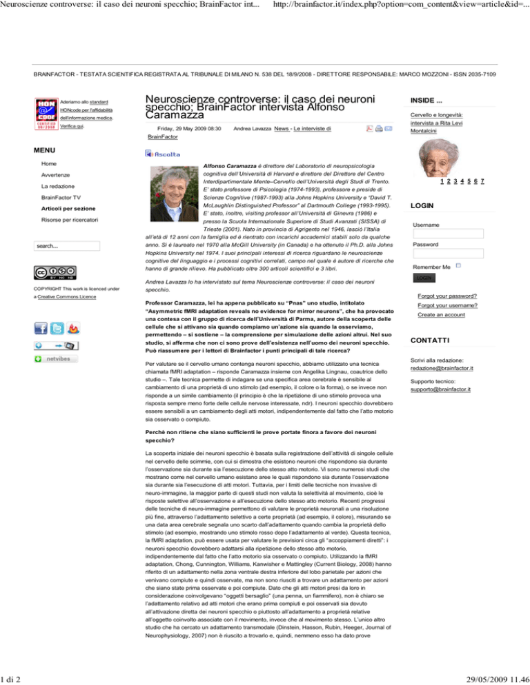 Neuroscienze controverse: il caso dei neuroni specchio; BrainFactor int... 1 di 2 http://brainfactor.it/index.php?option=com_content&view=article&id=... BRAINFACTOR - TESTATA SCIENTIFICA REGISTRATA AL TRIBUNALE DI MILANO N. 538 DEL 18/9/2008 - DIRETTORE RESPONSABILE: MARCO MOZZONI - ISSN 2035-7109 Aderiamo allo standard HONcode per l'affidabilità dell'informazione medica. Verifica qui. Neuroscienze controverse: il caso dei neuroni specchio; BrainFactor intervista Alfonso Caramazza Friday, 29 May 2009 08:30 Andrea Lavazza News - Le interviste di INSIDE ... Cervello e longevità: intervista a Rita Levi Montalcini BrainFactor MENU Home Alfonso Caramazza è direttore del Laboratorio di neuropsicologia Avvertenze cognitiva dell’Università di Harvard e direttore del Direttore del Centro Interdipartimentale Mente–Cervello dell’Università degli Studi di Trento. E’ stato professore di Psicologia (1974-1993), professore e preside di La redazione BrainFactor TV Articoli per sezione Risorse per ricercatori search... Scienze Cognitive (1987-1993) alla Johns Hopkins University e “David T. McLaughlin Distinguished Professor” al Dartmouth College (1993-1995). E’ stato, inoltre, visiting professor all’Università di Ginevra (1986) e presso la Scuola Internazionale Superiore di Studi Avanzati (SISSA) di Trieste (2001). Nato in provincia di Agrigento nel 1946, lasciò l’Italia all’età di 12 anni con la famiglia ed è rientrato con incarichi accademici stabili solo da qualche anno. Si è laureato nel 1970 alla McGill University (in Canada) e ha ottenuto il Ph.D. alla Johns 1 2 3 4 5 6 7 LOGIN Username Password Hopkins University nel 1974. I suoi principali interessi di ricerca riguardano le neuroscienze cognitive del linguaggio e i processi cognitivi correlati, campo nel quale è autore di ricerche che hanno di grande rilievo. Ha pubblicato oltre 300 articoli scientifici e 3 libri. Remember Me LOGIN COPYRIGHT This work is licenced under Andrea Lavazza lo ha intervistato sul tema Neuroscienze controverse: il caso dei neuroni specchio. Forgot your password? a Creative Commons Licence Professor Caramazza, lei ha appena pubblicato su “Pnas” uno studio, intitolato “Asymmetric fMRI adaptation reveals no evidence for mirror neurons”, che ha provocato una contesa con il gruppo di ricerca dell’Università di Parma, autore della scoperta delle cellule che si attivano sia quando compiamo un’azione sia quando la osserviamo, Forgot your username? Create an account permettendo – si sostiene – la comprensione per simulazione delle azioni altrui. Nel suo studio, si afferma che non ci sono prove dell’esistenza nell’uomo dei neuroni specchio. Può riassumere per i lettori di Brainfactor i punti principali di tale ricerca? Per valutare se il cervello umano contenga neuroni specchio, abbiamo utilizzato una tecnica chiamata fMRI adaptation – risponde Caramazza insieme con Angelika Lingnau, coautrice dello studio –. Tale tecnica permette di indagare se una specifica area cerebrale è sensibile al cambiamento di una proprietà di uno stimolo (ad esempio, il colore o la forma), o se invece non CONTATTI Scrivi alla redazione: [email protected] Supporto tecnico: [email protected] risponde a un simile cambiamento (il principio è che la ripetizione di uno stimolo provoca una risposta sempre meno forte delle cellule nervose interessate, ndr). I neuroni specchio dovrebbero essere sensibili a un cambiamento degli atti motori, indipendentemente dal fatto che l’atto motorio sia osservato o compiuto. Perché non ritiene che siano sufficienti le prove portate finora a favore dei neuroni specchio? La scoperta iniziale dei neuroni specchio è basata sulla registrazione dell’attività di singole cellule nel cervello delle scimmie, con cui si dimostra che esistono neuroni che rispondono sia durante l’osservazione sia durante sia l’esecuzione dello stesso atto motorio. Vi sono numerosi studi che mostrano come nel cervello umano esistano aree le quali rispondono sia durante l’osservazione sia durante sia l’esecuzione di atti motori. Tuttavia, per i limiti delle tecniche non invasive di neuro-immagine, la maggior parte di questi studi non valuta la selettività al movimento, cioè le risposte selettive all’osservazione e all’esecuzione dello stesso atto motorio. Recenti progressi delle tecniche di neuro-immagine permettono di valutare le proprietà neuronali a una risoluzione più fine, attraverso l’adattamento selettivo a certe proprietà (ad esempio, il colore), misurando se una data area cerebrale segnala uno scarto dall’adattamento quando cambia la proprietà dello stimolo (ad esempio, mostrando uno stimolo rosso dopo l’adattamento al verde). Questa tecnica, la fMRI adaptation, può essere usata per valutare le previsioni circa gli “accoppiamenti diretti”: i neuroni specchio dovrebbero adattarsi alla ripetizione dello stesso atto motorio, indipendentemente dal fatto che l’atto motorio sia osservato o compiuto. Utilizzando la fMRI adaptation, Chong, Cunnington, Williams, Kanwisher e Mattingley (Current Biology, 2008) hanno riferito di un adattamento nella zona ventrale destra inferiore del lobo parietale per azioni che venivano compiute e quindi osservate, ma non sono riusciti a trovare un adattamento per azioni che siano state prima osservate e poi compiute. Dato che gli atti motori presi da loro in considerazione coinvolgevano “oggetti bersaglio” (una penna, un fiammifero), non è chiaro se l’adattamento relativo ad atti motori che erano prima compiuti e poi osservati sia dovuto all’attivazione diretta dei neuroni specchio o piuttosto all’adattamento a proprietà relative all’oggetto coinvolto associate con il movimento, invece che al movimento stesso. L’unico altro studio che ha cercato un adattamento transmodale (Dinstein, Hasson, Rubin, Heeger, Journal of Neurophysiology, 2007) non è riuscito a trovarlo e, quindi, nemmeno esso ha dato prove 29/05/200