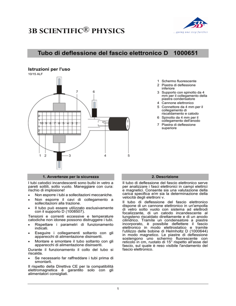 3B SCIENTIFIC® PHYSICS Tubo di deflessione del fascio elettronico D 1000651 Istruzioni per l'uso 10/15 ALF 7 6 2 1 10 9 8 7 6 5 4 3 2 1 2 3 - 1 2 4 1 Schermo fluorescente 2 Piastra di deflessione inferiore 3 Supporto con spinotto da 4 mm per il collegamento della piastra condensatore 4 Cannone elettronico 5 Connettore da 4 mm per il collegamento di riscaldamento e catodo 6 Spinotto da 4 mm per il collegamento dell'anodo 7 Piastra di deflessione superiore 5 1. Avvertenze per la sicurezza 2. Descrizione I tubi catodici incandescenti sono bulbi in vetro a pareti sottili, sotto vuoto. Maneggiare con cura: rischio di implosione! Non esporre i tubi a sollecitazioni meccaniche. Non esporre il cavi di collegamento a sollecitazioni alla trazione. Il tubo può essere utilizzato esclusivamente con il supporto D (1008507). Tensioni e correnti eccessive e temperature catodiche non idonee possono distruggere i tubi. Rispettare i parametri di funzionamento indicati. Eseguire i collegamenti soltanto con gli apparecchi di alimentazione disinseriti. Montare e smontare il tubo soltanto con gli apparecchi di alimentazione disinseriti. Durante il funzionamento il collo del tubo si riscalda. Se necessario far raffreddare i tubi prima di smontarli. Il rispetto della Direttiva CE per la compatibilità elettromagnetica è garantito solo con gli alimentatori consigliati. Il tubo di deflessione del fascio elettronico serve per analizzare i fasci elettronici in campi elettrici e magnetici. Consente sia una valutazione della carica specifica e/m sia la determinazione della velocità degli elettroni v. Il tubo di deflessione del fascio elettronico dispone di un cannone elettronico in un'ampolla di vetro sotto vuoto con sistema ad elettrodi focalizzante, di un catodo incandescente al tungsteno riscaldato direttamente e di un anodo cilindrico. Tramite un condensatore a piastre incorporato, è possibile deflettere il fascio elettronico in modo elettrostatico e tramite l'utilizzo delle bobine di Helmholtz D (1000644) in modo magnetico. Le piastre di deflessione sostengono uno schermo fluorescente con reticolo in cm, ruotato di 15° rispetto all'asse del fascio, sul quale è reso visibile l'andamento del fascio elettronico. 1 Inserire le bobine nei fori corrispondenti del portatubi. Attivare l'alimentatore ad alta tensione. Applicare tensione alle bobine e osservare l'andamento del fascio. L'andamento del fascio elettronico è circolare e la deflessione avviene in un piano verticale al campo magnetico. Ad una tensione anodica costante il raggio della deflessione si riduce aumentando la corrente di bobina. Con una corrente di bobina costante il raggio aumenta incrementando la tensione anodica. Ciò è indice di una maggiore velocità. Un elettrone di massa m e di carica e che si muove verticalmente rispetto al campo magnetico B, viene forzato dalla forza Lorentz B e v in un binario circolare: 3. Dati tecnici Riscaldamento: Tensione anodica: Corrente anodica: Tensione del condensatore: Distanza piastre condensatore: Schermo fluorescente: Ampolla: Lunghezza totale: ≤ 7,5 V CA/CC 1000 V – 5000 V CC ca. 0,1 mA /UA = 4000 V max. 5000 V ca. 54 mm 90 mm x 60 mm ca. 130 mm Ø ca. 260 mm 4. Utilizzo Per l'esecuzione degli esperimenti con il tubo di deflessione del fascio elettronico sono inoltre necessari i seguenti apparecchi: 1 Portatubo D 1008507 2 Alimentatore ad alta tensione 5 kV (115 V, 50/60 Hz) 1003309 oppure 2 Alimentatore ad alta tensione 5 kV (230 V, 50/60 Hz) 1003310 1 Coppia di bobine di Helmholtz D 1000644 1 Alimentatore CC 20 V (115 V, 50/60 Hz) 1003311 oppure 1 Alimentatore CC 20 V (230 V, 50/60 Hz) 1003312 1 Multimetro analogico AM51 1003074 In aggiunta si consiglia: Adattatore di protezione bipolare m v2 (1) r dove v è uguale alla velocità dell'elettrone e r è uguale al raggio di curvatura. B e v 5.2 Deflessione elettrica Cablare il tubo come indicato nella fig. 3. Collegare il polo negativo della tensione anodica al connettore da 4 mm contrassegnato con il segno meno sul collo del tubo. Attivare l'alimentatore ad alta tensione. Attivare la tensione del condensatore e osservare l'andamento del fascio. Un elettrone che attraversa alla velocità v il campo elettrico E di un condensatore a piastre con la tensione del condensatore UP e la distanza dalle piastre d, viene deflesso su un binario parallelo: 1009961 4.1 Inserimento del tubo nel portatubi Montare e smontare il tubo soltanto con gli apparecchi di alimentazione disinseriti. Spingere completamente all'indietro il dispositivo di fissaggio del portavalvole. Inserire il tubo nei morsetti. Bloccare il tubo nei morsetti mediante i cursori di fissaggio. Se necessario, inserire un adattatore di protezione sui jack di collegamento del tubo. 1 e E 2 (2) x 2 m v2 dove y è la deflessione lineare lungo la distanza lineare x. y 5.3 Determinazione di e/m e v 5.3.1 Mediante deflessione magnetica Struttura di prova come da fig. 2. Per la velocità dipendente dalla tensione anodica UA degli elettroni v vale quanto segue: 4.2 Rimozione del tubo dal portatubi Per rimuovere il tubo, spingere di nuovo all'indietro il dispositivo di fissaggio e rimuoverlo. e UA (3) m Dalle equazioni 1 e 3 per la carica specifica e/m deriva che: v 2 e 2 UA m B r 2 5. Esempi di esperimenti 5.1 Deflessione magnetica Cablare il tubo come indicato nella fig. 2. Collegare il polo negativo della tensione anodica al connettore da 4 mm contrassegnato con il segno meno sul collo del tubo. (4) UA può essere letta direttamente, B e r possono essere determinati in modo sperimentale. 2 5.3.1.1 Determinazione di r Per il raggio di curvatura r del fascio di elettroni deflesso, vale quanto segue come deducibile dalla fig. 1: 5.3.3 Mediante compensazione del campo Struttura di prova come da Fig. 4. Attivare gli alimentatori ad alta tensione e deflettere elettrostaticamente il fascio di elettroni. Attivare l'alimentatore delle bobine e regolare la tensione in modo che il campo magnetico compensi il campo e