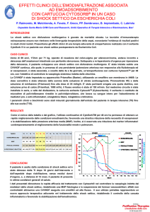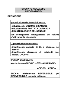 Test di autovalutazione 1. Lo shock ipovolemico è una sindrome caratterizzata da tutti questi sintomi ad esclusione di uno. Quale? a) bradicardia b) pressione arteriosa sistolica minore di 90 mm Hg c) oliguria d) turbe del circolo cerebrale e) diminuzione della temperatura cutanea 2. Lo stato di shock post-emorragico e’ caratterizzato dai seguenti elementi clinici, tranne uno: a) polso piccolo, debole e frequente b) pressione molto ridotta c) tachipnea d) superfici cutanee calde e sudate e) decorso progressivamente ingravescente 3. Diversamente dallo shock cardiogeno e dallo shock emorragico, le seguenti condizioni si presentano nello shock settico tranne una. Quale? a) la diuresi è mantenuta più a lungo per vasodilatazione renale b) la cute è molto spesso calda c) la cute è molto spesso fredda d) è frequente come complicanza la coagulazione vascolare disseminata ( CID) e) polmone da shock 4. Uno dei seguenti elementi non rientra nel quadro clinico dell’emorragia: a) pallore della cute e delle mucose b) raffreddamento delle estremità c) ipertensione arteriosa d) sudorazione fredda e) senso di sete 1 5. Lo shock cardiogeno può essere provocato da tutti questi fattori ad esclusione di uno. Quale? a) endocardite lenta b) infarto del miocardio c) embolia polmonare d) miocardite virale e) tamponamento cardiaco 6. Nello shock cardiogeno quale segno non e’ presente: a) ipotensione arteriosa con diminuzione della PA differenziale b) vasocostrizione delle arteriole e venule c) diminuzione della gittata cardiaca d) diminuzione della pressione venosa centrale e) attivazione del sistema adrenergico 7. Una bradicardia riflessa da risposta vagale caratterizza lo shock: a) cardiogeno b) tossico c) settico d) ipovolemico e) neurogeno 8. Lo shock da ustione e’ dovuto a: a) dolore intenso b) insufficienza cardiaca c) infezione d) ipovolemia e) insufficienza renale 9. Shock con prevalente aumento della pressione venosa centrale si rileva in una di queste condizioni: a) collasso per insufficiente gittata da infarto del miocardio b) emorragie profuse c) ustioni estese 2 d) emoperitoneo e) rapida formazione di versamento peritoneale 10. La PVC nello shock emorragico è: a) normale b) inizialmente aumentata c) costantemente aumentata d) inizialmente diminuita e) costantemente diminuita 11. Lo shock neurogeno: a) si presenta con ipotensione e bradicardia b) si osserva in tutte le lesioni acute del midollo spinale c) è causato dalla perdita del tono vasomotorio nei vasi periferici e del tono simpatico a livello cardiaco d) è sempre associato ad ipovolemia e) a + c 3