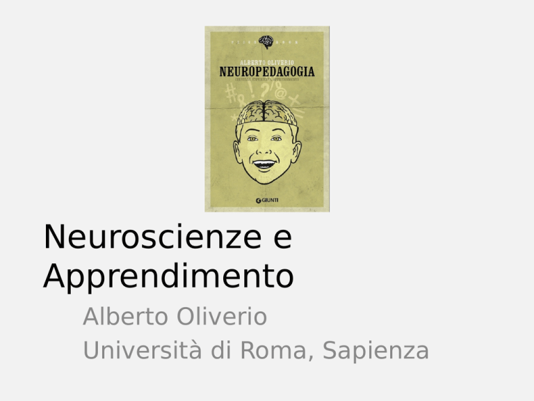 Neuroscienze e Apprendimento Alberto Oliverio Università di Roma, Sapienza La sostanza grigia aumenta nel corso del primo anno e riguarda soprattutto le aree corticali sensorimotorie (frontali superiori, temporali inferiori e parietali). La grigia frontale aumenta nel corso dell’adolescenza per poi diminuire. Anche la maturazione dell’ippocampo (posteriore) che consente di formare delle rappresentazioni mnestiche, prosegue tra i 4 e i 24 anni, il che contribuisce alla formazione dei ricordi in cui possiamo compiere un viaggio e cambiare punto di vista: ciò dipende dal L’importanza dell’azione. Il controllo motorio è in qualche modo il contrario di quanto si verifica nella percezione. Percepire significa costruirsi una rappresentazione del mondo esterno. L’azione, invece, inizia con un’ipotesi sulle conseguenze desiderate di un movimento e poi continua nella sua esecuzione. Nel corso del suo processo evolutivo, il cervello ha bisogno di fare esperienze tattili e motorie perché si sviluppino quelle aree sensorimotorie che rappresentano il punto di partenza per la Esperienze tattili e motorie Nel corso del suo sviluppo, il cervello ha bisogno di fare esperienze tattili e motorie: giocare con la sabbia e con l’acqua, fare costruzioni con i cubi, praticare giochi di movimento, perché si sviluppino quelle aree del cervello che sono il punto di partenza per la maturazione delle aree del linguaggio e del pensiero complesso. La realtà virtuale non è l’ambiente ideale per favorire lo sviluppo della mente infantile che è concreta, Rappresentazioni motorie e apprendimento L “apprendimento recitato” favorisce le associazioni tra rappresentazioni motorie e apprendimento. La tecnica sfrutta il fatto che le memorie motorie sono particolarmente robuste mentre quelle semantiche (per esempio, le memorie legate al significato delle parole) sono più fragili. L’apprendimento recitato è stato utilizzato per migliorare l’apprendimento di una seconda lingua: i bambini devono recitare in gruppo una serie di vocaboli accompagnandoli con gesti e movimenti che ne rappresentino il Motricità e linguaggio. Le aree linguistiche e quelle che si riferiscono al corpo, all’ambiente e al contesto in cui esso opera interagiscono tra di loro, il che è bene evidente in quelle situazioni in cui il movimento entra in conflitto con la formulazione di parole. Chiedete a un amico di parlare e ripetete ciò che sta dicendo mentre lui parla, come se foste la sua “ombra”. A questo punto cominciate a tamburellare con il dito medio della mano destra seguendo un ritmo regolare; provate ora con il dito medio della mano sinistra. Per la maggior parte delle persone è più difficile tamburellare con il dito medio della mano destra (controllato dalla corteccia motoria dell’emisfero Attività aerobica e concentrazione Dopo meno di 30 minuti di attività fisica aerobica (correre) la capacità di concentrazione migliora notevolmente: queste conoscenze dovrebbero tradursi in un’anticipazione dell’ora di educazione fisica all’inizio della giornata scolastica o nel fare brevi pause di attività fisica nel corso delle ore scolastiche. Più in generale, si è visto che nei bambini che presentano deficit di attenzione la pratica di esercizi basati sul controllo motorio Immaginazione, movimento, percezione. Il nostro cervello è un enorme archivio di repertori motori, complessi schemi che lo psicologo russo Alexander Lurija ha defi nito “melodie cinetiche”. Le tecniche di imaging hanno contribuito alla conoscenza degli schemi motori: se si chiede a una persona di pensare di muovere la mano, come se volesse afferrare un oggetto, la sua corteccia premotoria, situata davanti a quella motoria, nel lobo frontale, diviene attiva, il che indica come vi siano aree del cervello che predispongono il movimento e aree che lo realizzano. Questo parallelismo tra anticipazione e azione vale anche per l’immaginazione e la sensazione: così, il solo immaginare un oggetto, ad esempio una rosa, porta all’attivazione delle aree della corteccia visiva che vengono attivate quando quell’oggetto viene Parole e immagini. Rappresentare la realtà tramite immagini significa memorizzare in modo più efficace e, di conseguenza, imparare meglio di quanto non avvenga a mezzo della trasmissione orale o della lettura, cioè attraverso codici “semantici”, basati sul significato. Le esperienze visive sono 3-4 volte più efficaci di quelle uditive, quelle audiovisive sono a loro volta 2 volte più efficaci di quelle visive, il che indica che un metodo di apprendimento che passi prevalentemente Immagini e concetti Numerose esperienze ed apprendimenti infantili si basano su associazioni tra immagini e concetti: l’apprendimento viene così facilitato, in quanto le immagini si Relazioni semantiche in 3 diversi soggetti fissano facilmente Huth et al, Neuron, 2015 nella mente Attenzione e apprendimento La maggior parte delle persone non analizza le situazioni in modo sistematico. Per superare questo stadio e sviluppare vere capacità di concentrazione e memoria dobbiamo imparare ad analizzare correttamente i messaggi, soprattutto quelli visivi. L’attenzione selettiva implica, anzitutto, un coinvolgimento dei sensi. In secondo luogo, si basa sull’individuazione dell’aspetto fondamentale o essenziale del I due emisferi Funzioni emisferiche Da un lato siamo dotati di attività di tipo logico-simboliche che si riallacciano alle strutture e alle funzioni del linguaggio, tipiche dell'emisfero sinistro, dall'altro di attività "gestaltiche", basate sulla capacità di cogliere diversi aspetti della realtà anche per i loro risvolti emozionali, tipiche dell'emisfero destro. II due due emisferi emisferi cerebrali cerebrali hanno hanno competenze competenze molto molto diverse. diverse. SINISTRO SINISTRO •• VERBALE: VERBALE: utilizza utilizza parole, parole, vocaboli, vocaboli, per per nominare nominare per per definire definire 