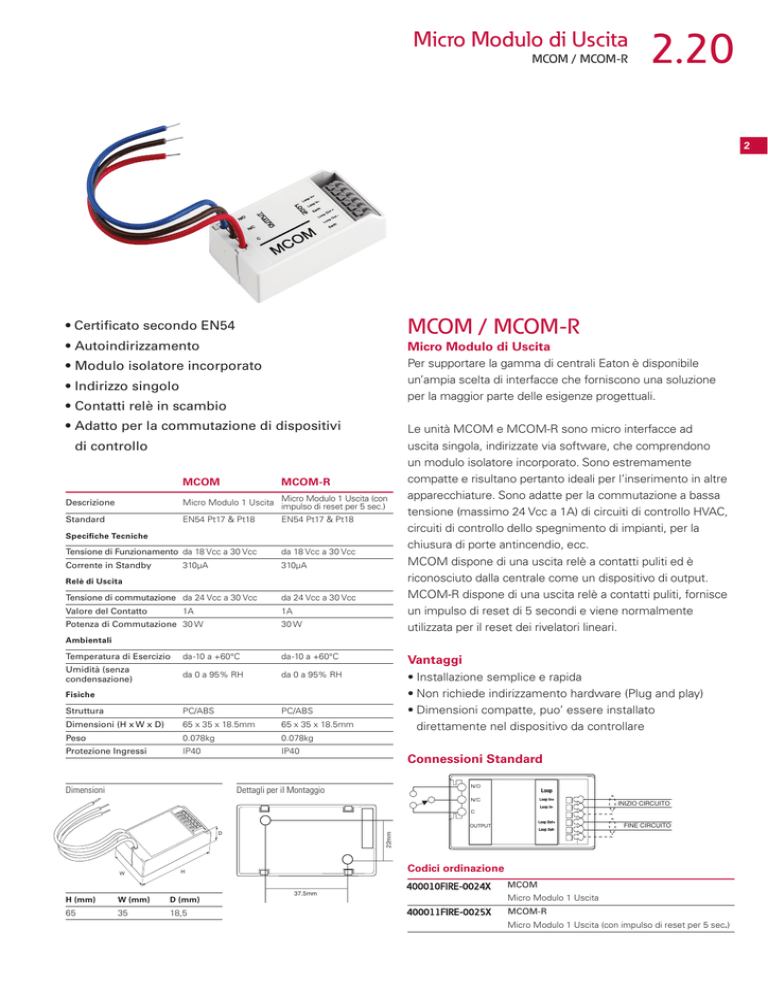 Micro Modulo di Uscita MCOM / MCOM-R 2.20 2 • Certificato secondo EN54 MCOM / MCOM-R • Autoindirizzamento Micro Modulo di Uscita • Modulo isolatore incorporato Per supportare la gamma di centrali Eaton è disponibile un’ampia scelta di interfacce che forniscono una soluzione per la maggior parte delle esigenze progettuali. • Indirizzo singolo • Contatti relè in scambio • Adatto per la commutazione di dispositivi di controllo MCOM MCOM-R Descrizione Micro Modulo 1 Uscita Micro Modulo 1 Uscita (con impulso di reset per 5 sec.) Standard EN54 Pt17 & Pt18 EN54 Pt17 & Pt18 Tensione di Funzionamento da 18 Vcc a 30 Vcc da 18 Vcc a 30 Vcc Specifiche Tecniche 310μA Corrente in Standby 310μA Relè di Uscita Tensione di commutazione da 24 Vcc a 30 Vcc 1A Valore del Contatto da 24 Vcc a 30 Vcc 1A Potenza di Commutazione 30 W 30 W Le unità MCOM e MCOM-R sono micro interfacce ad uscita singola, indirizzate via software, che comprendono un modulo isolatore incorporato. Sono estremamente compatte e risultano pertanto ideali per l’inserimento in altre apparecchiature. Sono adatte per la commutazione a bassa tensione (massimo 24 Vcc a 1A) di circuiti di controllo HVAC, circuiti di controllo dello spegnimento di impianti, per la chiusura di porte antincendio, ecc. MCOM dispone di una uscita relè a contatti puliti ed è riconosciuto dalla centrale come un dispositivo di output. MCOM-R dispone di una uscita relè a contatti puliti, fornisce un impulso di reset di 5 secondi e viene normalmente utilizzata per il reset dei rivelatori lineari. Ambientali Temperatura di Esercizio da -10 a +60°C da -10 a +60°C Umidità (senza condensazione) Vantaggi da 0 a 95% RH da 0 a 95% RH • Installazione semplice e rapida • Non richiede indirizzamento hardware (Plug and play) • Dimensioni compatte, puo’ essere installato direttamente nel dispositivo da controllare Fisiche Struttura PC/ABS PC/ABS Dimensioni (H x W x D) 65 x 35 x 18.5mm 65 x 35 x 18.5mm Peso 0.078kg 0.078kg Protezione Ingressi IP40 IP40 $IMENSIONI Connessioni Standard $ETTAGLIÏPERÏILÏ-ONTAGGIO N/O N/C INIZIO CIRCUITO C FINE CIRCUITO OUTPUT W 22mm D Codici ordinazione H 37.5mm H (mm) 65 W (mm) 35 400010FIRE-0024X 18,5 MCOM Micro Modulo 1 Uscita D (mm) 400011FIRE-0025X MCOM-R Micro Modulo 1 Uscita (con impulso di reset per 5 sec.) Micro Modulo di Ingresso a Canale Singolo 2.21 MCIM 2 • Certificato secondo EN54 MCIM • Autoindirizzamento Micro Modulo di Ingresso a Canale Singolo • Modulo isolatore incorporato Per supportare la gamma di centrali Eaton è disponibile un’ampia scelta di interfacce che forniscono una soluzione per la maggior parte delle esigenze progettuali. • Indirizzo singolo • Adatto per il monitoraggio di: - Regolatori di flusso Tensione di Funzionamento da 18 Vcc a 30 Vcc Corrente in Standby 310μA L’unità MCIM è un micro modulo ad ingresso singolo, indirizzato via software, che comprende un circuito isolatore incorporato. È estremamente compatta e risulta pertanto ideale per l’inserimento in altre apparecchiature. E’ adatto per il monitoraggio di gruppi di contatti normalmente aperti, a tensione zero quali i regolatori di portata di un sistema sprinkler, segnali di incendio/guasto di pannelli ausiliari nonché segnali di ingresso non relativi ad incendi quali l’apertura di valvole di flusso a contatti aperti, avvio di generatori, chiusura di porte antincendio, ecc. Resistenza di Attivazione 5K6Ω Vantaggi Resistenza di Fine Linea 22KΩ Guasto di Corto Circuito Resistenza di Soglia 1KΩ Guasto di Circuito Aperto Resistenza di Soglia 33KΩ • Installazione semplice e rapida • Non richiede indirizzamento hardware (Plug and play) • Dimensioni compatte, puo’ essere installato direttamente nel dispositivo da controllare - Ingressi “Non Fire” - Dispositivi ausiliari MCIM Descrizione Micro Modulo 1 Ingresso Standard EN54 Pt17 & Pt18 Specifiche Tecniche Ingressi Ambientali Temperatura di Esercizio da -10 a +60°C Umidità (senza condensazione) da 0 a 95% RH Connessioni Standard Fisiche Struttura PC/ABS Dimensioni (H x W x D) 65mm x 35mm x 18.5mm Peso 0,078kg Protezione Ingressi IP40 5K6 IN+ 22K INEARTH INIZIO CIRCUITO INPUT FINE CIRCUITO $IMENSIONI $ETTAGLIÏPERÏILÏ-ONTAGGIO Codici ordinazione W 22mm D H H (mm) W (mm) D (mm) 65 35 18,5 37.5mm 400008FIRE-0022X MCIM Micro Modulo 1 Ingresso