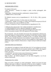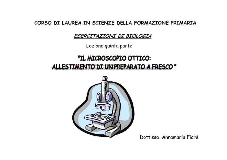 CORSO DI LAUREA IN SCIENZE DELLA FORMAZIONE PRIMARIA ESERCITAZIONI DI BIOLOGIA Lezione quinta parte Dott.ssa Annamaria Fiarè Gli oggetti che si osservano al MICROSCOPIO OTTICO sono generalmente trasparenti e molto sottili; vengono montati sopra una lastrina di vetro, detta VETRO PORTAOGGETTO, in un mezzo omogeneo come acqua o balsamo di Canadà (quest’ ultimo serve per PREPARATI PERMANENTI ossia duraturi) e coperti con un’ altra lastrina di vetro, detta VETRINO COPRIOGGETTO, in modo che il preparato sia di spessore uniforme Il PREPARATO A FRESCO E’ UN ALLESTIMENTO NON PERMANENTE. I CAMPIONI VENGONO SISTEMATI IN UNA GOCCIA D’ ACQUA E COPERTI DA UN VETRINO COPRIOGGETTO •Foglie di Iris •Acqua •Pinzetta a punta sottile •Vetrini porta- e coprioggetti •Bisturi •Pipetta Pauster •Microscopio ottico •Album e matita Mettere una goccia d’acqua al centro di un vetrino pulito, prelevata con una pipetta Pauster Con un bisturi effettuare un taglio della foglia di Iris Eseguire una sezione longitudinale dell’ epidermide della foglia di Iris con l’aiuto di una pinzetta e montarla direttamente sulla goccia di acqua , posta precedetemene sul vetrino portaoggetto Appoggiare il margine del coprioggetto al margine della goccia d’acqua ed abbassare delicatamente in modo che l’acqua in cui si trova il campione si spanda uniformemente sotto il coprioggetto Fare attenzione a non formare bolle d’aria sotto o attorno al campione. Non premere sul coprioggetto. Se ci fosse troppa acqua, togliere l’eccesso toccando un margine del coprioggetto con della carta assorbente Il preparato è pronto per essere osservato al M. O Disegnare quanto osservato Quando si deve usare il microscopio, lo si estrae dalla custodia prendendolo per il braccio e lo si pone sul tavolo da lavoro. Mettere il microscopio sul tavolo con gli oculari rivolti verso di voi Girare la torretta finché l’obiettivo (4X) non è ben allineato con il corpo del microscopio. Sentirete un “click” quando l’obiettivo sarà posizionato correttamente (in caso contrario vedrete le vostre ciglia su un fondo scuro) Accendere la lampada e regolare la luminosità. Gli obiettivi più potenti richiedono maggiore luce. Regolare il condensatore se è mobile. Quando si usano gli obiettivi 4X o 10X, la lente superiore del condensatore deve stare a circa 5 mm dal vetrino, ma quando si usa l’obiettivo 40X (alto ingrandimento) la lente superiore del condensatore deve essere poco al di sotto della sua posizione più alta o circa 2 mm sotto il vetrino. Il diaframma ad iride deve essere regolato in modo da avere il campo ottico in modo chiaro ed uniforme. L’illuminazione deve essere modificata anche quando si cambia preparato; con preparati spessi o intensamente colorati bisogna aumentare l’illuminazione, aprendo il diaframma, e viceversa con preparati sottili o non colorati. Usare la manopola macrometrica per abbassare il piano portaoggetto prima di mettere il vetrino Mettere il vetrino con il preparato sul piano portaoggetti, assicurandovi che il coprioggetto sia rivolto verso l’obiettivo. Collocare il vetrino in modo da avere il campione direttamente sopra il foro del piano Guardare il piano portaoggetti di lato mentre lo spostate verso l’alto (o mentre spostate il corpo del microscopio verso il basso) fino a quando la lente dell’obiettivo non sfiora il preparato. Mentre lo fate, osservare in quale direzione state girando la macrometrica, se verso di voi o nel senso opposto. Con un po’ di esperienza saprete automaticamente da che parte girare la manopola. Attenzione a non urtare il vetrino con l’obiettivo per non danneggiare né l’uno né l’altro. Mentre guardate attraverso l’oculare, usate la macrometrica per allontanare il piano portaoggetti dall’obiettivo. Quando il preparato comincia ad apparire, girate la micrometrica lentamente per mettere a fuoco. Potete sapere di quante volte è stato ingrandito il campione moltiplicando il potere dell’obiettivo per quello dell’oculare. Se usate un binoculare, considerate solo l’ingrandimento di un oculare Ruotare la torretta in modo che l’obiettivo 10X si incastri al suo posto. Di nuovo, verificate lo spazio tra l’obiettivo e il preparato. La DISTANZA DI LAVORO (spazio fra obiettivo e preparato) diminuisce aumentando il potere degli obiettivi e degli ingrandimenti maggiori. Se il vostro microscopio è parafocale (cioè quando si sia posto a fuoco l’oggetto con un obiettivo, si può cambiare di obiettivo senza perde completamente il fuoco) probabilmente riuscirete a mettere a fuoco soltanto la micrometrica. Se avete bisogno di usare la macrometrica, ricordate di non girarla mai guardando attraverso gli oculari, ma sempre guardando di lato. La dimensione del campo ottico (l’area che vedete) varia in proporzione inversa all’ingrandimento: maggiore l’ingrandimento, minore il campo ottico. A volte il campione non ha ugual spessore ovunque e la profondità alla quale è possibile mettere a fuoco (profondità di campo) è limitata. Maggiore è l’ ingrandimento, più ridotta è la profondità di campo. Esaminare i preparati spessi fochettando continuamente, per mettere a fuoco piani a diverse profondità del campione Quando saprete usare bene il microscopio con l’obiettivo 10 X, cambiatelo con il 40X. A forte ingrandimento l’oggetto da osservare deve essere ben centrato, poiché l’obiettivo prende solo una piccola parte del campo osservabile a basso ingrandimento Per evitare di colpire il vetrino con la lente, guardate ancora di lato mentre spostate l’obiettivo più potente. Può essere necessario muovere la micrometrica per focalizzare l’immagine. Ricordate di non usare mai la macrometrica con gli obiettivi più potenti COSA OSSERVO? All’esame microscopico appaiono delle strutture incolori più o meno rettangolari,intervallate, con una certa regolarità, da piccole formazioni rotondeggianti simili a due fagioli affiancati e di un debole colo