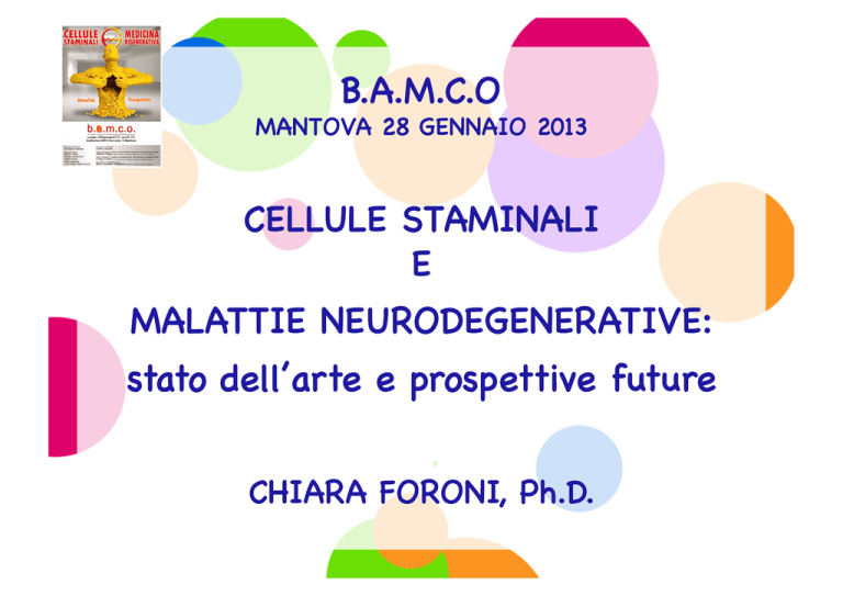 B.A.M.C.O MANTOVA 28 GENNAIO 2013 CELLULE STAMINALI E MALATTIE NEURODEGENERATIVE: stato dell’arte e prospettive future CHIARA FORONI, Ph.D. Sai, quando ero una piccola cellula staminale, anch’io non sapevo cosa fare da grande Sì, ma io sono così confusa CELLULE STAMINALI Cosa sono? ü sono cellule non specializzate ü non hanno ancora una funzione ben precisa nell’organismo ü possono dare origine a tutti i tipi di cellule specializzate CARATTERISTICHE DELLA CELLULA STAMINALE ü non e' terminalmente differenziata ü può dividersi illimitatamente ü può rimanere staminale o differenziarsi DOVE SI TROVANO LE STAMINALI? cellule staminali tissutali feto, neonato, adulto cellule staminali embrionali blastocisti – stadio molto precoce dell’embrione UNA STORIA DI VITA… POTENZIALE DI MOLTIPLICAZIONE E DIFFERENZIAMENTO Con:,, Le Scienze 2011 CELLULE STAMINALI NELL’ADULTO retina denti pelle sangue fegato ovaio testicoli muscoli cervello mammella, cuore intestino midollo rosso Nell’adulto le cellule staminali permango in sedi istologicamente ben definite (comparti staminali) garantendo l’integrità dei tessuti nel corso della vita, rimpiazzando le cellule morte o danneggiate TERAPIE CON CELLULE STAMINALI ADULTE CAPACITÁ TERAPUTICHE PROSPETTATE DI MIGLIORARE O ADDIRITTURA RISOLVERE GLI STATI DI MALATTIA CRONICA DEGENERATIVA O ACUTA, CARATTERIZZATI DA PERDITA DI TESSUTO/CELLULE E NON TRATTABILI CON APPROCCI CLASSICI ü Le terapie richiedono una fonte di cellule staminali del lignaggio specifico ü Recuperare o coltivare il numero necessario di tali cellule per la terapia è una sfida della ricerca ü Accurato “controllo di qualitá” sulle cellule staminali MEDICINA RIGENERATIVA Processo di creazione di tessuti funzionali per riparare o sostituire tessuti e recuperare l’uso degli organi perso a causa di età, malattia, danni o difetti congeniti L’idea di riparare un tessuto lesionato con un trapianto cellulare, nata negli anni 50, si affina con gli studi di Thomas Donnall che hanno dimostrato che le cellule del midollo osseo, infuse per via venosa, sono in grado di ripopolare il midollo dell’ospite e produrre nuove cellule del sangue (Premio Nobel nel 1990) PATOLOGIE ATTUALMENTE TRATTABILI Cellule staminali ematopoietiche da midollo osseo, sangue periferico, cordone ombelicale ü Disturbi oncologici e malattie proliferative Leucemie Linfoma di Hodgkin Linfoma non-Hodgkin Neuroblastoma ü Disturbi ematologici Anemia Aplasia Anemia Anemie aplastica eritrocitaria refrattaria falciformi Cellule staminali epiteliali ü Lesioni di alcuni epiteli MALATTIE NEURODEGENERATIVE E CELLULE STAMINALI ü Dal punto di vista sperimentale, ci sono evidenze che, quando trapiantate nel cervello, le cellule staminali sono in grado di sopravvivere e migliorare le anomalie neurologiche. ü Il cammino della ricerca nel caso di queste malattie è più arduo perché alle cellule trapiantate si chiede non solo di sopravvivere e differenziarsi nella corretta tipologia neuronale ma anche di integrarsi e ricostituire circuiti complessi, danneggiati ü L’utilizzo delle cellule staminali è tuttora limitato, oltre che da motivi etici, anche dalla difficoltà di controllare le capacità proliferative e differenziati di queste cellule una volta trapiantate nel tessuto. ü A oggi, comunque ci sono pubblicati molti lavori a livello preclinico, nell’animale che sono molto promettenti, come ci sono in fase di studio molti protocolli sperimentali. CELLULE STAMINALI NELL’ADULTO cervello ISOLAMENTO, COLTIVAZIONE E PROPAGAZIONE DI CELLULE STAMINALI NEURALI IN VITRO Tessuto cerebrale Col.vazione con mitogeni Dissociazione Proliferazione Rimozione dei mitogeni Differenziamento Dissociazione Proliferazione Alles.mento di linee cellulari Col.vazione con mitogeni Nel 1992, Reynolds e Weiss forniscono la prima segnalazione relativa all’isolamento di cellule staminali dal tessuto nervoso adulto (Reynolds and Weiss, Science 1992) CELLULE STAMINALI NEURALI (NSC) Neuroni Interneuroni Oligodendrociti NSC Astrociti Tipo 2 Astrociti Tipo 1 cervello progenitori “committed” cellule specializzate Foroni, Cancer Research 2007 TERAPIE POSSIBILI NEL FUTURO ü Potenziale cura delle malattie degenerative del sistema nervoso • morbo di Parkinson • morbo di Alzheimer • sclerosi multipla • sclerosi laterale amiotrofica ü Ricostruzione del midollo spinale danneggiato da traumi fisici ü Ictus cerebrale MORBO DI PARKINSON Malattia neurodegenerativa del sistema nervoso centrale caratterizzata dalla progressiva degenerazione dei neuroni che producono dopamina Terapia mediante moltiplicazione e stimolazione di neuroni dopaminergici MORBO DI ALZHEIMER Demenza neurodegenerativa caratterizzata da un accumulo extracellulare di una proteina chiamata βamiloide e da accumuli intracellulari in ammassi cosiddetti neurofibrillari. Terapia attraverso cellule staminali neuronali SCLEROSI MULTIPLA …curarla, potrebbe essere una questione di naso! Il bulbo olfattivo contiene intere colonie di cellule staminali neurali che potrebbero essere utilizzate per la produzione di oligodendrociti e la cura delle malattie demielinizzanti Gritti, Journal Neuroscience 2002 SCLEROSI LATERALE AMIOTROFICA (SLA) Malattia neurodegenerativa che colpisce i motoneuroni del cervello e del midollo spinale Sostituzione dei motoneuroni danneggiati Protezione dei motoneuroni in fase di degenerazione RICOSTRUZIONE DEL MIDOLLO SPINALE IN SEGUITO A TRAUMI Cellule staminali possono differenziarsi in oligodendrociti che producono mielina, sostanza che scarseggia in presenza di un infortunio Midollo osseo prelevato dal fianco. Coltura di 6 settimane per aumentare totale a 100 milioni le cellule staminali adulte Inoculo di cellule staminali adulte nel sito del danno al midollo. RICERCA CON CELLULE STAMINALI ADULTE BENEFICI LIMITAZIONI ü Facili da ottenere ü L’isolamento di alcuni tipi di staminali é meno agevole di altre ü Potenzilamente numero illimitato 