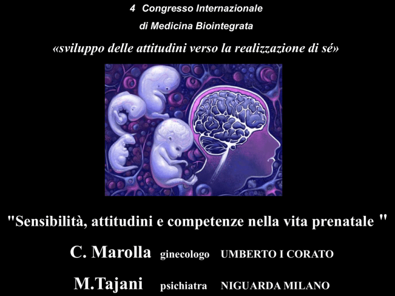 4 Congresso Internazionale di Medicina Biointegrata «sviluppo delle attitudini verso la realizzazione di sé» "Sensibilità, attitudini e competenze nella vita prenatale " C. Marolla M.Tajani ginecologo UMBERTO I CORATO psichiatra NIGUARDA MILANO …e ognuno è più vecchio di quanto pensi di alcuni mesi; perché noi viviamo, ci muoviamo, abbiamo un essere e siamo soggetti alle azioni degli elementi e al maleficio delle malattie in quell’altro mondo,l’autentico microcosmo: l’utero di nostra madre Sir Thomas Browne, Religio Medici, 1642 Nello sviluppo dell’encefalo concorrono oltre ai fattori genetici anche i fattori ambientali che possono agire sia in modo positivo che in modo negativo. A circa 20 settimane è acquisita la quasi totalità dei neuroni In caso di danno cerebrale si possono attivare circuiti cerebrali alternativi con funzione compensatoria. STRESS AMBIENTALE STRESS AMBIENTALE DANNEGGIA COORDINAMENTO MOTORIO TONO MUSCOLARE CERVELLO CRH IRRITABILITA’ IPOFISI DURATA DELL’ATTENZIONE ACTH . SURRENE MATURAZIONE DEGLI ORGANI CORTISOLO CERVELLO, POLMONE DANNEGGIA ALLERTA EFFETTI CONTRARI E SULLA CRESCITA ALTERAZIONI STRUTTURALI RISPOSTA A DI E COMPORTAMENTALI NUOVI POLMONE STIMOLI E CERVELLO ORGANISMO DANNI ALL’IPPOCAMPO DIMINUISCE IL NUMERO DEI NEURONI E DEI RECETTORI PER I CORTICOSTEROIDI , LIVELLI DI SEROTONINA E DENSITA’ SINAPTICA DANNEGGIANO MEMORIA E APPRENDIMENTO I genitori sono importanti nella formazione del nascituro, tanto che Bruce Lipton li definisce “i veri ingegneri genetici” MOVIMENTI FETALI Molte competenze del neonato etichettate come “innate” hanno in realtà inizio nella vita prenatale La loro estrinsecazione è il frutto di una meticolosa preparazione che si realizza in utero attraverso tappe ben definite Ultrasonographic study of fetal movements. Semin Perinatol. 1981 Apr;5(2):175-81 E.Tajani et al. Peculiarità dello sviluppo neurologico fetale Presenza di funzioni transitorie, specie motorie, espressione di attività neuronali legate a strutture e connessioni temporanee La capacità del SNC a modificarsi non è transitoria e non viene persa con il completarsi della gravidanza La maturazione non è simultanea ma privilegia le aree che sovrintendono a funzioni vitali: respiro, suzione, deglutizione, pianto, orientamento spaziale, ritmo sonno-veglia Tipologie funzionali dei patterns motori prenatali Movimenti indispensabili per la sopravvivenza ed il corretto sviluppo del feto Movimenti che anticipano e preparano funzioni manifeste ed utili solo in epoca postnatale Movimenti a comparsa precoce che non persistono sino al termine della gravidanza Tajani E., Ianniruberto A., "The uncovering of fetal competence"; in Papini M., Pasquinelli A., Gidoni E.A. (Eds.), Developement Handicap and Rehabilitation: Practice and Theory, 1990, pp. 3-8. Amsterdam: Elsevier Science Publishers. TRANSIZIONE DAL MUSCOLO EMBRIONALE A QUELLO FETALE Il muscolo embrionale esprime . proteine contrattili di tipo lento . enzimi metabolici con bassa attività Nel feto invece compaiono proteine capaci di contrazione veloce ed enzimi metabolici ad alta attività un muscolo che si contrae lentamente come un motore in rodaggio. un muscolo già efficiente e di per se più simile al muscolo adulto. Messina G, Biressi S, Monteverde S et al. Nfix regulates fetal-specific transcription in developing skeletal muscle. Cell 2010;140(4): 554-566. FATTORE NUCLEARE UNO X ( Nfix ) I ricercatori hanno identificato un singolo gene, chiamato Fattore Nucleare Uno X ( Nfix ) necessario e sufficiente per “spegnere” i geni embrionali ed “accendere” quelli fetali. Infatti, questo gene, quando espresso in cellule muscolari embrionali le trasforma in cellule fetali. -chiarisce il meccanismo molecolare della transizione Questa scoperta : embrione/feto -ha importanti implicazioni per l’evoluzione del muscolo scheletrico nei vertebrati -ha possibili implicazioni per la patogenesi di alcune malattie muscolari. Messina G, Biressi S, Monteverde S et al. Nfix regulates fetal-specific transcription in developing skeletal muscle. Cell 2010;140(4): 554-566. Fattore Nucleare Uno X (Nfix) Marolla C. Studio ecografico della motricità e della maturazione neurosensoriale del feto Capire per Concepire Mediprint 1/2010 Speciale:15-23 L’analisi quali-quantitativa dell’attività motoria fetale può svelare disfunzioni cerebrali e probabilmente neuromuscolari Studi su feti anencefali (modello dell’influenza delle strutture sopraspinali sul comportamento motorio) : Il numero di movimenti è normale o aumentato ma la complessità è radicalmente distorta (movimenti stereotipati e semplificati) Nei feti IUGR i movimenti sono più lenti e monotoni, simili a crampi, e la loro variabilità in forza e ampiezza è ridotta . Ciò indicherebbe la sussistenza di lesioni cerebrali e/o di uno stato ipossico. L’oligoamnios negli IUGR non giustifica queste variazioni in quanto nella PROM i movimenti sono meno frequenti ma la complessità è conservata La motilità spontanea, senza stimolazione sensoriale, è il miglior marker di benessere neurologico I patterns motori spontanei fetali persistono per 5-6 mesi dopo la nascita Questa “continuità comportamentale” è una premessa basilare per l’identificazione precoce di feti e neonati ad alto rischio neurologico General Movements Sono il primo segno di un controllo sopraspinale dell’attività motoria Si evidenziano a 8 sett. e persistono fino a 20 sett. postnatali CARATTERISTICHE : - Interessano l’intero corpo - l’inizio e la fine sono graduali -variano in intensità, forza e velocità dando una impressione di complessità ed eleganza Movimento Fetale che cessa per ultimo nelle situazioni di IpossiaAnossia è : il movimento ManoFaccia, Mano-Testa. Non è importante la frequenza quanto la qualità dei GM La qualità del movimento contempla velocità, ampiezza e forza valutati con una percezione complessiva La valutazione dovrebbe essere basata su vi