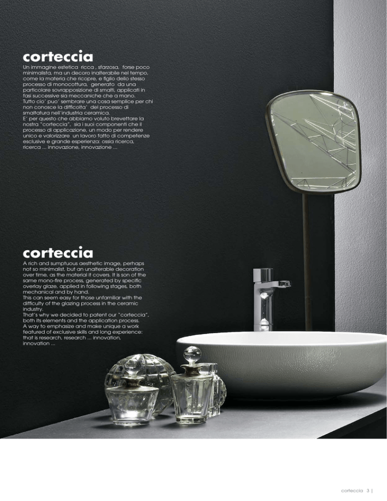 corteccia Un immagine estetica ricca , sfarzosa, forse poco minimalista, ma un decoro inalterabile nel tempo, come la materia che ricopre, e figlio dello stesso processo di monocottura, generato da una particolare sovrapposizione di smalti, applicati in fasi successive sia meccaniche che a mano. Tutto cio’ puo’ sembrare una cosa semplice per chi non conosce la difficolta’ del processo di smaltatura nell’industria ceramica. E’ per questo che abbiamo voluto brevettare la nostra “corteccia”, sia i suoi componenti che il processo di applicazione, un modo per rendere unico e valorizzare un lavoro fatto di competenze esclusive e grande esperienza: ossia ricerca, ricerca ... innovazione, innovazione ... corteccia A rich and sumptuous aesthetic image, perhaps not so minimalist, but an unalterable decoration over time, as the material it covers. It is son of the same mono-fire process, generated by specific overlay glaze, applied in following stages, both mechanical and by hand. This can seem easy for those unfamiliar with the difficulty of the glazing process in the ceramic industry. That’s why we decided to patent our “corteccia”, both its elements and the application process. A way to emphasize and make unique a work featured of exclusive skills and long experience: that is research, research ... innovation, innovation ... corteccia 3 | un dialogo con Angelo Rossini .01 .02 .03 .04 Tutto nasce dal desiderio di creare un oggetto che avesse un anima “materica”, un prodotto funzionale che riuscisse a comunicare il difficile e misterioso processo alchemico che da secoli trasforma un insieme di terre e materie prime naturali in materia piena , concreta e viva : la ceramica. Questa ricerca ci ha aperto la strada verso la sperimentazione che ha prodotto la nostra “CORTECCIA”. Era palese che laddove non si poteva modificare l’antico processo di impasto e cottura, bisognava lavorare sulle superfici , sullo smalto. Il primo passo e’ stato agire sui componenti che danno l’aspetto finale dell’oggetto, bisognava alterare il processo, modificare qualcosa nelle miscele, allora abbiamo provato con combinazioni che davano risultati sempre piu’ pregiati a livello di finitura, ma purtroppo non coprivano le imperfezioni , rendendo il pezzo inutilizzabile. Non bastava dunque lavorare sulle materie prime dello smalto, bisognava cambiare anche qualcosa nel processo di produzione, nella successione e nella modalita’ delle applicazioni dei componenti. Grazie alla tecnologia di nuovi macchinari abbiamo cominciato a sperimentare diverse soluzioni di spruzzo, e un giorno un effetto imprevedibile e straordinario e’ apparso sulla ceramica, una superficie smaltata nuova e mai uguale, un particolare segno materico a rilievo, un movimento plastico irregolare apparentemente irripetibile. Era un effetto nuovo, creato da un processo chimico che pero’ andava gestito e meccanizzato, per limitare la casualita’ estetica del disegno e allo stesso tempo renderlo ripetibile e ovviamente bello. Inoltre, cosa fondamentale , necessaria e indiscutibile era che conservasse le stesse caratteristiche chimico fisiche e funzionali del nostro prodotto finito attuale. Dunque, una lunga ricerca, la grande esperienza e un po’ di fortuna hanno prodotto quella che oggi noi chiamiamo “corteccia”, che siamo riusciti in seguito anche a colorare in maniera originale. a dialogue with Angelo Rossini .05 .01 Uscita stampo .02 CLIP nella finitura corteccia .03 Robot di spruzzo .04 Preparazione smalto .05 Fase di rifinitura | 4 corteccia .01 Mold release .02 CLIP in corteccia finishin .03 Spray Robot .04 Preparation enamel .05 Finishing phase Everything stems from the desire to create an object that had a “material”soul. A functional product that was able to communicate the difficult and mysterious alchemical process that for centuries has been transforming a blend of land and natural raw materials in a full, concrete and living material: ceramics. This research brought us to the experimentation that led us to “corteccia”, which in Italian stands for bark. It was pretty obvious that, changing the ancient process of mixing and firing could not be feasible, the only way, was to work on surfaces, on glazing. The first step was to work on the components that give the final appearance of the object. It was necessary to alter the process, to change something in the mixtures. Then we tried blends, which resulted in more and more quality level of finish. But unfortunately it did not cover imperfections, making the piece unusable. Working on the raw materials of glaze was not enough, it was also necessary to change something in the production process, in the method and sequence of the application of components... Thanks to the technology of new machineries, we began to experiment with different glazing solutions. One day an unpredictable and extraordinary effect appeared on the ceramic piece; a new and patchy glazed surface, a particular material mark relief, an irregular plastic movement, apparently unique. It was a new effect, created by a chemical process. However, in order to limit the aesthetics randomness of the design, but at the same time make it repeatable - and of course beautiful, it had to be managed and mechanized. In addiction, the fact that this new solution retained the same chemical-physical and functional features of our current finished product, was essential and indisputable. As a result of long research, experience and a bit of luck, we conceived what we now call “CORTECCIA”, to which we also gave a colour later. corteccia 5 | vaso e bidet sospesi CLAS, lavabo NATIVO wall-hung wc and bidet CLAS, washbasin NATIVO. | 6 corteccia corteccia 7 | | 8 corteccia corteccia 9 | | 10 corteccia corteccia 11 | Piatto in finitura CORTECCIA disponibile in bianco o nero Flat in CORTECCIA finish are available in black or white | 12 corteccia corteccia 13 | Art. CLC 245 bianco CORTECCIA Art. CLC 245 CO