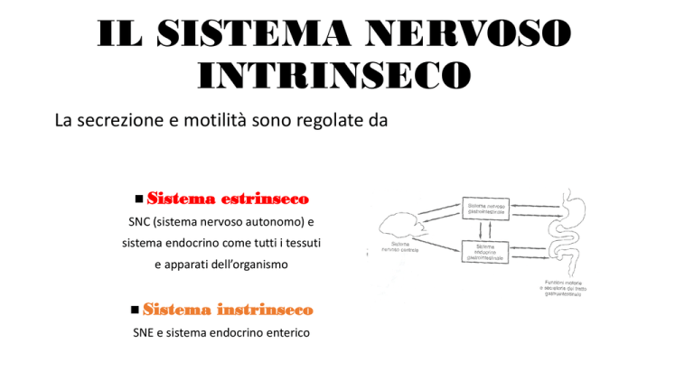 IL SISTEMA NERVOSO INTRINSECO La secrezione e motilità sono regolate da Sistema estrinseco SNC (sistema nervoso autonomo) e sistema endocrino come tutti i tessuti e apparati dell’organismo Sistema instrinseco SNE e sistema endocrino enterico Sistema Nervoso Enterico Il SNE e il sistema endocrino enterico da soli riescono a far funzionare il tratto gastro intestinale e a regolarne la funzione digestiva basandosi sulla quantità e qualità di cibo presente nel distretto. Il sistema di controllo estrinseco si limita a modulare la funzione propria del sistema di controllo intrinseco. Stratigrafia intestino Sistema nervoso intrinseco- SNE • Il SNE è presento per l’intera lunghezza del tratto gastrointestinale. Il tratto gastrointestinale ha un’organizzazione conservata nei diversi distretti: • La parete si divide in diversi strati: 1) mucosa internamente 2) Sottomucosa 3) Strato muscolare circolare interno 4) Strato muscolare longitudinale esterno 5) Sierosa estrenamente Sistema di controllo nervoso intrinseco- SNE • Sistema nervoso Enterico >> SNE • E’ un sistema nervoso sofisticato composto da diverse tipologie di neuroni simili a quelli presenti nel midollo spinale • I corpi cellulari dei neuroni enterici si organizzano entro reti o gangli posti: 1) Sottomucosa 2) Fra i due strati muscolari Sistema di controllo nervoso instrinseco – SNE• I corpi cellulari dei neuroni che costituiscono il SNE sono organizzati in due reti di gangli (= associazione di corpi cellulari e fibre nervose): • Il plesso sottomucoso o di Meisser che è composto da una catena di gangli collocati nella sottomucosa • Il plesso mienterico di Auerbach che si compone di una catena di gangli collocati fra i due strati di muscolatura • I plessi sono attraversati da fibre nervose che: 1) connettono fra loro gangli appartenenti ad uno stesso plesso o 2) connettono gangli propri del plesso sottomucoso a gangli del plesso mioenterico e viceversa Sistema nervoso enterico - SNE • I plessi del SNE sono costituiti da tre distinte categorie di neuroni: 1. Neuroni sensitivi (Afferenze sensitive) 2. Neuroni motori (Efferenze motorie) 3. Interneuroni o neuroni associativi Sistema nervoso enterico - SNE • Neuroni sensitivi Gli impulsi sensitivi provengono da recettori collocati lungo tratto gastroenterico classificabili in: Meccanocettori presenti negli strati muscolari risentono dalla distensione del distretto Chemiocettori situati nella mucosa rilevano la composizione chimica degli inegesta che transitano in quel distretto Neuroni motori Questi neuroni innervano: 1) parete dei vasi sanguigni 2) muscolatura enterica (ricordare che il controllo della contrazione della muscolatura liscia è meno preciso di quello della muscolatura striata che prevede una placca neuromuscolare. I neuroni motori che innervano la muscolatura liscia terminano in arbortizzazioni che rilasciano da specifiche strutture vescicolari –varicosità- nei limitrofi spazi extracellulari le sostanze ad azione neuroregolatrice che sono in grado di influenzare i potenziali transemembranari di cellule muscolari e secernenti) 3) ghiandole secernenti enzimi digestivi Sostanze neuroregolatrici o neurotrasmettitori • Stimolatori: ad azione depolarizzante Maggior parte rilasciati da neuroni colinergici (Ach) Alcuni di natura peptidica (es. sostanza k o P) Inibitori: ad azione iperpolarizzante Maggior parte di natura peptidica (es. VIP peptide intestinale vasoattivo) Non peptidici (es. ossido nitrico e adenosin trifosfato) Sistema di controllo nervoso estrinseco – SNA • Il sistema nervoso estrinseco è quella rete di nervi che connette il sistema nervoso intrinseco (SNE) al sistema nervoso centrale (SNC) ed è costituito dal sistema nervoso autonomo (SNA: simpatico e parasimpatico) Sistema di controllo nervoso estrinseco – SNA- Sistema nervoso parasimpatico Il sistema nervoso parasimpatico è costituito da fibre pre e post gangliari che viaggiano per gran parte attraverso nervo vago a parte, il tratto sacrale, che è collocato nel nervo pelvico Sistema di controllo nervoso estrinseco – SNA- Sistema nervoso parasimpatico • Il sistema nervoso parasimpatico è costituito da fibre pre e post gangliari ACH ACH Tratto gastroenterico Le fibre pregangliari arrivano fino dentro la parete del tratto gastrointestinale e prendono rapporto sinaptico con neuroni del SNE. Per cui è difficile distinguere le fibre parasimpatiche postgangliari perché sono un tutt’uno con i neuroni del SNE. I neuroni del SNE possono ricevere impulsi da 1) Fibre pregangliari del parasimpatico 2) Interneuroni enterici 3) Neuroni sensitivi afferenti del SNE L’Ach è il neuromediatore delle fibre parasimpatiche pregangliari e di molti neuroni del SNE (fra cui fibre postgangliari) Sistema di controllo nervoso estrinseco – SNASistema nervoso simpatico • Il sistema nervoso simpatico è costituito da fibre pre e post gangliari. Le fibre post gangliari derivano dai gangli prevertebrali (celiaco, mesenterico craniale a caudale) e entrano nel tratto gastro intestinale come nervi splancnici e attraverso vasi intestinali. Sistema di controllo nervoso estrinseco – SNASistema nervoso simpatico Gangli prevertebrali Tratto gastroenterico I neuroni post gangliari rilasciano noradrenalina e possono prendere direttamente rapporto sinaptico con neuroni del SNE oppure rilasciano dalle varicosità noradrenalina nelle vicinanze di vasi, muscoli e ghiandole. BGA BGA • Vie afferenti: forniscono informazione sullo stato del sistema ai centri superiori. - fibre afferenti chemio-sensitive: monitorano pH, osmolarità, presenza di diverse molecole (aminoacidi, glucosio, lipidi). Sono molto importanti nel piccolo intestino dove analizzano la composizione delle ingesta e regolano il processo digestivo. Sono inoltre importanti i recettori in grado di identificare sostanze nocive, che inducono vomito od altri eventi in grado di allontanare le sostanze potenzialmente tossiche. - fibre affe