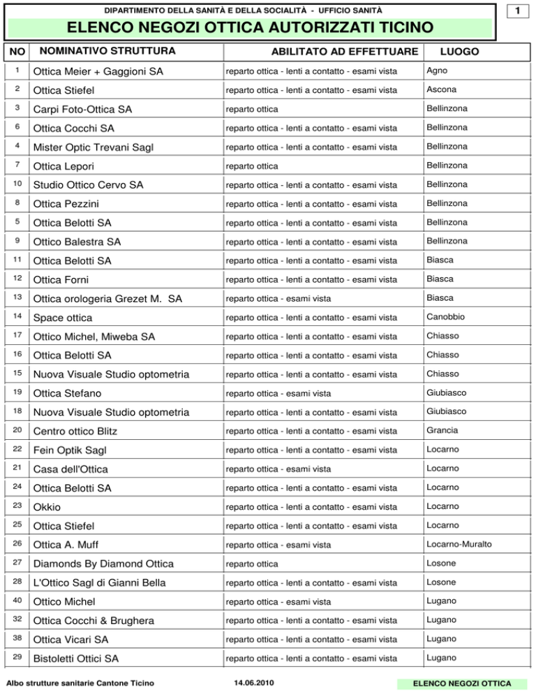 1 DIPARTIMENTO DELLA SANITÀ E DELLA SOCIALITÀ - UFFICIO SANITÀ ELENCO NEGOZI OTTICA AUTORIZZATI TICINO NO NOMINATIVO STRUTTURA ABILITATO AD EFFETTUARE LUOGO 1 Ottica Meier + Gaggioni SA reparto ottica - lenti a contatto - esami vista Agno 2 Ottica Stiefel reparto ottica - lenti a contatto - esami vista Ascona 3 Carpi Foto-Ottica SA reparto ottica Bellinzona 6 Ottica Cocchi SA reparto ottica - lenti a contatto - esami vista Bellinzona 4 Mister Optic Trevani Sagl reparto ottica - lenti a contatto - esami vista Bellinzona 7 Ottica Lepori reparto ottica Bellinzona 10 Studio Ottico Cervo SA reparto ottica - lenti a contatto - esami vista Bellinzona 8 Ottica Pezzini reparto ottica - lenti a contatto - esami vista Bellinzona 5 Ottica Belotti SA reparto ottica - lenti a contatto - esami vista Bellinzona 9 Ottico Balestra SA reparto ottica - lenti a contatto - esami vista Bellinzona 11 Ottica Belotti SA reparto ottica - lenti a contatto - esami vista Biasca 12 Ottica Forni reparto ottica - lenti a contatto - esami vista Biasca 13 Ottica orologeria Grezet M. SA reparto ottica - esami vista Biasca 14 Space ottica reparto ottica - lenti a contatto - esami vista Canobbio 17 Ottico Michel, Miweba SA reparto ottica - lenti a contatto - esami vista Chiasso 16 Ottica Belotti SA reparto ottica - lenti a contatto - esami vista Chiasso 15 Nuova Visuale Studio optometria reparto ottica - lenti a contatto - esami vista Chiasso 19 Ottica Stefano reparto ottica - esami vista Giubiasco 18 Nuova Visuale Studio optometria reparto ottica - lenti a contatto - esami vista Giubiasco 20 Centro ottico Blitz reparto ottica - lenti a contatto - esami vista Grancia 22 Fein Optik Sagl reparto ottica - lenti a contatto - esami vista Locarno 21 Casa dell'Ottica reparto ottica - esami vista Locarno 24 Ottica Belotti SA reparto ottica - lenti a contatto - esami vista Locarno 23 Okkio reparto ottica - lenti a contatto - esami vista Locarno 25 Ottica Stiefel reparto ottica - lenti a contatto - esami vista Locarno 26 Ottica A. Muff reparto ottica - esami vista Locarno-Muralto 27 Diamonds By Diamond Ottica reparto ottica Losone 28 L'Ottico Sagl di Gianni Bella reparto ottica - lenti a contatto - esami vista Losone 40 Ottico Michel reparto ottica - esami vista Lugano 32 Ottica Cocchi & Brughera reparto ottica - lenti a contatto - esami vista Lugano 38 Ottica Vicari SA reparto ottica - lenti a contatto - esami vista Lugano 29 Bistoletti Ottici SA reparto ottica - lenti a contatto - esami vista Lugano Albo strutture sanitarie Cantone Ticino 14.06.2010 ELENCO NEGOZI OTTICA 2 DIPARTIMENTO DELLA SANITÀ E DELLA SOCIALITÀ - UFFICIO SANITÀ ELENCO NEGOZI OTTICA AUTORIZZATI TICINO NO NOMINATIVO STRUTTURA ABILITATO AD EFFETTUARE LUOGO 30 Ottica Belotti SA reparto ottica - lenti a contatto - esami vista Lugano 33 Ottica Cottinelli Optostyle SA reparto ottica - lenti a contatto - esami vista Lugano 34 Ottica Eredi Bonaglia SA reparto ottica - lenti a contatto - esami vista Lugano 37 Ottica Trevano SA reparto ottica Lugano 39 Ottico Dozio SA reparto ottica - lenti a contatto - esami vista Lugano 35 Ottica Göette SA reparto ottica - lenti a contatto - esami vista Lugano 41 Ottico Michel reparto ottica - lenti a contatto - esami vista Lugano 31 Ottica Besso reparto ottica - esami vista Lugano 36 Ottica Stucki reparto ottica - esami vista Lugano 42 Ottica Wintgen reparto ottica - esami vista Lugano-Cassarate 43 Pianeta Ottica reparto ottica - lenti a contatto - esami vista Magliaso Stile Ottica reparto ottica - lenti a contatto - esami vista Mendrisio Ottica Belotti reparto ottica - lenti a contatto - esami vista Mendrisio 46 Ottica Meier + Gaggioni reparto ottica - lenti a contatto - esami vista Mendrisio 45 Mister Optic Trevani SAGL reparto ottica - lenti a contatto - esami vista Mendrisio 44 Centro ottico Blitz reparto ottica - lenti a contatto - esami vista Mendrisio 47 Ottica Pedroli Sagl reparto ottica - lenti a contatto - esami vista Mendrisio 48 Ottica Squizzato SA reparto ottica - lenti a contatto - esami vista Mendrisio 49 Ottica Reichmuth SA reparto ottica - lenti a contatto - esami vista Muralto 50 Ottica Zanetti Sagl reparto ottica Paradiso 51 Ottica Solare reparto ottica - lenti a contatto - esami vista Riazzino 52 Swiss Quality Optician SA reparto ottica - lenti a contatto - esami vista S. Antonino 54 Occhiali & Occhiali reparto ottica - lenti a contatto - esami vista Sant'Antonino 53 Centro ottico Blitz reparto ottica - lenti a contatto - esami vista Sant'Antonino 55 Ottica Rusca reparto ottica - lenti a contatto - esami vista Savosa 56 Ottica Meier + Gaggioni SA reparto ottica - lenti a contatto - esami vista Serfontana 58 Ottica Stiefel reparto ottica - lenti a contatto - esami vista Tenero 57 Centro ottico Blitz reparto ottica - lenti a contatto - esami vista Tenero 59 CentrO Ottico Andreoli SA reparto ottica - lenti a contatto - esami vista Tesserete Albo strutture sanitarie Cantone Ticino 14.06.2010 ELENCO NEGOZI OTTICA