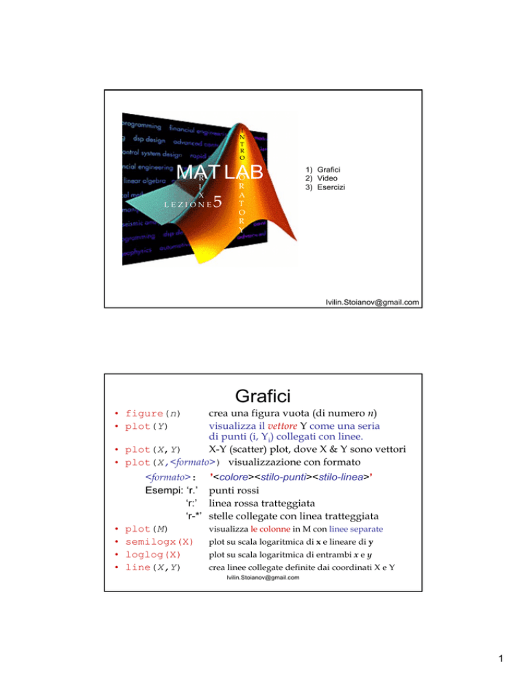 I N T R O MAT LAB R I X LEZIONE 5 O R A T O R Y 1) Grafici 2) Video 3) Esercizi [email protected] Grafici crea una figura vuota (di numero n) visualizza il vettore Y come una seria di punti (i, Yi) collegati con linee. • plot(X,Y) X-Y (scatter) plot, dove X & Y sono vettori • plot(X,<formato>) visualizzazione con formato • figure(n) • plot(Y) • • • • <formato>: Esempi: ‘r.’ ‘r:’ ‘r-*’ plot(M) semilogx(X) loglog(X) line(X,Y) ’<colore><stilo-punti><stilo-linea>’ punti rossi linea rossa tratteggiata stelle collegate con linea tratteggiata visualizza le colonne in M con linee separate plot su scala logaritmica di x e lineare di y plot su scala logaritmica di entrambi x e y crea linee collegate definite dai coordinati X e Y [email protected] 1 Grafici – Esempi T=[0:.05:10]; % Y=sin(T); % figure(1); % plot(T,Y); % tempo una sinusoide creare figura numero 1 grafico della sinusoide T=[0:.05:10]; % tempo figure(1); % creare figura numero 1 plot(sin(T),cos(T));% disegnare un cerchio X=1:100; % X figure(1); semilogx(X,log(X)); % log(X) su scala log fa linea retta [email protected] Assi • • • • • • • • • • axis([xmin xmay ymin ymax]) pone i limiti delle asse V=axis riporta i limiti attuali axis auto limiti secondo i dati axis xy l’origine: in basso a sx axis ij l’origine: in alto a sx axis equal dx=dy axis image dx=dy; stretto axis square fa il grafico quadrato axis off fa sparire le asse axis on fa apparire le asse [email protected] 2 Grafici – Esempi T=[0:.05:10]; % tempo figure(1); % creare figura numero 1 plot(sin(T),cos(T));% disegnare un cerchio axis([-1.5 1.5 -1.5 1.5]); axis square; % disegnare un cerchio Compito: 1) Creare una funzione che disegna un cerchio con raggio r e posizione x,y 2) Disegnare una serie di cerchi con raggio da 0.1 a 1 con passo 0.1 e posizione X da -5 a 5 con passo 1 e posizione Y da 5 a -5 con passo 1. - Effettuare pausa 100ms tra una immagine ed altra: pause(0.1); - Porre limiti degli assi: [-10 10 -10 10] [email protected] Titoli • title(<titolo>) • xlabel(<titolo>) • ylabel(<titolo>) • text(x,y,’testo’) posiz. (x,y) titolo di un (sotto)grafico etichetta della asse X etichetta della asse Y mostra un testo alla • legend(S) legenda degli elementi grafici. S: matr. di celle con stringhe • colorbar una bara con il mapping colori - numeri visualizzati [email protected] 3 Grafici – Esempi T1=[0:.05:10];% tempo a passo lento Y1=sin(T1); % una sinusoide figure(1); % creare una figura vuota plot(T1,Y1); % grafico della sinusoide title(‘sin’); % aggiungere titolo del grafico xlabel(‘t’); % indicare il significato dell’ascissa pause; % aspettare che l’utente preme un tasto T2=[0:.5:10]; % tempo a passo veloce Y2=cos(T2); plot(T2,Y2,’o’); title(‘cos’); % aggiungere titolo xlabel(‘t’); % indicare il significato dell’ascissa [email protected] Figure complesse • subplot(r,c,i) crea r x c sotto-grafici e seleziona il grafico numero i per i plot successivi. • axes(‘position’,[X,Y,Xsize,Ysize]) crea un grafico al posto indicato; le misure sono relative [0 – 1] • hold on/off mantenere si o no gli elementi grafici creati fino questo momento • cla • clf polizia del plot attuale polizia della figura attuale • h=gcf • h=gca • pause indice (handle) della figura attuale indice (handle) del plot attuale mettere in attesa, finche non si preme un tasto [email protected] 4 Grafici – Compito Compito: Disegnare una figura – rete neurale con 2 strati di neuroni collegati tra di loro. - Ogni neurone è rappresentato da un cerchio - Il primo strato ha 10 neuroni ed il secondo ha 5 neuroni. - Il raggio dei neuroni del primo strato = 1 e quello del secondo, 1.5 - Scrivere il nome di ogni neurone (strato, numero neurone) Indicazioni: - Definire in una struttura tutte le descrizioni grafici dei neuroni - Per disegnare i neuroni, usare la funzione circle definita prima - Con due cicli annidati, disegnare ogni neurone di ogni strato - Con due cicli annidati, disegnare linee che collegano ogni due neuroni. [email protected] Grafici speciali • pcolor(M) • surface(M) • mesh(M) visualizza con colori i valori di una matrice M visualizza M come una superficie 3D visualizza M come una griglia 3D • image(I) visualizza come immagine una matrice I di dimensioni (m,n) o (m,n,3) • hist(X,n) istogramma con n bin dei dati in X. Se X è matrice, un istogr. per colonna. • cellplot(S) visualizzazione grafica di una matrice di celle [email protected] 5 Grafici – Esempi - scaricare da internet un’immagine jpeg - caricare l’immagine con I=imread(‘xxx.jpg’); - visualizzarla in un subplot: subplot(1,3,1); - visualizzare l’istogramma di ogni suo colore Ir=single(I(:,:,1)); subplot(1,3,2); hist(Ir(:),100); - fare elaborazioni - visualizzarla di nuovo in un altro subplot [email protected] Video: Import • V=aviinfo(‘filename’) riportare le caratteristiche di un video file (avi) • M=aviread(‘filename’) importare un video file (avi), creando una matrice M che contiene dei frame del video (chiamata “movie”) • movie(h,M,n,fps,loc) visualizzare n volte un movie M su figura/axes con handle h, con fps, e posizione loc [email protected] 6 Visualizzare un Video % Importare un file video M = aviread(‘test.avi'); % Preparare una figura in quale sarà visualizzato il movie hf=figure('position',[300 200 320 240]); % [Left Bottom W H] % Visualizzato una volta il movie M con 10 fps. movie(hf,M,1,10); [email protected] Creare dei Frames per un Movie • F=getframe(fig_handle,[left bottom width height]) creare un videoframe F da una figura • F=im2frame(I) creare un videoframe F da un immagine I (matrice 2-D o 3-D) M(i)=F impostare il frame i del movie M [email protected] 7 Modificare un Movie % Importare un file video M = aviread(‘test.avi'); % Aggiungere al M tutti i suoi frame, partendo dal ultimo. nfM=length(M); for i=1:nfM M(nfM+i) = M( nfM+1-i ); end % Preparare una 