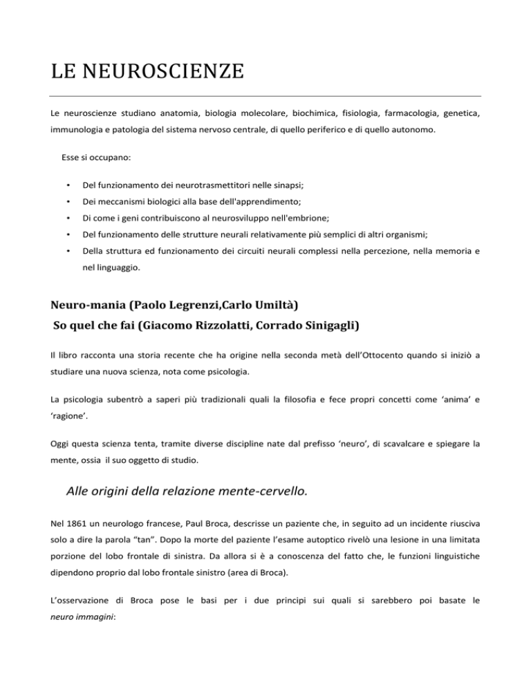 LE NEUROSCIENZE Le neuroscienze studiano anatomia, biologia molecolare, biochimica, fisiologia, farmacologia, genetica, immunologia e patologia del sistema nervoso centrale, di quello periferico e di quello autonomo. Esse si occupano: • Del funzionamento dei neurotrasmettitori nelle sinapsi; • Dei meccanismi biologici alla base dell'apprendimento; • Di come i geni contribuiscono al neurosviluppo nell'embrione; • Del funzionamento delle strutture neurali relativamente più semplici di altri organismi; • Della struttura ed funzionamento dei circuiti neurali complessi nella percezione, nella memoria e nel linguaggio. Neuro-mania (Paolo Legrenzi,Carlo Umiltà) So quel che fai (Giacomo Rizzolatti, Corrado Sinigagli) Il libro racconta una storia recente che ha origine nella seconda metà dell’Ottocento quando si iniziò a studiare una nuova scienza, nota come psicologia. La psicologia subentrò a saperi più tradizionali quali la filosofia e fece propri concetti come ‘anima’ e ‘ragione’. Oggi questa scienza tenta, tramite diverse discipline nate dal prefisso ‘neuro’, di scavalcare e spiegare la mente, ossia il suo oggetto di studio. Alle origini della relazione mente-cervello. Nel 1861 un neurologo francese, Paul Broca, descrisse un paziente che, in seguito ad un incidente riusciva solo a dire la parola “tan”. Dopo la morte del paziente l’esame autoptico rivelò una lesione in una limitata porzione del lobo frontale di sinistra. Da allora si è a conoscenza del fatto che, le funzioni linguistiche dipendono proprio dal lobo frontale sinistro (area di Broca). L’osservazione di Broca pose le basi per i due principi sui quali si sarebbero poi basate le neuro immagini: -Il cervello è scomponibile in tante pozioni che svolgono diverse funzioni; -Queste sono indipendenti le une dalle altre Queste osservazione non era però del tutto nuova, infatti verso la fine del Settecento, Franz Joseph Gall aveva intuito che dovevano esistere aree nel nostro cervello deputate a diverse funzioni. Tuttavia il suo errore fu quello di associare lo sviluppo di tali funzioni alla conformazione esterna del cranio (i bernoccoli ad esempio), infatti secondo le sue ipotesi più la sporgenza era evidente, maggiore era la funzione mentale di quell’area. Da queste scoperte si arrivò a dedurre che un’analisi accurata dei disturbi presentati dal paziente permette di risalire alla funzione svolta normalmente dall’area cerebrale danneggiata. Alla fine dell’Ottocento Mosso studiava le variazioni della pressione del sangue nelle arterie cerebrali. In un paziente adulto Mosso notò che le pulsazioni aumentavano quando questo udiva il suono delle campane di mezzogiorno, che per l’uomo indicavano un momento di preghiera. Capì inoltre che l’ampiezza delle pulsazioni era indipendente dalla frequenza cardiaca. Mosso aveva dato inizio alla neuroteologia. I neuroni specchio I neuroni specchio (mirror neurons) furono scoperti dal neurofisiologo italiano Giacomo Rizzolatti alla fine del Novecento. Neuroni: cellule specializzate per scambiarsi impulsi nervosi che vengono recepiti attraverso appendici relativamente corte (i dendriti) e trasmessi grazie a un’appendice molto più lunga (l’assone). I neuroni specchio permettono di spiegare fisiologicamente la nostra capacità di porci in relazione con gli altri. Quando osserviamo un nostro simile compiere una certa azione si attivano, nel nostro cervello, gli stessi neuroni che entrano in gioco quando siamo noi a compiere quella stessa azione. Per questo possiamo comprendere con facilità le azioni degli altri: nel nostro cervello si accendono circuiti nervosi che richiamano analoghe azioni compiute da noi in passato. Quest'ultima precisazione è molto importante, infatti sembrerebbe che il "sistema specchio" entri in azione soltanto quando il soggetto osserva un comportamento che egli stesso ha posto in atto in precedenza. Ciascun neurone visivo è sensibile a una caratteristica particolare dell’ambiente visivo. I neuroni specchio codificano caratteristiche particolarmente complesse dell’ambiente esterno. Rizzolatti scoprì che, in alcune aree dei lobi frontale e parietale di una scimmia, vi sono neuroni che rispondono a gesti specifici per un certo scopo. Per esempio i neuroni specchio rispondono quando una scimmia osserva un’altra scimmia o un essere umano che afferra del cibo e se lo porta alla bocca, compiendo lo stesso movimento. Studi successivi, effettuati con tecniche non invasive, hanno dimostrato l'esistenza di sistemi simili anche negli uomini. Sembrerebbe che essi interessino diverse aree cerebrali, comprese quelle del linguaggio. Anche il riconoscimento delle emozioni sembra poggiare su un insieme di circuiti neurali che, per quanto differenti, condividono quella proprietà "specchio" già rilevata nel caso della comprensione delle azioni. E' stato possibile studiare sperimentalmente alcune emozioni primarie: i risultati mostrano che quando osserviamo negli altri una manifestazione di dolore o di disgusto si attiva il medesimo substrato neurale collegato alla percezione in prima persona dello stesso tipo di emozione. La scoperta dei neuroni specchio potrebbe offrire una spiegazione biologica per almeno alcune forme di autismo, come, ad esempio, la sindrome di Asperger: in effetti, gli esperimenti in tal senso finora condotti sembrerebbero indicare un ridotto funzionamento di questo tipo di neuroni nei bambini autistici. I neuroni specchio implicano l'esistenza di un meccanismo che consente di comprendere immediatamente il significato delle azioni altrui e persino delle intenzioni ad esse sottese senza porre in atto alcun tipo di ragionamento. È chiaro che il neurone non risponde ad un movimento ma allo scopo di un gesto. I neuroni specchio, che sembrano esistere anche nel cervello umano, sono in grado di spiegare come sia possibile comprendere le intenzioni che guidano i gesti altrui. A. LA VERGATA,FILOSOFIA E CULTURA,F. Trab