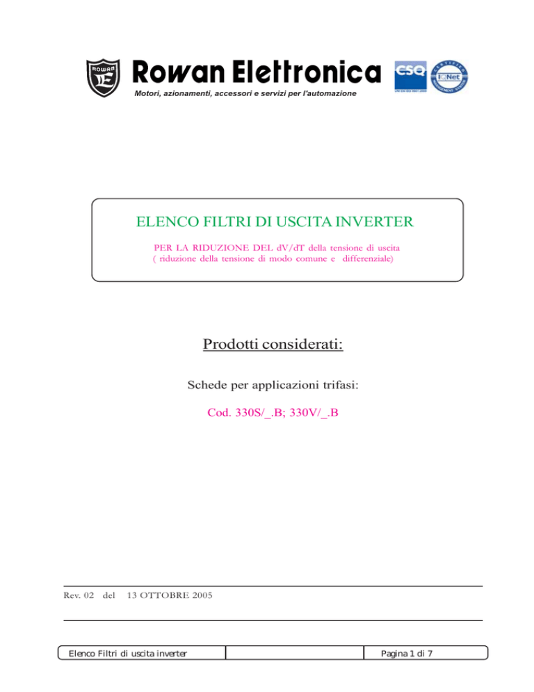 Motori, azionamenti, accessori e servizi per l'automazione ELENCO FILTRI DI USCITA INVERTER PER LA RIDUZIONE DEL dV/dT della tensione di uscita ( riduzione della tensione di modo comune e differenziale) Prodotti considerati: Schede per applicazioni trifasi: Cod. 330S/_.B; 330V/_.B Rev. 02 del 13 OTTOBRE 2005 Elenco Filtri di uscita inverter Pagina 1 di 7 INDICE Presentazione ................................... pag.3 Trattazione teorica.............................pag.4 Connessione di principio, e risultati...........pag.6 Ingombri e abbinamenti ......................... pag.7 Elenco Filtri di uscita inverter Pagina 2 di 7 PRESENTAZIONE L’attuale tendenza di progettazione degli azionamenti che alimentano motori o in generale macchine elettriche ( monofasi e trifasi), è quella di raggiungere prestazioni dinamiche elevate. Questo risultato,si è raggiunto anche aumentando la velocità di commutazione degli interruttori elettronici, possibile con l’avvento di dispositivi come gli IGBT, che commutano a 5-20 kHz con tempi di salita di circa 0,1 ms. Per contro, se da un lato aumento le prestazioni, dall’altro aumento il dv/dt (la tensione di modo comune e differenziale)e, quindi le sollecitazioni tra gli avvolgimenti, e tra avvolgimenti e terra,nei cuscinetti e, in più aumentano i disturbi di origine elettromagnetica (EMI). Prendendo come esempio il caso di un motore asincrono commerciale, quando è alimentato direttamente da un inverter a PWM, l’elevato dv/dt della tensione , genera per la presenza di capacità parassite spira-spira, correnti di dispersione tra le fasi di avvolgimento. La presenza di capacità parasite di dispersione tra avvolgimenti-massa e tra rotore-massa, provoca microscariche che deteriorano gli avvolgimenti e i cuscinetti, perciò riduco il tempo di vita della macchina in genere. Se il collegamento dell’inverter alla macchina elettrica è fatto utilizzando collegamenti lunghi, gli effetti sopra esposti aumentano perchè il collegamento ha una sua induttanza di fase e capacità di dispersione fase-fase distribuite, che mi aumentano le sollecitazione di tensione(effetto “elastico”). Misure eseguite su un motore ( collegato a triangolo, cioè nel caso peggiore) alimentato da inverter a PWM con cavo commerciale lungo, circa 40m, hanno provato che il motore è solecitato con un dv/dt di circa 2800 V/ms, mentre all’uscita dell’inverter la dv/dt era di circa 1500 V/ms. Elenco Filtri di uscita inverter Pagina 3 di 7 TRATTAZIONE TEORICA Il collegamento lungo si comporta alla frequenza di commutazione degli IGBT come una antenna non adattata, quindi ci sarà una “onda viaggiante V+” che si propaga verso il carico (motore) e una “onda di tensione inversa V-” che si propaga verso l’inverter. La somma di queste due onde, sul carico provoca una sovratensione,la quale mediamente non sovralimenta il motore, ma istante per istante mi dà una maggiore sollecitazione di tensione. Tradotto in formule la sovratensione fase-fase: tt <tr /3 VLL , p Vdc ,bus τ Load Z0 = 3 ⋅ lcable ⋅ τ Load +1 v ⋅ tr tensione picco-picco tra fasi; VLL , p tt = = lcable = lcable ⋅ LL ⋅ C L v Z − Zo = Load Z Load + Zo LL CL è il tempo di propagazione dell’onda viaggiante V+; è il coefficiente di riflessione sul carico; è l’impedenza caratteristica della linea; te mpo di s alita PWM (m ms ) Lunghe zza max cavi pe r limitare una s ovrate ns ione pari al doppio de lla te ns ione de l bus (m) 0.1 6 0.5 39 1 59 2 118 3 177 4 236 5 295 Elenco Filtri di uscita inverter Pagina 4 di 7 Tensione VLL,p/Vbus (V) Tensione normalizzata del motore in funzione del tempo di salita del segnale PWM 2 1,5 1 0,5 0 0 1 2 3 4 5 6 tempo di salita del segnale PWM (micros) Lcable=15m Lcable=30m Lcable=60m DETERIORAMENTO DEGLI AVVOLGIMEMTI La sovratensione mi deteriora gli avvolgimenti, mediante le microscariche, specialmente se i motori ( quelli commerciali) hanno gli avvolgimenti a strato di isolamento singolo, o senza impregnazione delle matasse sotto vuoto. DETERIORAMENTO DI CUSCINETTI La sovratensione generata provoca, anche il deterioramento dei cuscinetti, i quali durante il funzionamento sono come dei microinterruttori che cortocircuitano verso la massa (collegata a terra), il potenziale di modo comune applicato sulle capacità parassite tra rotore e statore-cassa. Per ridurre il potenziale di modo comune e quindi prolungare la vita di cuscinetti,( già sollecitati da usura meccanica), bisogna usare o un tipo di cuscinetto non standard( con grasso conduttivo),o usare uno schermo elettrostatico (Shielded induction motor), oppure cambiare tipo di modulazione. Queste sono tecniche costose, quindi un metodo per “addolcire” il fronte di salita/ discesa, che è la causa della sovratensione e delle correnti di dispersione, è l’utilizzo di filtri di modo comune e differenziale, siglati FIT.DV/DT.__A, che vengono interposti tra l’inverter e il carico trifase, subito dopo le ferriti ANTI-EMI in prossimità dell’inverter. Collegando il FIT.DV/DT.__A subito a valle dell’inverter, riduco il dv/dt il quale non riuscirà più a “crescere”, anche se collego il motore mediante cavi lunghi. Elenco Filtri di uscita inverter Pagina 5 di 7 CONNESSIONE DI PRINCIPIO MOTORE FILTRO RIDUZIONE dV/dt Canaletta metallica o cavo schermato INDUTTANZA TRIFASE FILTRO anti EMI FERRITE PE fusibile - F+ F W V U T S R MORSETTIERA POTENZA RESISTENZA DI FRENATURA fusibili COD. 330_/_ LINEA VENTILATORE Andamenti della tensione all’uscita dell’inverter. I fronti sono a 1500V/ms sull’inverter, e se usassi collegamenti lunghi (oltre 40m) avrei circa 3000V/ms sul carico. Elenco Filtri di uscita inverter U V W R FILTRO RIDUZIONE dV/dt S T CARICO USCITA INVERTER RISULTATI Andamenti della tensione all’uscita del filtro (lato carico). Sono presenti fronti più dolci dv/dt<500V/ms, anche dopo 40m Pagina 6 di 7 Elenco Filtri di uscita inverter Pagina 7 di 7 200 300 400 FIT.DV/DT.200A FIT.DV/DT.300A FIT.DV/DT