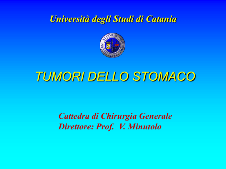 Università degli Studi di Catania TUMORI DELLO STOMACO Cattedra di Chirurgia Generale Direttore: Prof. V. Minutolo Tumori dello stomaco • Benigni • Maligni Tumori benigni dello stomaco Hanno generalmente aspetto polipoide ed originano dalla mucosa o dagli strati più profondi della parete gastrica e possono quindi essere classificati in : • tumori epiteliali • tumori mesenchimali. Tumori benigni dello stomaco Sono piuttosto rari: • 20% di tutti i tumori benigni del tubo digerente • 10% di tutte le neoplasie gastriche Tumori benigni dello stomaco • Rapporto M/F : 1 • Età : > 40 anni per i tumori epiteliali e > 60 anni per quelli mesenchimali Tumori benigni epiteliali dello stomaco Istologicamente hanno una struttura adenomatosa. Da un punto di macroscopico, anche se è nota l’esistenza di adenomi “piatti”, essi si presentano generalmente come polipi. I polipi gastrici, nelle varie forme, hanno un’incidenza del 2-3% nei pazienti sottoposti a gastroscopia. Tumori benigni epiteliali dello stomaco • Polipi iperplastici : la maggior parte • Polipi adenomatosi : 25 % ( possibile degenerazione neoplastica ) • Polipi amartomatosi : rari Tumori benigni epiteliali dello stomaco Polipi adenomatosi • Tubulari • Papillari ( villosi ) • Tubulo-papillari Tumori benigni epiteliali dello stomaco Polipi adenomatosi Una adenomatosi gastrica si può spesso riscontrare associata a poliposi del tratto digerente: nel 30% dei pazienti affetti da poliposi retto-colica familiare o nella sindrome di Gardner in cui viene recentemente segnalata con frequenza crescente Tumori benigni epiteliali dello stomaco • • • • Polipi adenomatosi Generalmente unici ( antro ) Sessili ( raramente peduncolati ) Dimensioni variabili Degenerazione neoplastica : 30-40% Tumori benigni epiteliali dello stomaco Polipi adenomatosi • Generalmente asintomatici • Anemia sideropenica ( sanguinamento cronico ) • Vomito e dolore epigastrico ( invaginazione del polipo a livello pilorico ) Tumori benigni epiteliali dello stomaco Polipi adenomatosi Diagnosi • Radiologica • Endoscopica Tumori benigni epiteliali dello stomaco Polipi adenomatosi Fatta eccezione per le lesioni villose, non esistono caratteristiche endoscopiche peculiari per discriminare i polipi adenomatosi da quelli iperplastici o da altri tipi di tumori epiteliali. È pertanto necessario eseguire biopsie nel corso dell’esame gastroscopico Tumori benigni epiteliali dello stomaco Polipi adenomatosi La presenza di un’erosione o di un’ulcerazione centrale, specialmente nelle forme sessili, può essere un rilievo indicativo di trasformazione maligna. Tumori benigni epiteliali dello stomaco Polipi adenomatosi Terapia • Endoscopica • Chirurgica ( open, laparoscopica ) Tumori benigni mesenchimali dello stomaco • Leiomiomi • Tumori neurogeni • Altri tumori mesenchimali Tumori benigni mesenchimali dello stomaco Leiomiomi • • • • • • • Frequenti Originano dalla muscolatura liscia della parete gastrica Piccole dimensioni : ≤ 3 cm Fondo e porzione superiore del corpo gastrico Mucosa soprastante normale o con ombelicatura Sviluppo intramurale o esofitico Degenerazione neoplastica rara Tumori benigni mesenchimali dello stomaco Tumori neurogeni • • • • • Originano dalle guaine di Schwann delle fibre mieliniche Piccola curva della porzione intermedia dello stomaco Crescita lenta sia verso il lume che verso l’esterno Ulcerazione della mucosa e sanguinamento Alto potenziale maligno Tumori benigni mesenchimali dello stomaco Altri tumori • • • • • Fibromi Lipomi Linfangiomi Tumori glomici Granuloma eosinofilo Tumori benigni mesenchimali dello stomaco GIST I tumori stromali gastrointestinali (denominati GIST ) sono i tumori mesenchimali ad origine dal tessuto connettivo, più frequenti nell'apparato gastrointestinale e rappresentano in tutto 1-3 % di tutti i tumori in questa parte del corpo Tumori benigni mesenchimali dello stomaco Sede % Commento esofago 2 stomaco 60-65 1-3% dei tumori gastrici intestino tenue 20-25 15-20% dei tumori del tenue colon-retto 5-10 0,1% dei tumori colorettali altre sedi 5 Retroperitoneo,omento, colecisti, appendice, pancreas Tumori benigni mesenchimali dello stomaco GIST Solo dal 1998, in seguito alla scoperta su questi tumori di determinati antigeni (CD117), viene riconosciuta una categoria tumorale propria Tumori benigni mesenchimali dello stomaco GIST Definisce un gruppo di neoplasie mesenchimali che esprime un antigene di superficie (CD117), non presente nelle neoplasie neuronali e muscolari pur avendo cellule neuronali e muscolari Tumori benigni mesenchimali dello stomaco GIST Sono positivi per la proteina Kit, recettore tyrosinekinase growth factor, presente nel 95% delle cellule del Gist Tumori benigni mesenchimali dello stomaco Pathology – Research and Practice 202 (2006) 119–123 TEACHING CASE About a case of GIST occurring during pregnancy with immunohistochemical expression of epidermal growth factor receptor and progesterone receptor S. Lanzafame, V. Minutolo, R. Caltabiano, O. Minutolo, B. Marino, G. Gagliano, S. D’Asta Tumori benigni mesenchimali dello stomaco GIST GIST si trovano nel 50-70 % dei casi nello stomaco, nel 20-30 % dei casi nell'intestino tenue Tumori benigni mesenchimali dello stomaco Diagnosi Essendo la sintomatologia dei tumori mesenchimali scarsamente specifica in assenza di complicanze, il reperto di tali lesioni è spesso occasionale. Tumori benigni mesenchimali dello stomaco Diagnosi • • • • • Esame clinico Esame radiologico Esame endoscopico Ecografia e TAC Ecoendoscopia Tumori benigni mesenchimali dello stomaco Diagnosi Esame clinico L’esame clinico non rivela alcun segno tranne che in rari casi di tumefazioni palpabili Tumori benigni mesenchimali dello stomaco Diagnosi Esame radiologico L’indagine radiologica può dimostrare immagini lacunari rotondeggianti con ulcerazioni alla sommità o segni indiretti di defor
