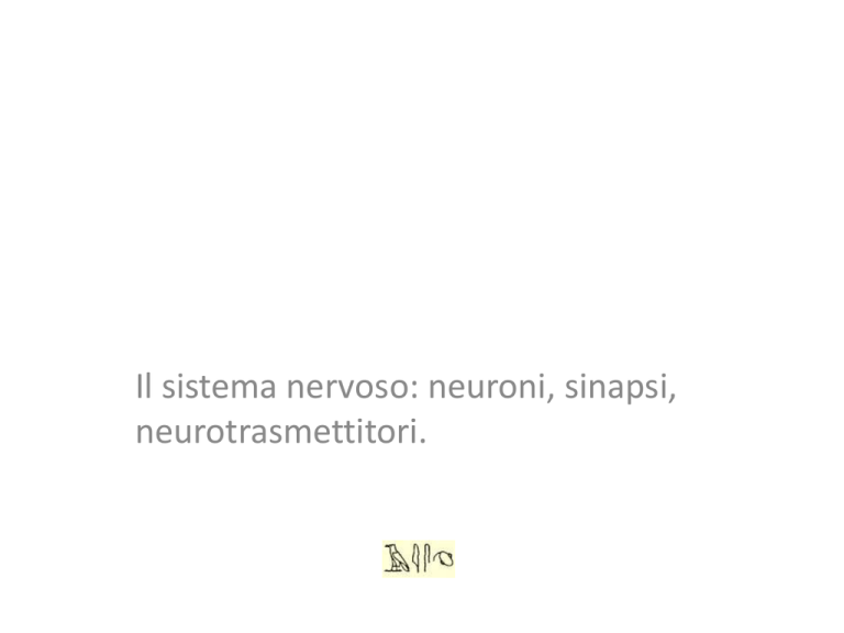 Il sistema nervoso: neuroni, sinapsi, neurotrasmettitori. Struttura e funzione del sistema nervoso Il sistema nervoso (1) riceve gli stimoli sensoriali attraverso i recettori sensoriali, (2) li integra, analizza ed elabora, e (3) trasmette la risposta agli organi effettori del corpo. Le cellule che svolgono queste funzioni sono i neuroni. neuroni – I neuroni sono cellule specializzate costituite da un corpo cellulare (che contiene il nucleo e gli organuli) e da lunghi sottili prolungamenti, chiamati fibre nervose. – L’encefalo umano contiene circa 100 miliardi di neuroni specializzati nel trasferire segnali da un punto all’altro del corpo. SNC e SNP 7 Sadava et al. Biologia.blu © Zanichelli editore, 2012 • Il sistema nervoso viene suddiviso in due parti: – sistema nervoso centrale (SNC): costituito dall’encefalo e, nei vertebrati, dal midollo spinale; integra ed elabora le risposte. – sistema nervoso periferico (SNP): formato essenzialmente dalle vie di comunicazione (i nervi) che ricevono i messaggi dagli organi di senso o li indirizzano agli organi effettori; il sistema periferico presenta i gangli, che raggruppano i corpi cellulari di neuroni. • L’acquisizione sensoriale, l’integrazione e lo stimolo motorio sono nel sistema nervoso funzioni strettamente interconnesse: Acquisizione sensoriale Integrazione Recettore sensoriale Stimolo motorio Encefalo e midollo spinale Effettore Sistema nervoso periferico (SNP) Sistema nervoso centrale (SNC) neuroni I neuroni sono le unità funzionali del sistema nervoso – La capacità dei neuroni di ricevere e trasmettere impulsi dipende dalla loro struttura. – La maggior parte degli organuli del neurone, compreso il nucleo, è localizzata nel corpo cellulare. – Dal corpo cellulare si estendono due tipi di prolungamenti, i dendriti (che sono numerosi) e l’assone (sempre unico). informazione polarizzata neuroni: categorie funzionali • Alle tre principali funzioni del sistema nervoso, corrispondono i tre tipi funzionali di neuroni: – i neuroni sensoriali: trasportano le informazioni dai recettori sensoriali verso il sistema nervoso centrale; – gli interneuroni: integrano i dati forniti dai neuroni sensoriali e poi trasmettono segnali appropriati ad altri interneuroni o neuroni motori; – i neuroni motori: trasmettono i messaggi provenienti dal sistema centrale alle cellule effettrici. • Un esempio di funzione del sistema nervoso è rappresentato dal circuito relativamente semplice che produce le risposte automatiche agli stimoli, o riflessi. 1 Recettore 2 Neurone sensoriale Encefalo Ganglio Midollo spinale Motoneurone 3 Muscolo quadricipite 4 Interneurone SNC Muscoli flessori Nervo SNP cellule della glia cellule della glia • Le cellule gliali o nevroglia, sono cellule che, assieme ai neuroni, costituiscono il sistema nervoso. Le cellule gliali costituiscono circa la metà della massa del sistema nervoso centrale. • Il numero di cellule della glia nel cervello supera di nove volte quello dei neuroni. cellule della glia • Hanno funzione nutritiva e di sostegno per i neuroni, assicurano l'isolamento dei tessuti nervosi e la protezione da corpi estranei in caso di lesioni. cellule della glia e guaine mieliniche • Oligodendrociti: Prima classe: sostanza grigia del SNC, funzioni coadiuvanti metaboliche. Seconda classe: sostanza bianca del SNC intercalata tra gli assoni, hanno il compito di rivestire gli assoni del sistema nervoso centrale con una sostanza lipidica chiamata mielina, producendo la cosiddetta guaina mielinica. • Cellule di Schwann: funzione simile a quella degli oligodendrociti formando la guaina mielinica degli assoni del SNP. Le difese immunitarie del paziente attaccano e danneggiano la guaina mielinica. Fattori ambientali e genetici non conosciuti probabili cause. Non esiste al momento una cura, solo farmaci che rallentano il decorso della malattia. Circa 2,5 milioni di persone ne sono attualmente affette. cellule di Schwann 23 Sadava et al. Biologia.blu © Zanichelli editore, 2012 – In molti animali gli assoni che trasportano rapidamente gli impulsi sono avvolti per gran parte della loro lunghezza da una sostanza isolante chiamata guaina mielinica, che ha l’aspetto di una collana costituita da perle di forma allungata: ogni «perla» è una cellula di Schwann. Cosa studiano le Neuroscienze? • Livello genetico: studio delle basi genetiche della funzione neuronale. • Livello sistemico: studio anatomico delle varie parti del sistema nervoso, e del il sistema visivo o quello uditivo. A questo livello si studiano anche le connessioni fra le varie parti del cervello. Cosa studiano le Neuroscienze? • Livello neuronale: studio delle funzioni e del contenuto dei singoli neuroni. A questo livello si studiano anche i neurotrasmettitori. • Livello sinaptico: studio delle sinapsi. • Livello dei circuiti locali: studio delle funzioni svolte da gruppi di neuroni (circuiti nervosi). • Livello di membrana: studio dei livelli di canali ionici della membrana cellulare di un neurone. Cosa studiano le Neuroscienze? • Livello comportamentale e cognitivo: studio delle basi neuronali del comportamento e della mente. In altre parole, perchè le persone e gli animali sono quel che sono e fanno quello che fanno. Phineas Gage (1823-1860) Phineas P. Gage è stato un operaio statunitense addetto alla costruzione di ferrovie. È conosciuto per essere diventato uno dei casi di studio più famosi in neurologia in seguito a un incidente sul lavoro avvenuto il 13 settembre 1848 a Cavendish, nel Vermont, mentre inseriva una carica esplosiva in una roccia che bloccava il passaggio della linea ferroviaria in costruzione. A causa dell'esplosione accidentale della polvere da sparo, il ferro di pigiatura che Gage stava usando per compattarla schizzò in aria attraversando la parte anteriore del suo cranio, provocando un forte trauma cerebrale ai lobi frontali del cervello. • Miracolosamente sopravvissuto all'incid