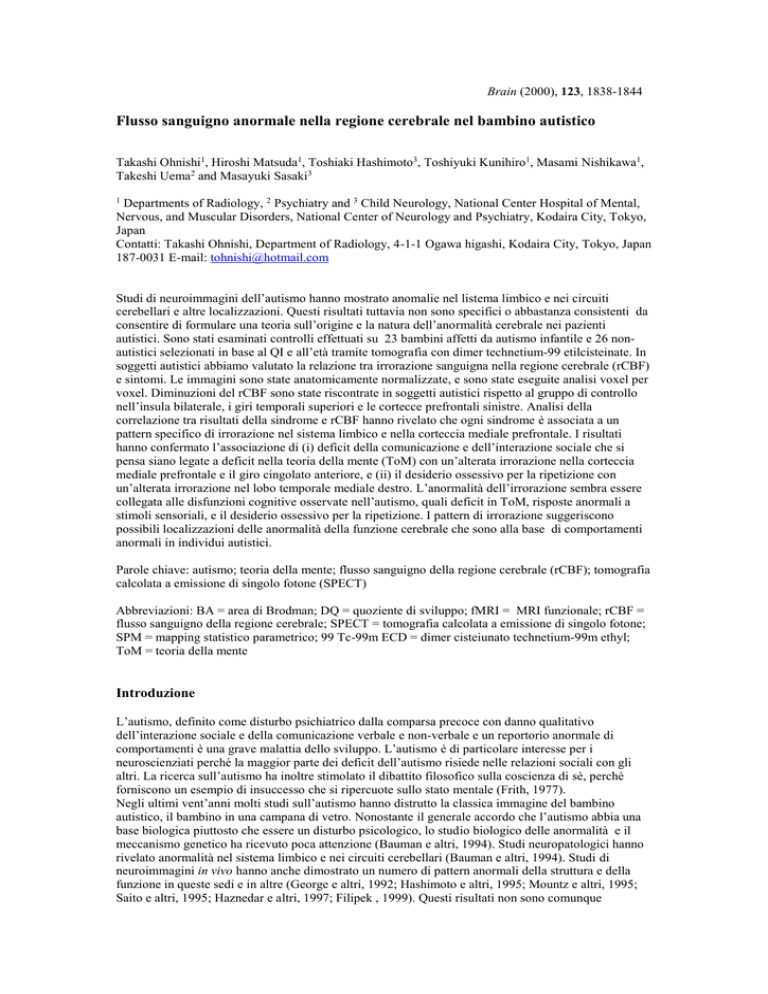 Brain (2000), 123, 1838-1844 Flusso sanguigno anormale nella regione cerebrale nel bambino autistico Takashi Ohnishi1, Hiroshi Matsuda1, Toshiaki Hashimoto3, Toshiyuki Kunihiro1, Masami Nishikawa1, Takeshi Uema2 and Masayuki Sasaki3 1 Departments of Radiology, 2 Psychiatry and 3 Child Neurology, National Center Hospital of Mental, Nervous, and Muscular Disorders, National Center of Neurology and Psychiatry, Kodaira City, Tokyo, Japan Contatti: Takashi Ohnishi, Department of Radiology, 4-1-1 Ogawa higashi, Kodaira City, Tokyo, Japan 187-0031 E-mail: [email protected] Studi di neuroimmagini dell’autismo hanno mostrato anomalie nel listema limbico e nei circuiti cerebellari e altre localizzazioni. Questi risultati tuttavia non sono specifici o abbastanza consistenti da consentire di formulare una teoria sull’origine e la natura dell’anormalità cerebrale nei pazienti autistici. Sono stati esaminati controlli effettuati su 23 bambini affetti da autismo infantile e 26 nonautistici selezionati in base al QI e all’età tramite tomografia con dimer technetium-99 etilcisteinate. In soggetti autistici abbiamo valutato la relazione tra irrorazione sanguigna nella regione cerebrale (rCBF) e sintomi. Le immagini sono state anatomicamente normalizzate, e sono state eseguite analisi voxel per voxel. Diminuzioni del rCBF sono state riscontrate in soggetti autistici rispetto al gruppo di controllo nell’insula bilaterale, i giri temporali superiori e le cortecce prefrontali sinistre. Analisi della correlazione tra risultati della sindrome e rCBF hanno rivelato che ogni sindrome è associata a un pattern specifico di irrorazione nel sistema limbico e nella corteccia mediale prefrontale. I risultati hanno confermato l’associazione di (i) deficit della comunicazione e dell’interazione sociale che si pensa siano legate a deficit nella teoria della mente (ToM) con un’alterata irrorazione nella corteccia mediale prefrontale e il giro cingolato anteriore, e (ii) il desiderio ossessivo per la ripetizione con un’alterata irrorazione nel lobo temporale mediale destro. L’anormalità dell’irrorazione sembra essere collegata alle disfunzioni cognitive osservate nell’autismo, quali deficit in ToM, risposte anormali a stimoli sensoriali, e il desiderio ossessivo per la ripetizione. I pattern di irrorazione suggeriscono possibili localizzazioni delle anormalità della funzione cerebrale che sono alla base di comportamenti anormali in individui autistici. Parole chiave: autismo; teoria della mente; flusso sanguigno della regione cerebrale (rCBF); tomografia calcolata a emissione di singolo fotone (SPECT) Abbreviazioni: BA = area di Brodman; DQ = quoziente di sviluppo; fMRI = MRI funzionale; rCBF = flusso sanguigno della regione cerebrale; SPECT = tomografia calcolata a emissione di singolo fotone; SPM = mapping statistico parametrico; 99 Tc-99m ECD = dimer cisteiunato technetium-99m ethyl; ToM = teoria della mente Introduzione L’autismo, definito come disturbo psichiatrico dalla comparsa precoce con danno qualitativo dell’interazione sociale e della comunicazione verbale e non-verbale e un reportorio anormale di comportamenti è una grave malattia dello sviluppo. L’autismo è di particolare interesse per i neuroscienziati perché la maggior parte dei deficit dell’autismo risiede nelle relazioni sociali con gli altri. La ricerca sull’autismo ha inoltre stimolato il dibattito filosofico sulla coscienza di sè, perché forniscono un esempio di insuccesso che si ripercuote sullo stato mentale (Frith, 1977). Negli ultimi vent’anni molti studi sull’autismo hanno distrutto la classica immagine del bambino autistico, il bambino in una campana di vetro. Nonostante il generale accordo che l’autismo abbia una base biologica piuttosto che essere un disturbo psicologico, lo studio biologico delle anormalità e il meccanismo genetico ha ricevuto poca attenzione (Bauman e altri, 1994). Studi neuropatologici hanno rivelato anormalità nel sistema limbico e nei circuiti cerebellari (Bauman e altri, 1994). Studi di neuroimmagini in vivo hanno anche dimostrato un numero di pattern anormali della struttura e della funzione in queste sedi e in altre (George e altri, 1992; Hashimoto e altri, 1995; Mountz e altri, 1995; Saito e altri, 1995; Haznedar e altri, 1997; Filipek , 1999). Questi risultati non sono comunque sufficientemente specifici o in linea tra loro per consentire la costruzione di una teoria coerente dell’origine e della natura dell’anormalità cerebrale nei pazienti autistici. In questo studio abbiamo utilizzato la tomografia a emissione di singolo protone (SPECT) con dimer technetiom-99m etilcisteinate (Tc-99m ECD) per misurare il flusso sanguigno nella regione cerebrale (rCBF) in pazienti con autismo infantile e in un gruppo di controllo di bambini non-autistici associati per età, sesso e QI. Per chiarire quali regioni del cervello contribuiscono al comportamento autistico, abbiamo anche studiato la relazione tra le variazioni di rCBF e i sintomi nei pazienti autistici. Metodi Allo studio hanno partecipato 23 bambini (19 maschi e 4 femmine) con autismo infantile e 26 bambini (21 maschi e 5 femmine) non-autistici con ritardo mentale. L’autismo infantile è stato diagnosticato secondo i criteri del DSM-IV (American Psychiatric Association, 1994). Abbiamo escluso i soggetti con le seguenti caratteristiche: (i) MRI anormale; (ii) attacchi persistenti; e (iii) malattie infettive, metaboliche o cromosomiche note. I pazienti non-autistici con ritardo mentale non avevano ricevuto una diagnosi e la causa della loro malattia non era conosciuta. L’età media di bambini autistici e nonautistici erano 6.5 anni (SD = 2.4, range 2.6-13) e 8.7 anni (SD = 3.2, range 3.4 – 12), rispettivamente. Il QI medio (misurato secondo il test Stanford-Binet) o quoziente di sviluppo (DQ) era 48 (SD=19.5) nel gruppo autistico e 57 (SD = 17.52) nel gruppo di controllo. L’età media e il QI o DQ del gruppo di