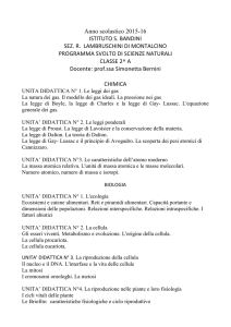Liceo Linguistico “Leonardo Da Vinci” di Civitanova Marche PROGRAMMA SVOLTO Classe 2a sez.K Indirizzo Linguistico Anno scolastico 2015-2016 Materia: Scienze UNITA’ DIDATTICA FORMATIVA 1: gli atomi, i legami e le reazioni Contenuti La struttura atomica. L’atomo di Rhutherford, l’atomo di boro. Teoria degli orbitali Numero atomico e numero di massa. La regola dell’ottetto La configurazione elettronica. I legami chimici. Le reazioni chimiche. Il bilanciamento. UNITA’ DIDATTICA FORMATIVA23: la chimica dell’acqua Contenuti Le proprietà chimiche della molecola di acqua. Il legame idrogeno e le proprietà fisiche dell’acqua. Le proprietà delle soluzioni acquose. Acidità. basicità e neutralità delle soluzioni. Il PH. UNITA’ DIDATTICA FORMATIVA 3: chimica organica e le biomolecole Contenuti Il Carbonio organico. Configurazione elettronica del C organico. Ibridizzazione del carbonio. Singolo, doppio e triplo legame. Gli idrocarburi(regole di nomenclatura e caratteristiche dei gruppi funzionali)i: alcani, alcheni e alchini. I cicloalcani. Gli isomeri. I gruppi funzionali dei principali composti organici (Alcoli, aldeidi, chetoni, acidi carbossilici ,eteri, esteri, ammine, ammidi, tioli). Monomeri e polimeri. Reazione di polimerizzazione(condensazione e addizione).I polimeri non biologici. Caratteristiche, struttura e funzioni dei carboidrati, mono,di e polisaccaridi. Caratteristiche, struttura e funzioni delle proteine e gli amminoacidi Il legame peptidico. Le quattro strutture delle proteine. La specificità di una proteina. Denaturazione. Caratteristiche, struttura e funzioni dei lipidi. Lipidi semplici e lipidi complessi (Steroidi).I carotenoidi e le vitamine. Le cere. Caratteristiche, struttura e funzioni degli acidi nucleici. DNA, RNA e ATP UNITA’ DIDATTICA FORMATIVA 4 : un viaggio dentro la cellula Contenuti La cellula unità elementare della vita. Dimensione, grandezze e forme delle cellule. Il microscopio ottico ed elettronico. Le cellule procariotiche e quelle eucariotiche. Caratteristiche delle cellule procariotiche e i batteri. Caratteristiche delle cellule eucariote .Cellula animale e vegetale. Organuli citoplasmatici Il nucleo e i ribosomi per l’informazione genetica Il sistema delle membrane interne(R.E.L. e R.E.R), Apparato di Golgi Gli organuli che trasformano l’energia(mitocondri e cloroplasti) I lisosomi. Citoscheletro, ciglia e flagelli Le strutture extracellulari e l’adesione tra le cellule UNITA’ DIDATTICA FORMATIVA 5 : la cellula al lavoro Struttura e funzione dell’ATP. Gli enzimi. Struttura generale delle membrane cellulari. Diffusione semplice e facilitata, l’osmosi, trasporti attivi. Fagocitosi ,pinocitosi, endocitosi mediata da recettori. Esocitosi. Spiegare il ruolo dell’ATP e le funzioni dei catalizzatori degli enzimi. Civitanova Marche ,03-06-2016 L’insegnante: Venditti Silvana Gli alunni ………………………………………….. ……………………………………………….