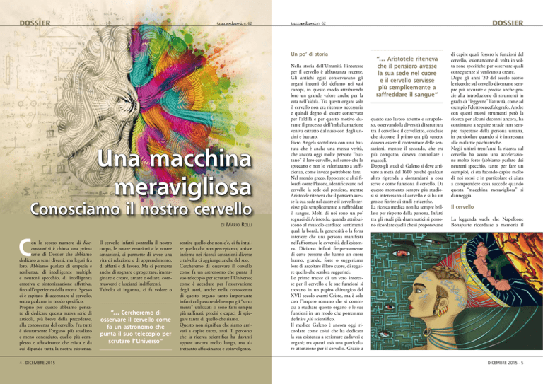 DOSSIER n. 62 Un po’ di storia Una macchina meravigliosa Conosciamo il nostro cervello DI C on lo scorso numero di Raccontami si è chiusa una prima serie di Dossier che abbiamo dedicato a temi diversi, ma legati fra loro. Abbiamo parlato di empatia e resilienza, di intelligenze multiple e neuroni specchio, di intelligenza emotiva e sintonizzazione affettiva, fino all’esperienza della morte. Spesso ci è capitato di accennare al cervello, senza parlarne in modo specifico. Proprio per questo abbiamo pensato di dedicare questa nuova serie di articoli, più breve della precedente, alla conoscenza del cervello. Fra tutti è sicuramente l’organo più studiato e meno conosciuto, quello più complesso e affascinante che esista e da cui dipende tutta la nostra esistenza. 4 - DICEMBRE 2015 Il cervello infatti controlla il nostro corpo, le nostre emozioni e le nostre sensazioni, ci permette di avere una vita di relazione e di apprendimento, di affetti e di lavoro. Ma ci permette anche di sognare e progettare, immaginare e creare, amare e odiare, commuoverci e lasciarci indifferenti. Talvolta ci inganna, ci fa vedere o “... Cercheremo di osservare il cervello come fa un astronomo che punta il suo telecopio per scrutare l’Universo” MARIO ROLLI sentire quello che non c’è, ci fa intuire quello che non percepiamo, unisce insieme nei ricordi sensazioni diverse e talvolta ci aggiunge anche del suo. Cercheremo di osservare il cervello come fa un astronomo che punta il suo telecopio per scrutare l’Universo; come è accaduto per l’osservazione degli astri, anche nella conoscenza di questo organo tanto importante infatti col passare del tempo gli “strumenti” utilizzati si sono fatti sempre più raffinati, precisi e capaci di spiegare tanto di quello che siamo. Questo non significa che siamo arrivati a capire tutto, anzi. Il percorso che la ricerca scientifica ha davanti appare ancora molto lungo, ma altrettanto affascinante e coinvolgente. DOSSIER n. 62 Nella storia dell’Umanità l’interesse per il cervello è abbastanza recente. Gli antichi egizi conservavano gli organi interni del defunto nei vasi canopi, in questo modo attribuendo loro un grande valore anche per la vita nell’aldilà. Tra questi organi solo il cervello non era ritenuto necessario e quindi degno di essere conservato per l’aldilà e per questo motivo durante il processo dell’imbalsamazione veniva estratto dal naso con degli uncini e buttato. Piero Angela sottolinea con una battuta che è anche una mezza verità, che ancora oggi molte persone “buttano” il loro cervello, nel senso che lo sprecano e non lo valorizzano a sufficienza, come invece potrebbero fare. Nel mondo greco, Ippocrate e altri filosofi come Platone, identificavano nel cervello la sede del pensiero, mentre Aristotele riteneva che il pensiero avesse la sua sede nel cuore e il cervello servisse più semplicemente a raffreddare il sangue. Molti di noi sono un po’ seguaci di Aristotele, quando attribuiscono al muscolo cardiaco sentimenti quali la bontà, la generosità o la forza interiore che una persona manifesta nell’affrontare le avversità dell’esistenza. Diciamo infatti frequentemente di certe persone che hanno un cuore buono, grande, forte o suggeriamo loro di ascoltare il loro cuore, di seguire quello che sembra suggerirci. Le prime tracce di un vero interesse per il cervello e le sue funzioni si trovano in un papiro chirurgico del XVII secolo avanti Cristo, ma è solo con l’impero romano che si comincia a studiare questo organo e le sue funzioni in un modo che potremmo definire più scientifico. Il medico Galeno è ancora oggi ricordato come colui che ha dedicato la sua esistenza a sezionare cadaveri e organi; tra questi usò una particolare attenzione per il cervello. Grazie a “... Aristotele riteneva che il pensiero avesse la sua sede nel cuore e il cervello servisse più semplicemente a raffreddare il sangue” questo suo lavoro attento e scrupoloso, osservando la diversità di struttura tra il cervello e il cervelletto, concluse che siccome il primo era più tenero, doveva essere il contenitore delle sensazioni, mentre il secondo, che era più compatto, doveva controllare i muscoli. Dopo gli studi di Galeno si deve arrivare a metà del 1600 perché qualcun altro riprenda a domandarsi a cosa serve e come funziona il cervello. Da questo momento sempre più studiosi si interessano al cervello e si ha un grosso fiorire di studi e ricerche. La ricerca medica non ha sempre brillato per rispetto della persona. Infatti tra gli studi più drammatici si possono ricordare quelli che si proponevano di capire quali fossero le funzioni del cervello, lesionandone di volta in volta zone specifiche per osservare quali conseguenze si venivano a creare. Dopo gli anni ’30 del secolo scorso le ricerche sul cervello diventano sempre più accurate e precise anche grazie alla introduzione di strumenti in grado di “leggerne” l’attività, come ad esempio l’elettroencefalografo. Anche con questi nuovi strumenti però la ricerca per alcuni decenni ancora, ha continuato a seguire strade non sempre rispettose della persona umana, in particolare quando si è interessata alle malattie psichiatriche. Negli ultimi trent’anni la ricerca sul cervello ha avuto una accelerazione molto forte (abbiamo parlato dei neuroni specchio, tanto per fare un esempio), ci sta facendo capire molto di noi stessi e in particolare ci aiuta a comprendere cosa succede quando questa “macchina meravigliosa” si danneggia. Il cervello La leggenda vuole che Napoleone Bonaparte ricordasse a memoria il DICEMBRE 2015 - 5 DOSSIER nome di migliaia di soldati del suo esercito. Arturo Toscanini conosceva nota per nota, e per ciascuno strumento dell’orchestra, le 100 opere e le 250 sinfonie del suo repertorio. Pur essendo considerato l’emblema delle personalità geniali, Albert Einstein, come annota Emilio Segrè, non era particolarmente brillante a scuola. Fra quelli ch