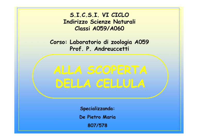 S.I.C.S.I. VI CICLO Indirizzo Scienze Naturali Classi A059/A060 Corso: Laboratorio di zoologia A059 Prof. P. Andreuccetti ALLA SCOPERTA DELLA CELLULA Specializzanda: De Pietro Maria 807/578 DESTINATARI: allievi di I classe di scuola secondaria inferiore. inferiore PREREQUISITI Idee generali relative a: 1. distinzione tra viventi e non viventi; 2. animali e vegetali; Unità di misura. OBIETTIVI Conoscenze:: Conoscenze Sapere che la cellula è l’unità fondamentale dei viventi; Saper spiegare la struttura di una cellula; Saper individuare d d lle d differenze ff tra cellula ll l animale l e vegetale; l Conoscere la funzione dei principali organelli cellulari; Sapere che gli organismi pluricellulari possiedono cellule organizzate i ttessuti, in ti organi, i apparati. ti Abilità pratiche: pratiche: Utilizzo del microscopio; Preparazione dei campioni da osservare; Realizzazione di disegni raffiguranti cellule animali e vegetali. METODI: lezione frontale, discussione guidata, lavori di gruppo e individuali, attività sperimentali. STRUMENTI DIDATTICI: libro di testo, mappe concettuali, ausili informatici. ATTREZZATURE E MATERIALE NECESSARIO: Almeno un microscopio ottico (con cavo di collegamento alla TV o al PC); TV o PC. Materiale da laboratorio (vetrini, pinzette, lame, pipette, ecc). Materiale vegetale (di più facile reperibilità). TEMPI: circa 8 ore di lezione. VERIFICA: VER F C verifica f orale l individuale; d d l verifica f scritta mediante d test ““misti”” (con domande sia a risposta multipla che aperta). Metodologie 9Lezioni frontali ed interattive 9Strumenti multimediali 9Attività laboratoriali 9Lavori di g gruppo pp Modalità di verifica e Valutazione Attività laboratoriali 9Saper utilizzare il microscopio ottico 9Osservazione delle cellule epiteliate di una foglia di Elodea 9Osservazione delle cellule della mucosa della bocca, al microscopio ottico 9Osservazione di uno striscio di yogurt Obiettivi possibili da raggiungere •La precisione nell nell’osservare osservare e raccogliere dati. •Far collaborare mano, occhio, mente •Far usare il disegno come verifica Verifica V f della d ll comprensione d dei contenuti e delle abilità mediante prova orale, prova strutturata e prova pratica •valutazione iniziale per l’accertamento dei prerequisiti cognitivi e affettivomotivazionali degli allievi allievi. Sulla base dei dati raccolti si può procedere ad un recupero; •una valutazione intermedia formativa per identificare, in itinere, l’apprendimento e le lacune dei singoli, in modo da adeguare la proposta didattica alle esigenze verificate. Verranno effettuati interventi di recupero e di sostegno, individualizzati, nd v dual zzat , per piccoli p ccol gruppi e collettivi per la compensazione delle difficoltà di apprendimento; per il •una valutazione sommativa p controllo finale del rendimento complessivo degli allievi. Lezione introduttiva: Dal macroscopico al microscopico. microscopico ANIMALI - VEGETALI Hyles lineata Quercus agrifolia La differenza tra una farfalla f f ll e una quercia è del tutto evidente….. evidente …ma… animale o vegetale? • • Anthopleura xanthogrammica anemone di mare Chrysanthemum sp. vegetale o animale? Corallium rubrum – corallo rosso (Cnidari) Sorbaria altaica rosacee Sembra che le differenze siano meno evidenti. T tt i Tuttavia….. (Discussione guidata con insegnante) Osservazione ad occhio nudo Come ci appare? d verde allungata stretta liscia L osservazione ad occhio nudo non L’osservazione permette di distinguere particolari più fini. (Esperimento fatto dall’insegnante) Spelliamo la foglia Osserviamo al microscopio ottico la “pelle” pelle della foglia Epidermide superiore Epidermide inferiore …il microscopio rende visibili cose che a occhio nudo non si vedono! Cosa si vede ad occhio nudo? Riusciamo a distinguere al massimo la decima parte del millimetro. millimetro Se vogliamo osservare i dettagli di un oggetto lo avviciniamo agli occhi oppure utilizziamo una lente di ingrandimento. ingrandimento Ma la semplice lente non dà più di circa 10 ingrandimenti. ingrandimenti Il microscopio ottico può ingrandire fino a 1000 volte! strumento che utilizza un sistema di lenti per ingrandire gli oggetti. parte principale è un tubo con due lenti poste alle due estremità: la lente in alto si chiama oculare oculare, mentre quella opposta pp si chiama obiettivo obiettivo. tre o quattro obiettivi sono avvitati a un disco che può ruotare. ingrandimento g totale = p prodotto del numero scritto sull'oculare per quello scritto sull'obiettivo. esempio (10X) · (40X) = 400 Ingrandimento oculare Ingrandimento obiettivo Ingrandimento totale Il microscopio Ill primo insostituibile b l strumento di d osservazione per chi h si accosta allo studio della cellula è il microscopio. Oculare Tubo metallico che contiene la parte ottica Di solito, montati su un disco rotante, o revolver, ci sono tre obiettivi con tre diverse possibilità di ingrandimento Condensatore e diaframma, per concentrare t la l luce l e regolare l l’illuminazione, montati insieme sotto al tavolino Lampadina Lampa na pper illuminare um il preparato Il MICROSCOPIO OTTICO è formato da una parte meccanica che contiene anche l’apparato di illuminazione. La parte meccanica fa da supporto a quella ottica, che comprende i due sistemi di lenti dell’oculare e dell’obiettivo Stativo o braccio Piano portaoggetti o tavolino: con un foro per il passaggio della luce; sul tavolino viene posto il vetrino con il preparato, cioè il campione da osservare. Vite macrometrica (grande) e vite it macrometrica t i ( iù piccola) (più i l ) per la messa a fuoco: la prima per una regolazione grossolana, la seconda per una regolazione più fine. Base a dello stativo tat Impariamo a riconoscere la varie parti del microscopio p e a utilizzarlo • individuare l’oculare e, alla sua estremità, il disco o revolver, con in genere tre obiettivi a diverso ingrandimento. Sull’ocula
