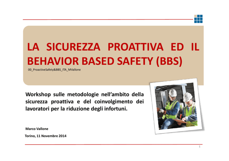 LA SICUREZZA PROATTIVA ED IL BEHAVIOR BASED SAFETY (BBS) 00_ProactiveSafety&BBS_ITA_MVallone Workshop sulle metodologie nell’ambito della sicurezza proattiva e del coinvolgimento dei lavoratori per la riduzione degli infortuni. Marco Vallone Torino, 11 Novembre 2014 1 0. Sommario La presentazione che segue si propone di introdurre il tema della cultura per la sicurezza in azienda e di presentare l’esperienza applicativa di uno strumento che contribuisce al suo sviluppo e consolidamento: il Programma Behavior Based Safety per la sicurezza comportamentale. Il lavoro si compone delle seguenti parti: 1. La cultura della sicurezza del lavoro 2. La cultura della sicurezza del lavoro proattiva 3. Alcuni strumenti per la sicurezza proattiva 4. La Sicurezza Comportamentale - Il BBS 5. Gli indicatori BBS 6. Il BBS ed il SGS - Cenni 7. Conclusioni 2 1. La cultura della sicurezza del lavoro Il sistema di gestione partecipata del rischio previsto dal D.Lgs. 81/08 considera il coinvolgimento dei lavoratori uno strumento indispensabile per la diffusione di una cultura della salute e sicurezza sul lavoro. Il T.U. pone in particolare rilievo alcuni aspetti fondamentali per il miglioramento delle condizioni di salute e sicurezza negli ambienti di lavoro tra i quali l’organizzazione del sistema di prevenzione impostato secondo i criteri dei sistemi di gestione e controllo del rischio (con verifica periodica dell’applicazione e dell’efficacia delle procedure adottate) piuttosto che i processi di informazione, formazione ed addestramento dei lavoratori. E’ essenziale, allo stesso modo, la partecipazione e collaborazione di tutte le figure del sistema sicurezza, a partire dai lavoratori, che sono chiamati a svolgere un ruolo attivo nella prevenzione. 3 1. La cultura della sicurezza del lavoro Le responsabilità e gli adempimenti stabilite dalla norma ed in carico ai diversi soggetti si attuano talvolta in modo meramente formale con un conseguente dispendio di risorse ma a cui non sempre corrisponde il raggiungimento di efficaci risultati di prevenzione e protezione. Per centrare interamente l’obiettivo sicurezza occorrere anche tener conto, in modo adeguato, degli aspetti culturali della normativa, creando le condizioni per la diffusione di una cultura della salute e sicurezza che porti tutti i soggetti coinvolti “al di là” del formale adempimento di un obbligo di legge. Assumono perciò un ruolo fondamentale l'informazione, la formazione, la consultazione e la partecipazione dei lavoratori: aspetti di natura prevalentemente culturale un tempo poco valorizzati o comunque ritenuti secondari e che oggi assumono un sempre più maggiore rilievo. 4 1. La cultura della sicurezza del lavoro Dunque, in concreto, che cos’è la cultura della sicurezza del lavoro? La definizione di cultura nelle scienze sociali è da sempre alla base di complessi dibattiti: i diversi significati ad essa attribuiti, infatti, non solo esprimono una diversa visione del concetto in sé, ma riflettono anche una differente visione della realtà delle cose. Le aziende, imprese ed organizzazioni in genere sono sistemi sociali complessi, sviluppati per raggiungere obiettivi specifici attraverso la messa in comune e la gestione organizzata di risorse, conoscenze e lavoro. Partendo dalla “cultura organizzativa”, essa è l’insieme di assunti fondamentali, valori, idee, opinioni, conoscenze e modi di pensare che sono condivisi dai membri di un’organizzazione. Ogni organizzazione, se vogliamo, ha un suo stile. Le prestazioni ed i comportamenti di un individuo, ovvero il suo contributo in azienda, non possono essere totalmente compresi o modificati se non vengono ricondotti alla cultura dell’organizzazione entro cui opera. 5 1. La cultura della sicurezza del lavoro Per acquisire una effettiva cultura della sicurezza è necessario incidere su atteggiamenti e comportamenti che dipendono da molti fattori. Infatti, anche per la sicurezza, i fattori culturali individuali si fondano sull’immagine di sé che le persone si sono costruite nel tempo, su valori socialmente radicati e su quelli perseguiti nella propria organizzazione. Anzitutto la cultura che le persone già posseggono manifesta sempre una resistenza ad essere cambiata. Per tutti è difficile cambiare idee, abitudini, opinioni. Le difese al cambiamento si possono innescare in modi diversi: - la negazione del rischio (“non è vero, ti sbagli …”), le attribuzioni (“non è un mio compito”), la reattività (“adesso ti faccio vedere che sbagli”), il fatalismo (“tanto se deve capitare capita!”), la squalifica dell’interlocutore (“chi sei tu per dirmi …”). 6 1. La cultura della sicurezza del lavoro Creare e sviluppare una cultura della sicurezza tra i lavoratori in azienda significa che le performance individuali per la sicurezza non vengano percepite come un obbligo imposto dall’organizzazione ma sia il naturale risultato dell’assunzione che la sicurezza è un valore che orienta scelte e la condotta individuale. Inserire la sicurezza tra i valori dichiarati nel codice etico dell’azienda, conseguire certificazioni sulla sicurezza e definire una struttura deputata al controllo interno del rispetto delle norme rappresentano condizioni necessarie ma non sufficienti a diffondere in modo ampio, profondo e duraturo una effettiva cultura della sicurezza. … Indossare i DPI perché si è convinti della loro utilità e non per evitare il richiamo del proprio capo. … Assumersi l’impegno di influenzare il collega perché adotti comportamenti più sicuri, piuttosto che evitare il confronto nella convinzione che ciascuno sia responsabile delle proprie azioni. 7 1. La cultura della sicurezza del lavoro Occorre quindi indirizzare le performance ed i comportamenti da modalità coercitive, volute dall'alto, in una esigenza per lavorare meglio, ovvero nel modo migliore, con l’imprescindibile supporto della “Sicurezza”, non ostacolo ma aiuto. In q