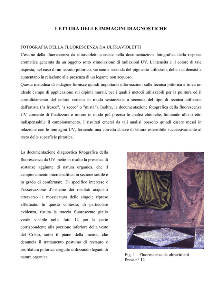 LETTURA DELLE IMMAGINI DIAGNOSTICHE FOTOGRAFIA DELLA FLUORESCENZA DA ULTRAVIOLETTI L'esame della fluorescenza da ultravioletti consiste nella documentazione fotografica della risposta cromatica generata da un oggetto sotto stimolazione di radiazioni UV. L'intensità e il colore di tale risposta, nel caso di un tessuto pittorico, variano a seconda del pigmento utilizzato, della sua densità e aumentano in relazione alla presenza di un legante non acquoso. Questa metodica di indagine fornisce quindi importanti informazioni sulla tecnica pittorica e trova un ideale campo di applicazione sui dipinti murali, per i quali i metodi utilizzabili per la pulitura ed il consolidamento del colore variano in modo sostanziale a seconda del tipo di tecnica utilizzata dall'artista ("a fresco", "a secco" o "mista"). Inoltre, la documentazione fotografica della fluorescenza UV consente di finalizzare e mirare in modo più preciso le analisi chimiche, limitando allo stretto indispensabile il campionamento. I risultati emersi da tali analisi possono quindi essere messi in relazione con le immagini UV, fornendo una corretta chiave di lettura estensibile successivamente al resto della superficie pittorica. La documentazione diagnostica fotografica della fluorescenza da UV mette in risalto la presenza di sostanze aggiunte di natura organica, che il campionamento microanalitico in sezione sottile è in grado di confermare. Di specifico interesse è l’osservazione d’insieme dei risultati acquisiti attraverso la mosaicatura delle singole riprese effettuate. In questo contesto, di particolare evidenza, risulta la traccia fluorescente giallo verde visibile nella foto 12 per la parte corrispondente alla porzione inferiore della veste del Cristo, sotto il piano della mensa, che denuncia il trattamento postumo di restauro e profilatura pittorica eseguito utilizzando leganti di natura organica. Fig. 1 – Fluorescenza da ultravioletti Presa n° 12 Analogamente, pur con una minore espressione fluorescente, possono valutarsi i manti azzurri di S. Pietro e dello stesso Cristo, nonché la veste azzurra del terzo apostolo da destra. Presenze organiche imputabili ad aree di rifacimento sono visibili nel pavimento a rombi e riquadri e per la parti architettoniche documentate nelle foto 25, 26, 27, 28 e 29. In quest’ultima immagine (foto n. 29) sono ben evidenziate le tracce fluorescenti sulla base della parasta, sul balaustrino e sulla cimasa della balconata; la presenza di leganti organici utilizzati nella tecnica originaria (particolarmente evidente nel tassello di pulitura) sono altresì evidenti nelle scanalature della lesena, che appare invece totalmente non fluorescente nell’area di rifacimento. Fig. 2 - Fluorescenza da ultravioletti Presa n°27 Fig. 3 - Fluorescenza da ultravioletti Presa n° 29 Analogamente possiamo valutare la presenza di aree originariamente fluorescenti nelle stesure a forti lumeggiature bianche di alcune veste degli apostoli e di alcuni accenti di luce conferiti pittoricamente sugli oggetti della mensa e in parte, ma con minore incidenza a tonalità discontinua, per presenza di sporco e lacune di colore visibili sulla stessa tovaglia. Il fenomeno è inoltre visibile su altri particolari (sia pure in maniera meno estesa rispetto a quelli precedentemente descritti) fra cui si segnalano le diversità apprezzabili soprattutto nel confronto diretto fra le porzioni integre e le lacune di colore, queste ultime caratterizzate dalla totale assenza di fluorescenza. Fra gli esempi più manifesti si veda la testa di S. Pietro con ampie zone di riprese pittoriche. FOTOGRAFIA AD INFRAROSSI IN FALSO COLORE L'esame fotografico ad IR in falso colore ha un ruolo del tutto particolare rispetto alle altre indagini nel campo degli infrarossi. Esso permette in modo molto efficace di visualizzare l'eterogeneità dei materiali diversificando ogni minima differenza cromatica tra i pigmenti. Queste peculiari potenzialità, unite alle più generali caratteristiche delle tecniche agli infrarossi (penetrazione ottica), fanno di quest'esame un prezioso strumento conoscitivo. In particolare, la sua applicazione è strettamente complementare all'esame della fluorescenza da ultravioletti nella ricerca degli interventi di restauro, delle ridipinture e delle alterazioni fisiche e cromatiche del film pittorico, nonché a fornire indicazioni qualitative sul riconoscimento dei pigmenti. La documentazione prodotta conferma l’analisi della fluorescenza ad UV con colori anomali ben apprezzabili nella restituzione a falsi colori IR. Particolarmente evidente la estesa ragnatela di graffiature e piccole mancanze o cadute di colore. I tracciati rosati e bruno rosati, nonché ocra gialla scura, denotano l’esistenza di ridipinture che sono peraltro evidenziate anche da un profilo pittorico più grossolano ed abbozzato del ductus rispetto al tratto elegante della pittura originale. Da notare anche la ripresa pittorica sulle stuccature delle lesioni (ad esempio, il particolare di Giuda nella foto IR 13). Di specifico interesse l’osservazione di particolari della tecnica pittorica, quali lo spolvero, che appaiono all’infrarosso fotografico ben apprezzabili rispetto al visibile. Una chiara tavolozza dei colori utilizzati ad integrazione e/o ridipinture sono osservabili nella foto n. 28 che documenta l’area di rifacimento del soffitto a cassettoni e del fregio che decora l’architrave. Fig. 4 - Fotografia a infrarossi in falso colore Presa n°13. Giuda Fig. 5 - Fotografia a infrarossi in falso colore Presa n°28 FOTOGRAFIA A LUCE RADENTE Questo esame consiste nella ripresa fotografica di dettagli illuminati da una sorgente di luce posta in posizione tangente rispetto alla superficie, allo scopo di fornire la documentazione "esasperata" delle caratteristiche morfologiche del tessuto pittorico e del supporto. Le fotografie a luce radente sulle pitture murali consentono l'esemplificazione di dati importanti relativi allo stato di con