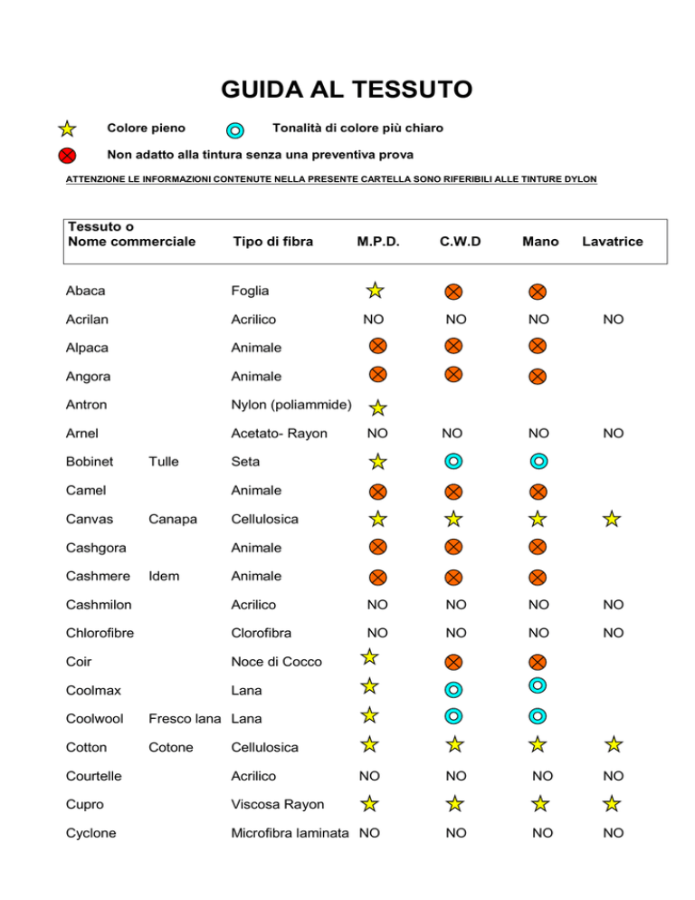 GUIDA AL TESSUTO Colore pieno Tonalità di colore più chiaro Non adatto alla tintura senza una preventiva prova ATTENZIONE LE INFORMAZIONI CONTENUTE NELLA PRESENTE CARTELLA SONO RIFERIBILI ALLE TINTURE DYLON Tessuto o Nome commerciale Tipo di fibra Abaca Foglia Acrilan Acrilico Alpaca Animale Angora Animale Antron Nylon (poliammide) Arnel Acetato- Rayon Bobinet Tulle Camel Canvas C.W.D Mano Lavatrice NO NO NO NO NO NO NO NO Seta Animale Canapa Cashgora Cashmere M.P.D. Cellulosica Animale Idem Animale Cashmilon Acrilico NO NO NO NO Chlorofibre Clorofibra NO NO NO NO Coir Noce di Cocco Coolmax Lana Coolwool Fresco lana Lana Cotton Cotone NO NO NO NO NO NO NO Cellulosica Courtelle Acrilico Cupro Viscosa Rayon Cyclone Microfibra laminata NO Tessuto o Nome commerciale Tipo di fibra M.P.D. C.W.D Mano Dacron Poliestere NO NO NO NO Dicel Acetato- Rayon NO NO NO NO Diclan Poliestere NO NO NO NO Diolen Poliestere NO NO NO NO Dolan Acrilico NO NO NO NO Dorix Nylon (poliammide) Dralon Acrilico NO NO NO NO NO NO NO NO NO NO NO NO Duchesse Durafil Viscosa- Rayon Dynel PVC Elastane Poliuretano Elastodiene Poliuretano Elaston Viscosa- Rayon Enka Viscosa- Rayon Excel Nylon- Poliammide Felt Lana Flax Lino Lavatrice Corteccia o Gambo Flowool Lana Fibravil/Fibran PVC NO NO NO NO Fibreglass Fibra di vetro NO NO NO NO Fleece 1. Lana NO NO NO NO 2. Plastica Fur Glass Fibre Pelliccia Animale Minerale Goat Hair (Angora goats) Animale Tessuto o Nome commerciale Tipo di fibra Goretex Microfibra Laminata NO Hair Capelli M.P.D. C.W.D Mano Lavatrice NO NO NO NO NO NO NO Animale Helanca Nylon/Poliestere Hemp Canapa corda Corteccia Gambo Henequen Foglia Hessian Tela di canapa Corteccia – Gambo Hytrel Poliestere Juta Juta Corteccia – Gambo Kapok Capoc Cellulosica Kashmir Animale Kenaf Corteccia – Gambo Kermel Fibra di carbone NO NO NO NO Kevlar Fibra di carbone NO NO NO NO Latex Gomma NO NO NO NO Leacril Acrilica NO NO NO NO Animale NO NO NO NO PAC NO NO NO NO NO NO NO NO Leather Pelle Leavil Linen Lino Corteccia – Gambo Lycra Poliuretano Lyocell/Tencel Viscosa-Rayon Merino Animale Lana Merkalon Poliuretano Meryl Viscosa Micrell Poliestere Modal Viscosa – Rayon Tessuto o Nome commerciale Tipo di fibra M.P.D. C.W.D Mano Modacrylic Acrilica NO NO NO NO NO NO NO NO NO NO NO NO NO NO NO NO NO NO NO NO 2. Acetato NO NO NO NO Acetato Rayon NO NO NO NO Mohair Idem Animale Nettle Ortica Corteccia – Gambo Nomex Fibra di carbone Nylon Poliammide Organza/Organdi se Cotone Orlon Acrilico Paper Carta Lavatrice Cellulosica Perlon Nylon Poliammide Pes Sintetico Polar Plastica Polyamide Nylon Poly/cotton Misto Poly/viscose Misto Polyethylene Polietilene Polynosic Cellulosica Polypropylene Polipropilene Polyurethane Poliuretano PVC Sintetico Rabbit Hair Coniglio Angora Animale Raffia Idem Foglia di palma Ramie Corteccia – Gambo Rayon 1. Viscosa Rhodia Tessuto o Nome commerciale Tipo di fibra Sarille Viscosa – Rayon Satin Dipende dalla fibra che contiene Silene Acetato Silk Seta Animale Sisal Agave Foglia Spandex Poliuretano Sunn Corteccia – Gambo Supplex Nylon Poliammide Tactel Nylon Poliammide M.P.D. NO C.W.D Mano Lavatrice NO NO NO Taffeta Tencel Viscosa – Rayon Teralenka Poliestere NO NO NO NO Tergal Poliestere NO NO NO NO Terital Poliestere NO NO NO NO Terlenka Poliestere NO NO NO NO Terylene Poliestere NO NO NO NO Trevira Poliestere NO NO NO NO Triacetate Acetato – Rayon NO NO NO NO Tricel Acetato – Rayon NO NO NO NO Tulle Seta Urena Corteccia – Gambo Velvet Velluto 1. Cotone 2. Seta Vicuna Viloft Vigogna Animale Viscosa – Rayon Tessuto o Nome commerciale Tipo di fibra Viscose Viscosa – Rayon Vincel Viscosa –Rayon Wool Lana Colore pieno M.P.D. C.W.D Mano Lavatrice Animale Tonalità di colore più chiaro Non adatto alla tintura senza una preventiva prova ATTENZIONE LE INFORMAZIONI CONTENUTE NELLA PRESENTE CARTELLA SONO RIFERIBILI ALLE TINTURE DYLON MICROFIBRE CATEGORIA ACRILICO NOME COMMERCIALE TINTURA DRALON TEXTILFASER NESSUNA MYOLISS CELLULOSICA POLIAMMIDE LYOCELL TUTTA LA MODAL SERIE DIABLO M.P.D. LIION COCO LILION MULTI MERYL MICRO SUPPLEX TACTEL POLIESTERE BILTEX MICRO NESSUNA DICLAN MICRO DIOLER MICRO FINESSE MICRELL TERITAL MICRO SETILA MICRO Attenzione: le indicazioni fornite nella tabella sono riferibili ai prodotti a marchio DYLON